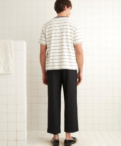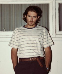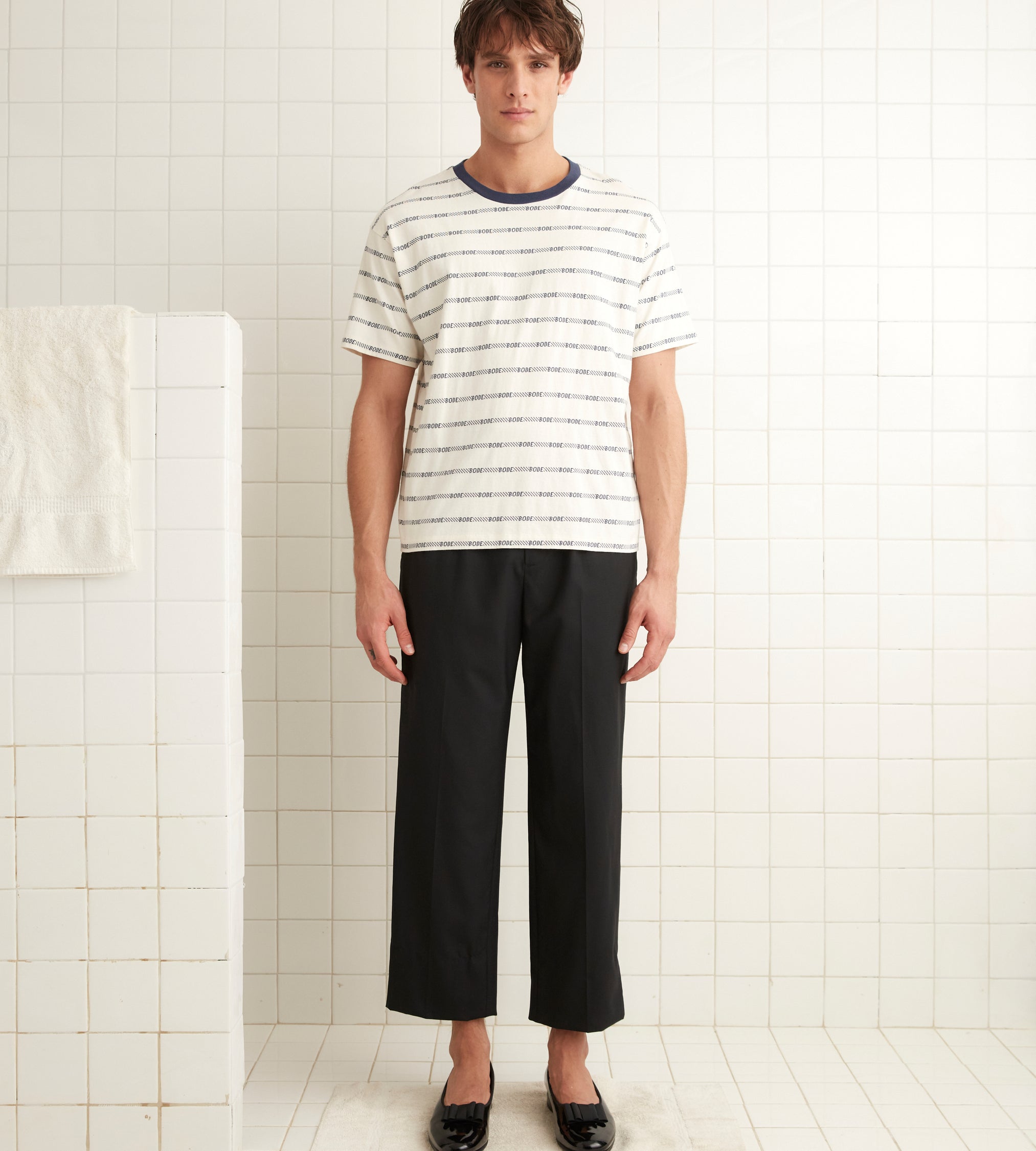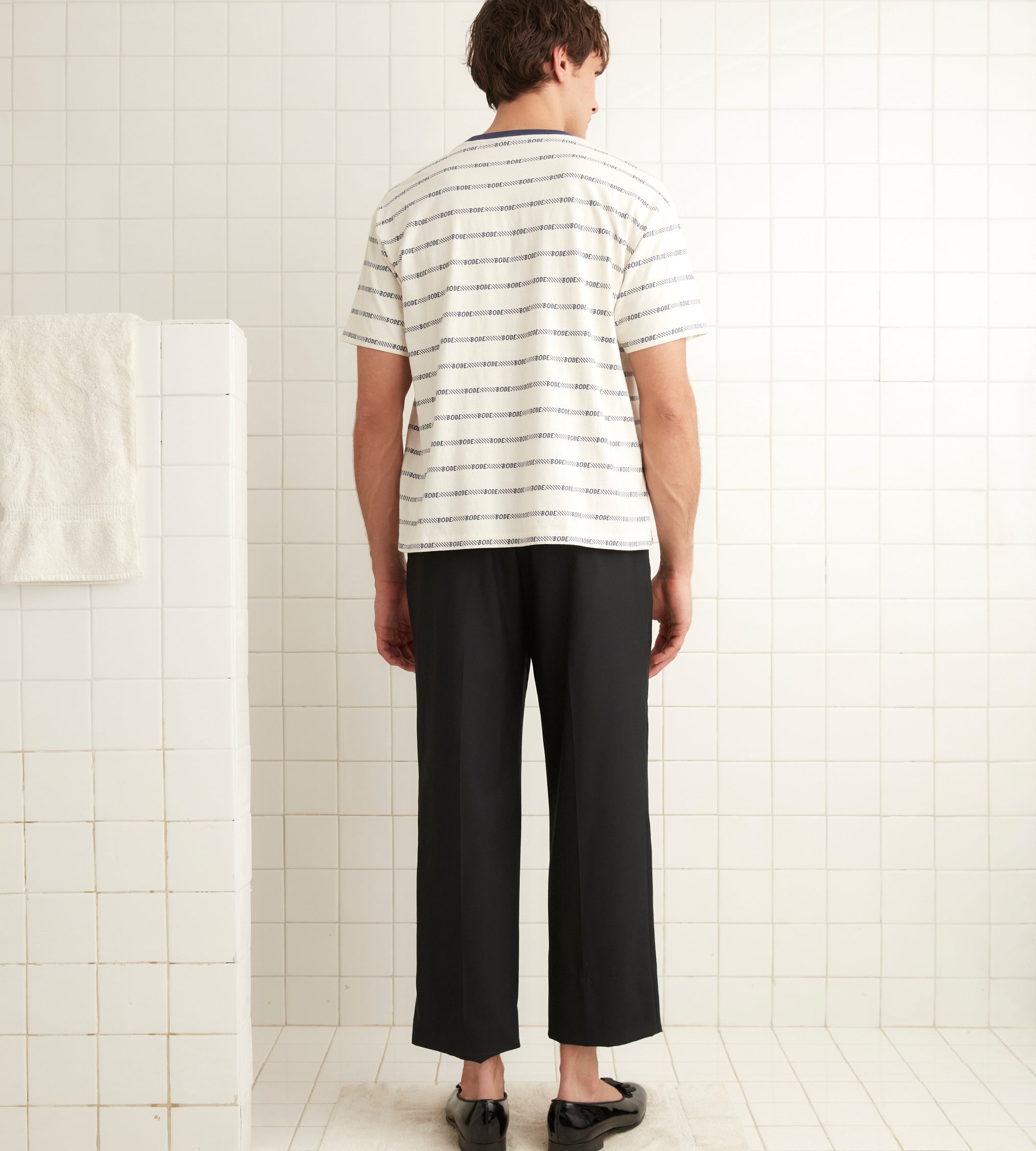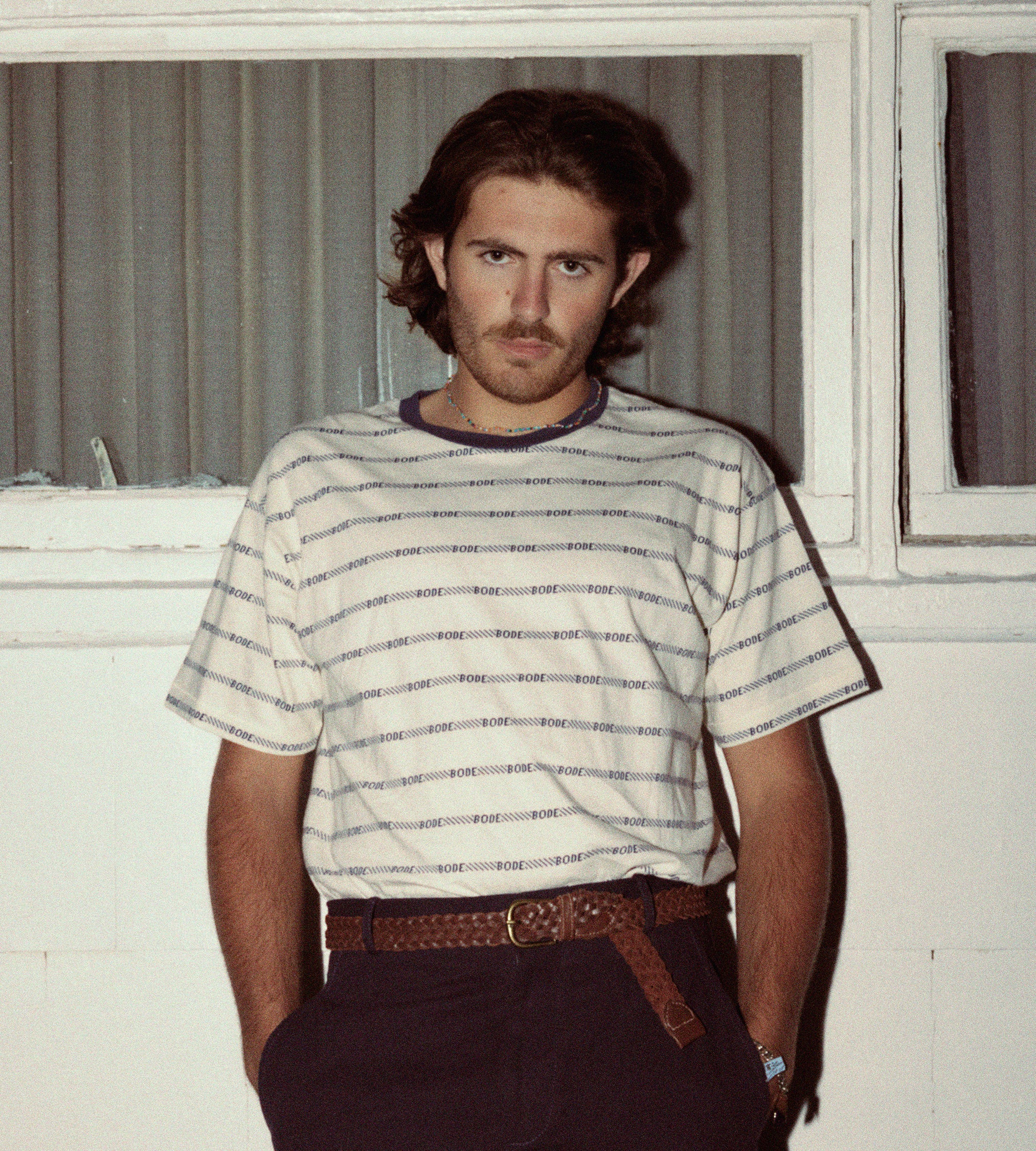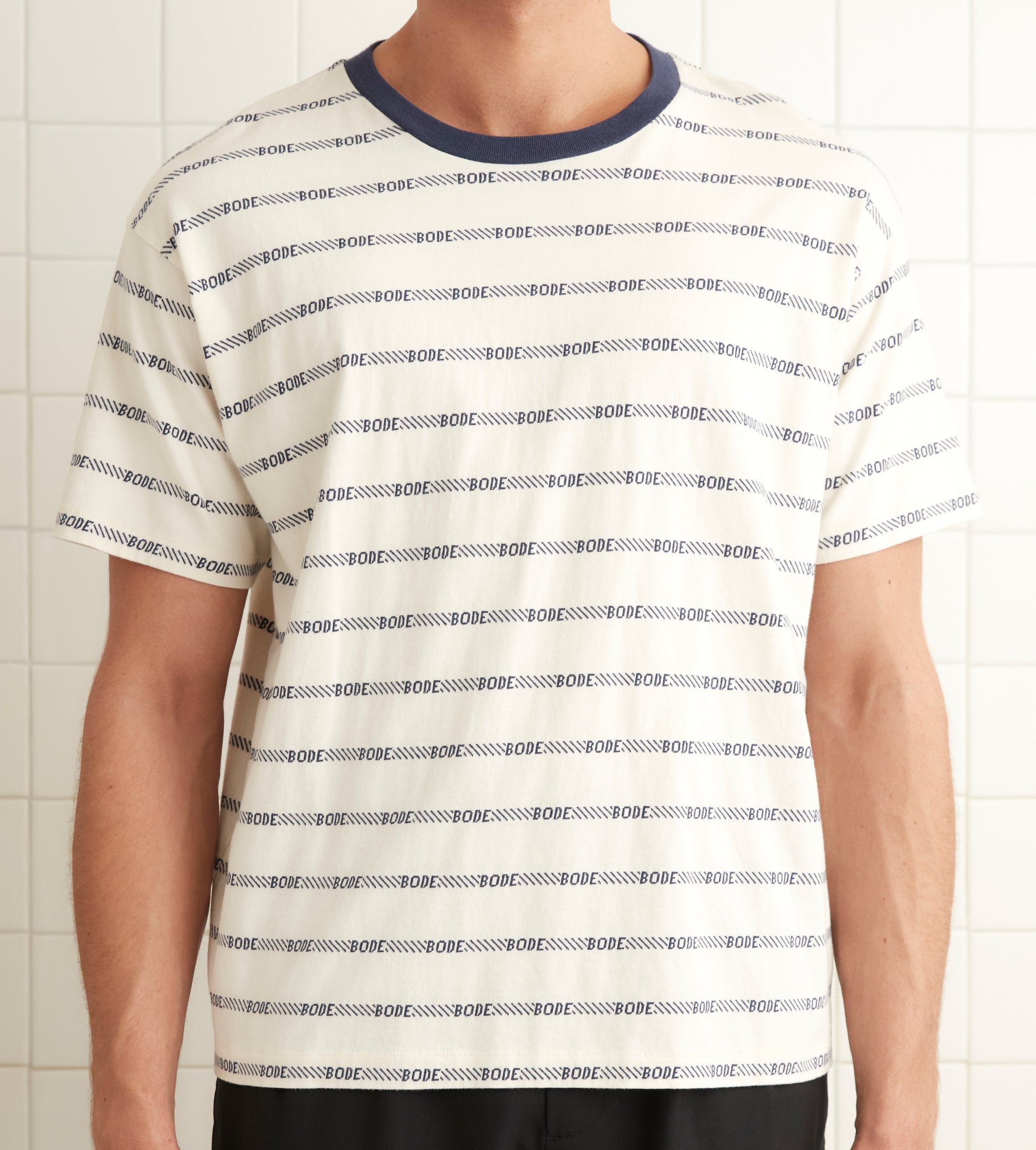 This tee is inspired by a children’s shirt from the 1970s, which had a name worked into the stripes. We reproduced the jacquard pattern with “Bode” inside the stripes.