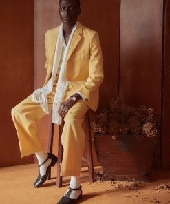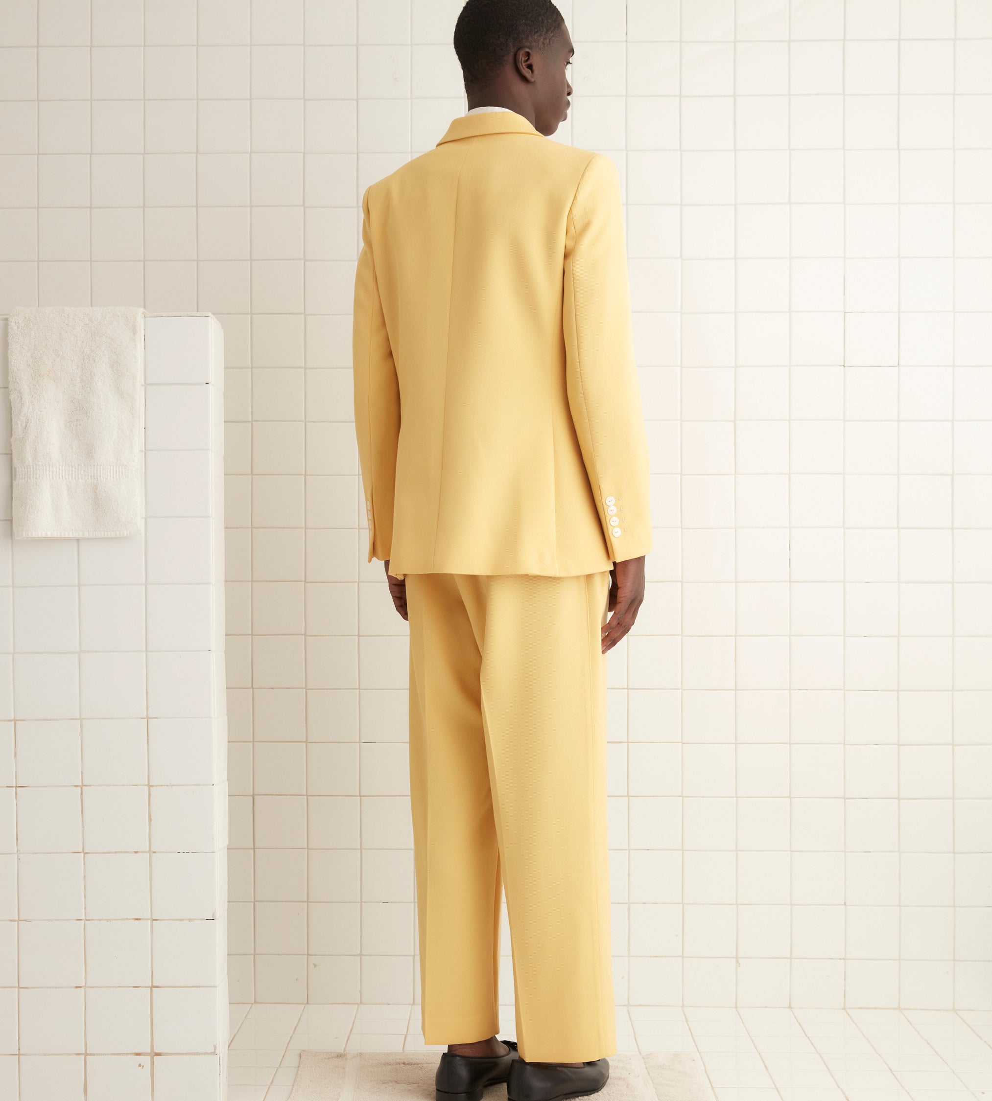 This suit jacket is inspired by a pair of riding breeches from the 1930s. We recreated the fabric —a butter yellow wool twill—for this style. The jacket is trimmed with antique pearl buttons from a now-defunct factory in Iowa, once the largest global pearl-button producer.