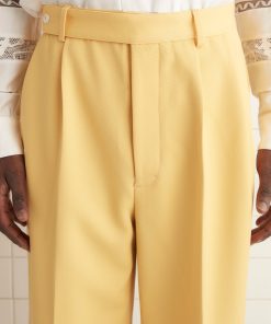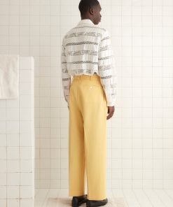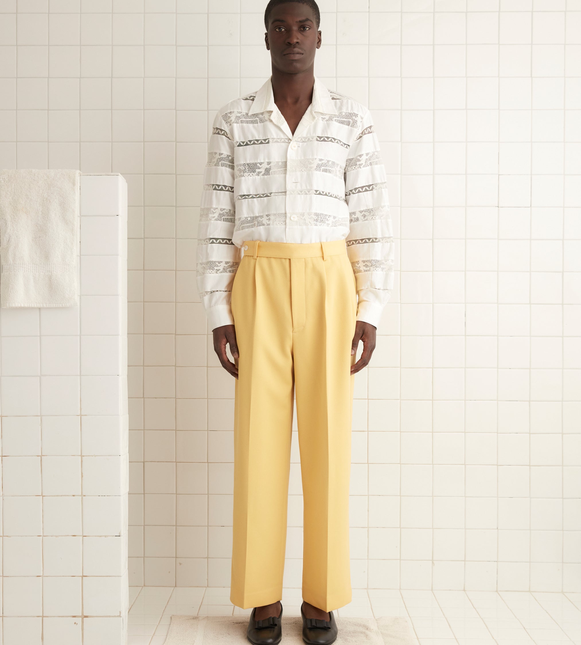These trousers are inspired by a pair of riding breeches from the 1930s. We recreated the fabric—a fine wool twill—for this style. The trousers are trimmed with antique pearl buttons from a now-defunct factory in Iowa, once the largest global pearl-button producer.