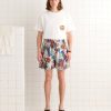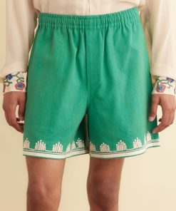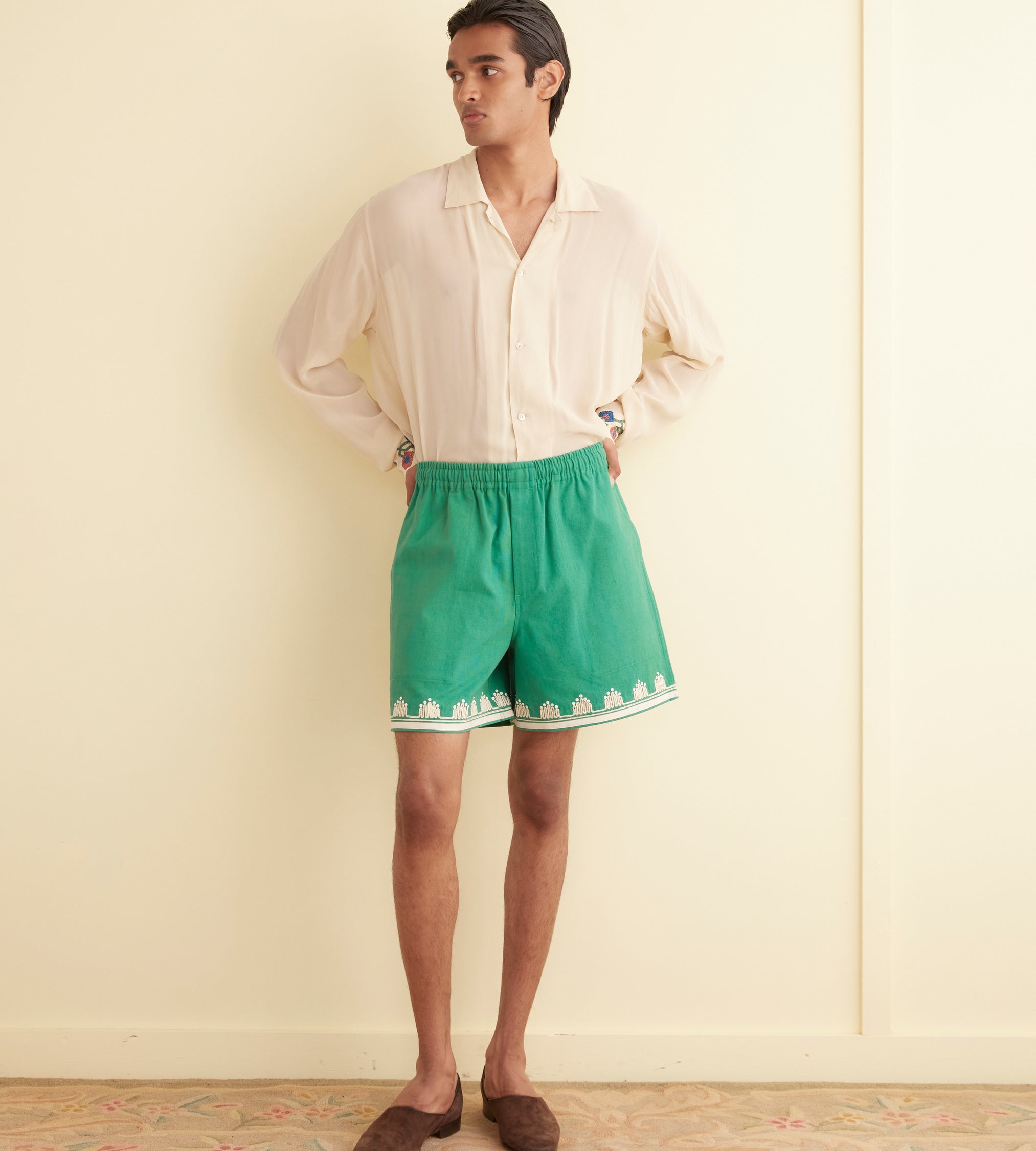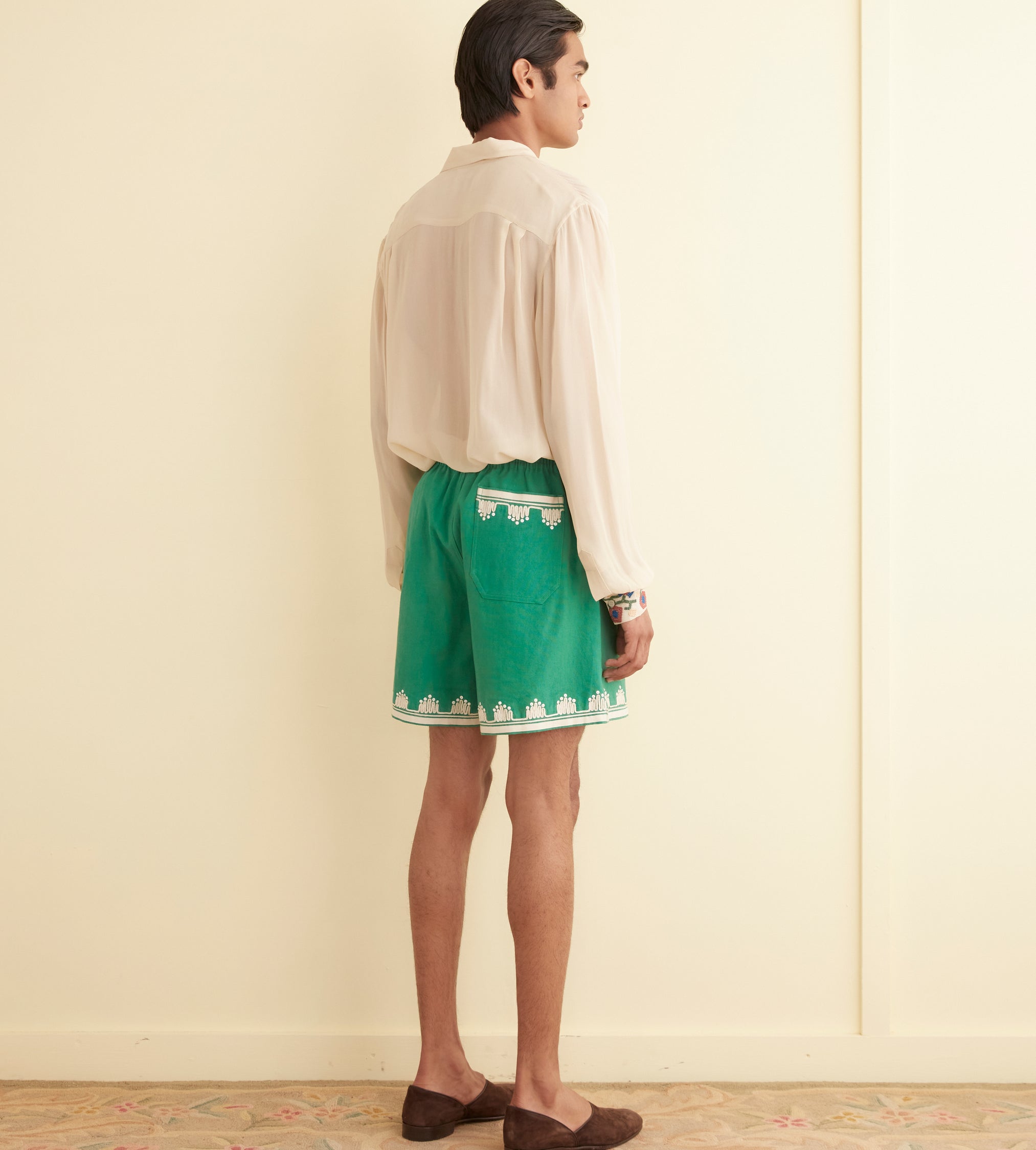 These shorts are inspired by a children’s jacket from the 1930s. We reproduced the rippled appliqué trim and sequin detailing on green linen for this style. All embellishment is done by hand.