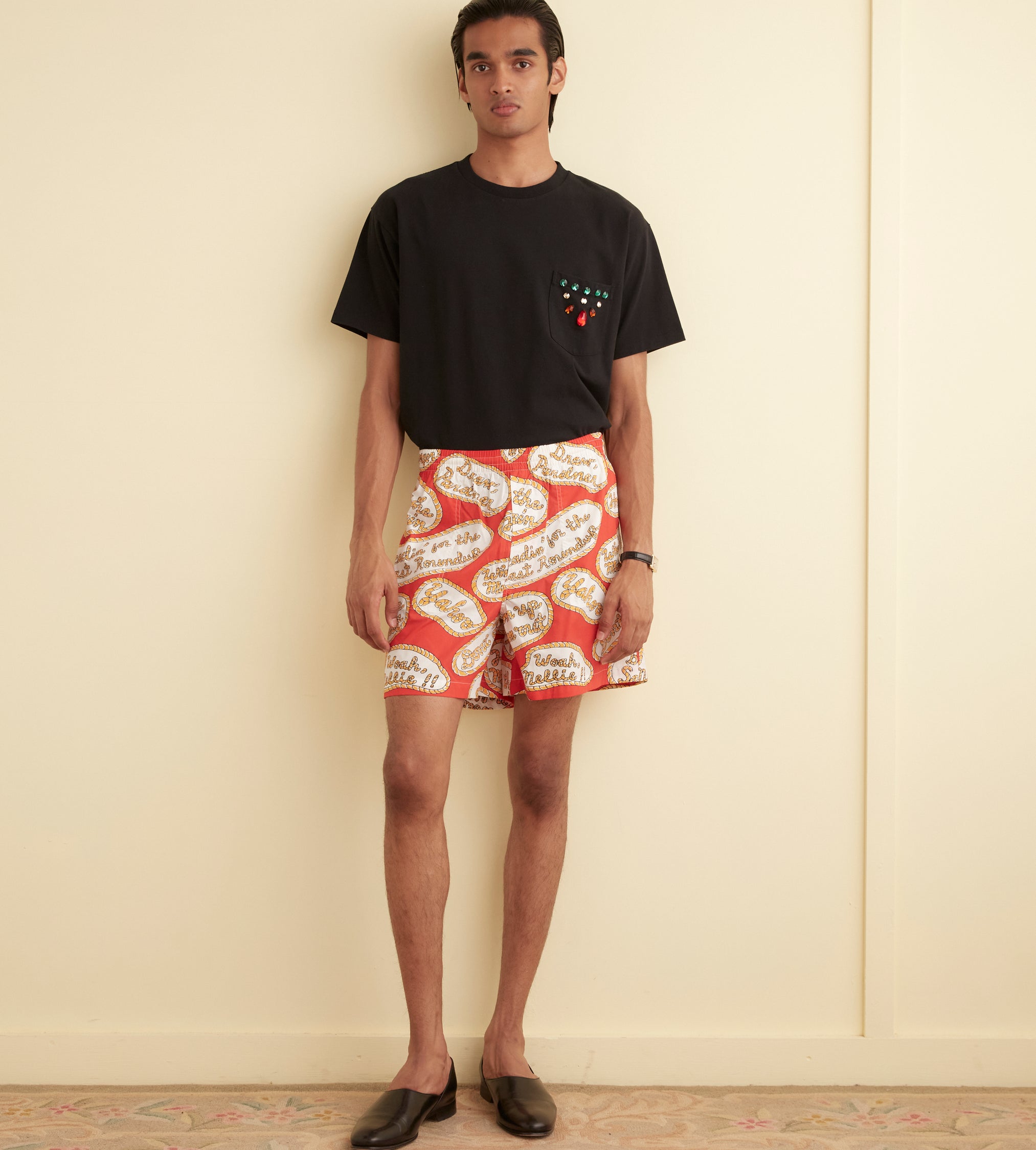 These shorts are inspired by a vintage novelty shirt from the 1960s. The original pattern—lasso-font slogans on a red background—has been reproduced here. The silhouette mimics that of traditional rugby shorts, with a short inseam and wide leg opening.