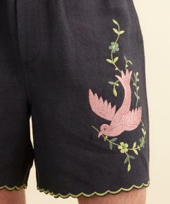 These shorts are inspired by an embroidered tea towel from the 1960s-1970s. We reproduced the pink and green embroidery—a bird-and-greenery pattern—for this style. The shorts are scalloped and embroidered along the hem and back pocket.