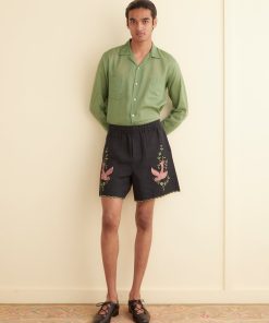 These shorts are inspired by an embroidered tea towel from the 1960s-1970s. We reproduced the pink and green embroidery—a bird-and-greenery pattern—for this style. The shorts are scalloped and embroidered along the hem and back pocket.