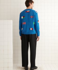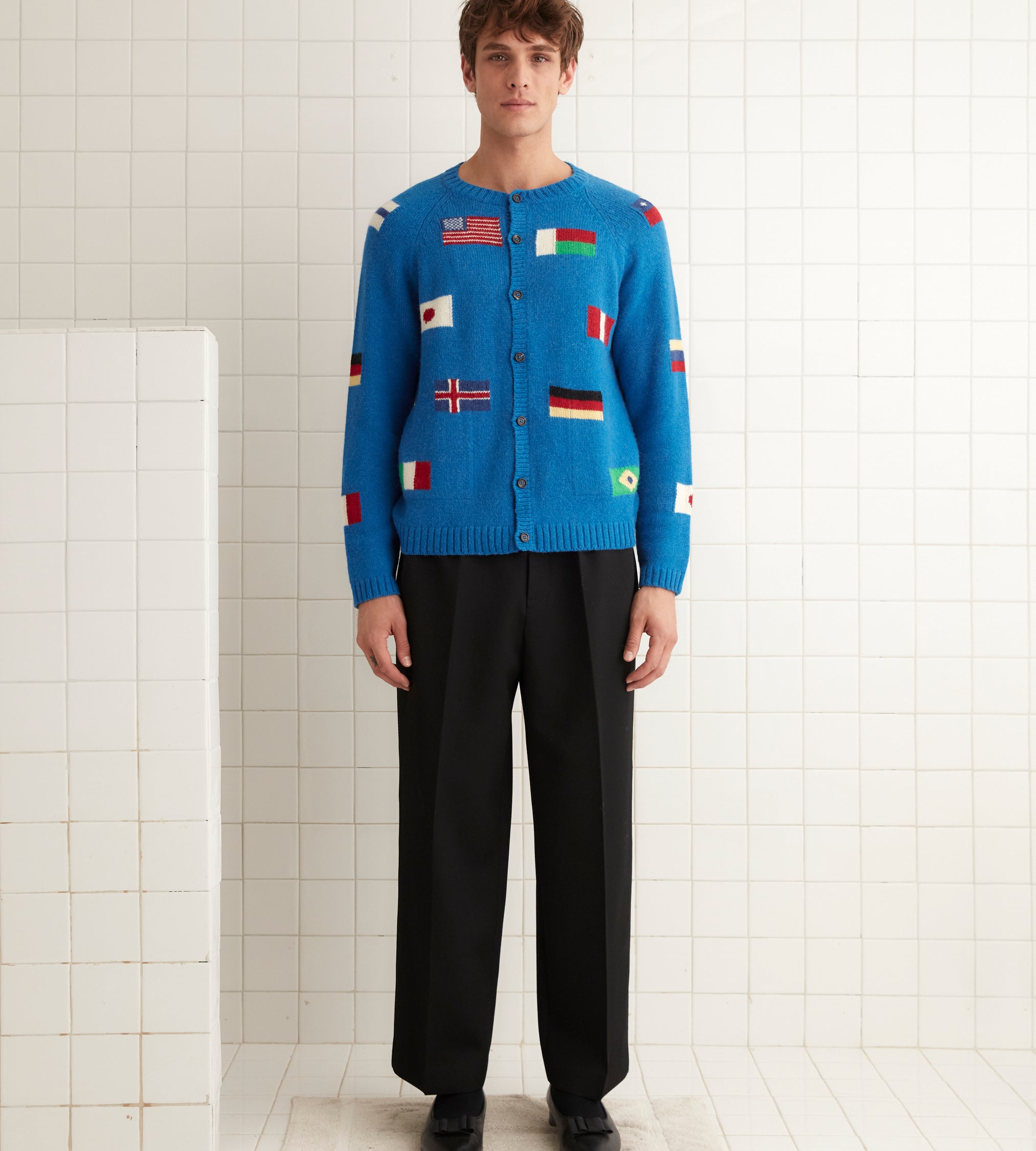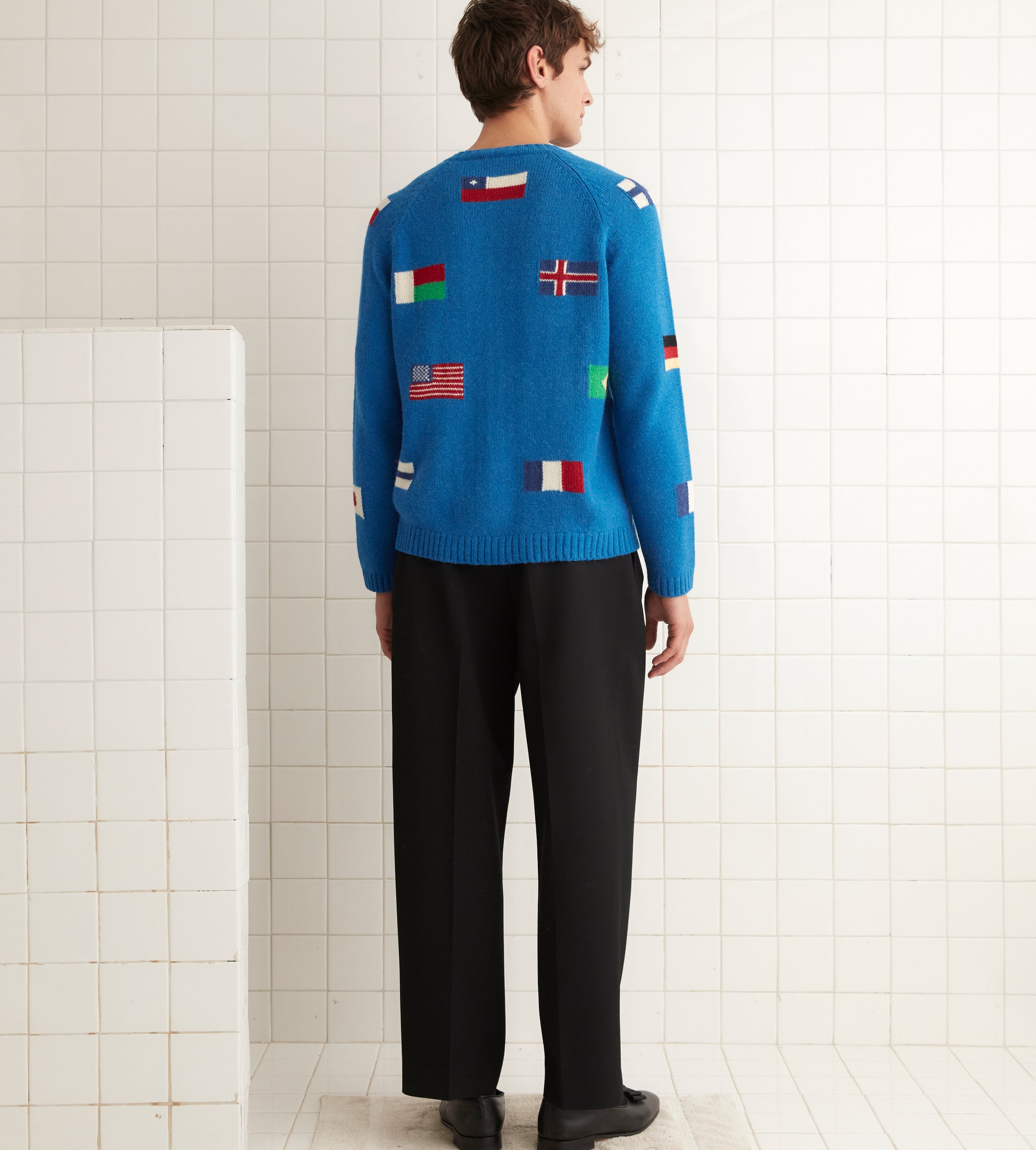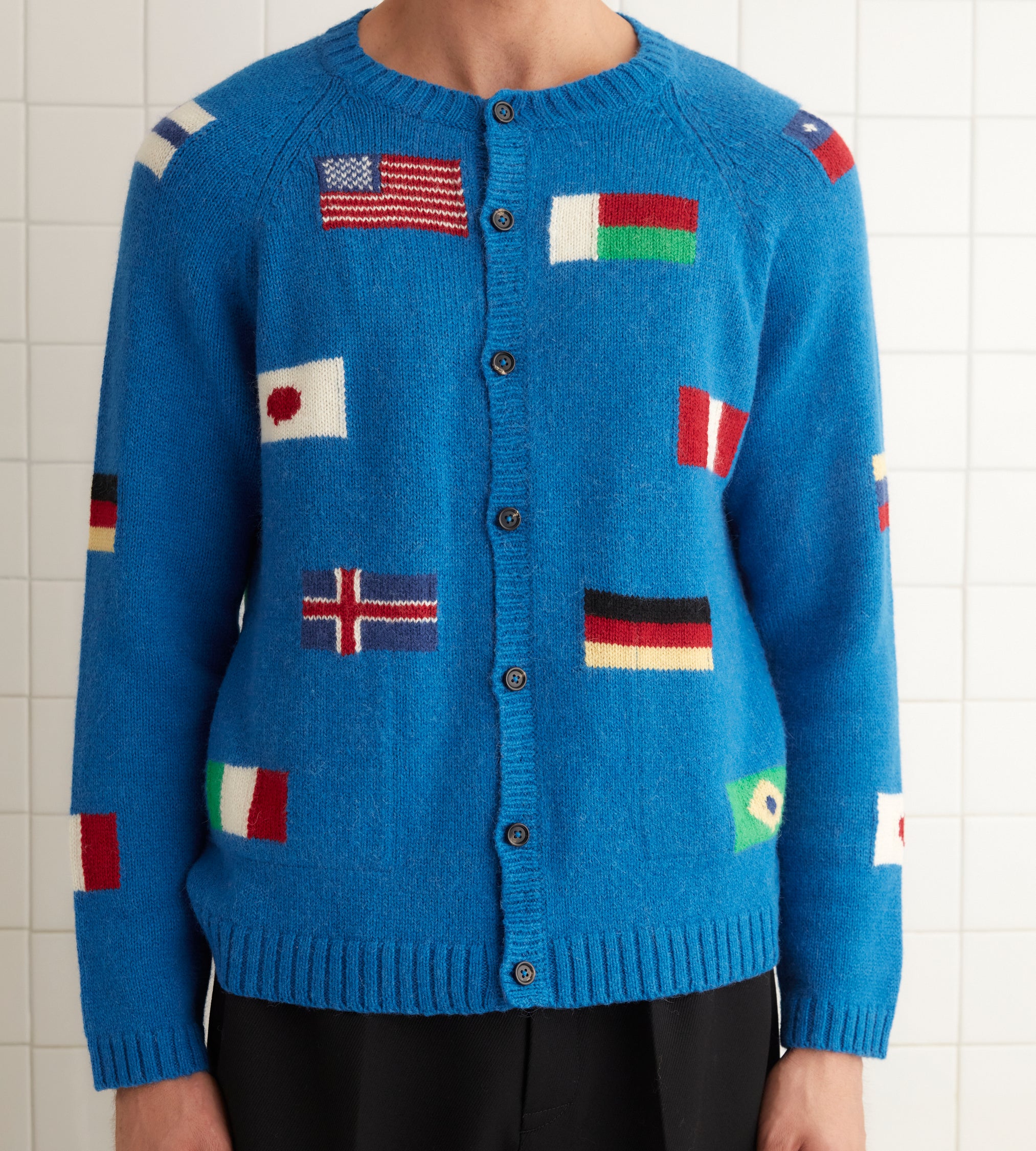This cardigan is inspired by a novelty sweater from the 1970s, likely made from a DIY knitting kit. We reproduced the intarsia flag pattern for this style.