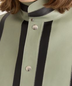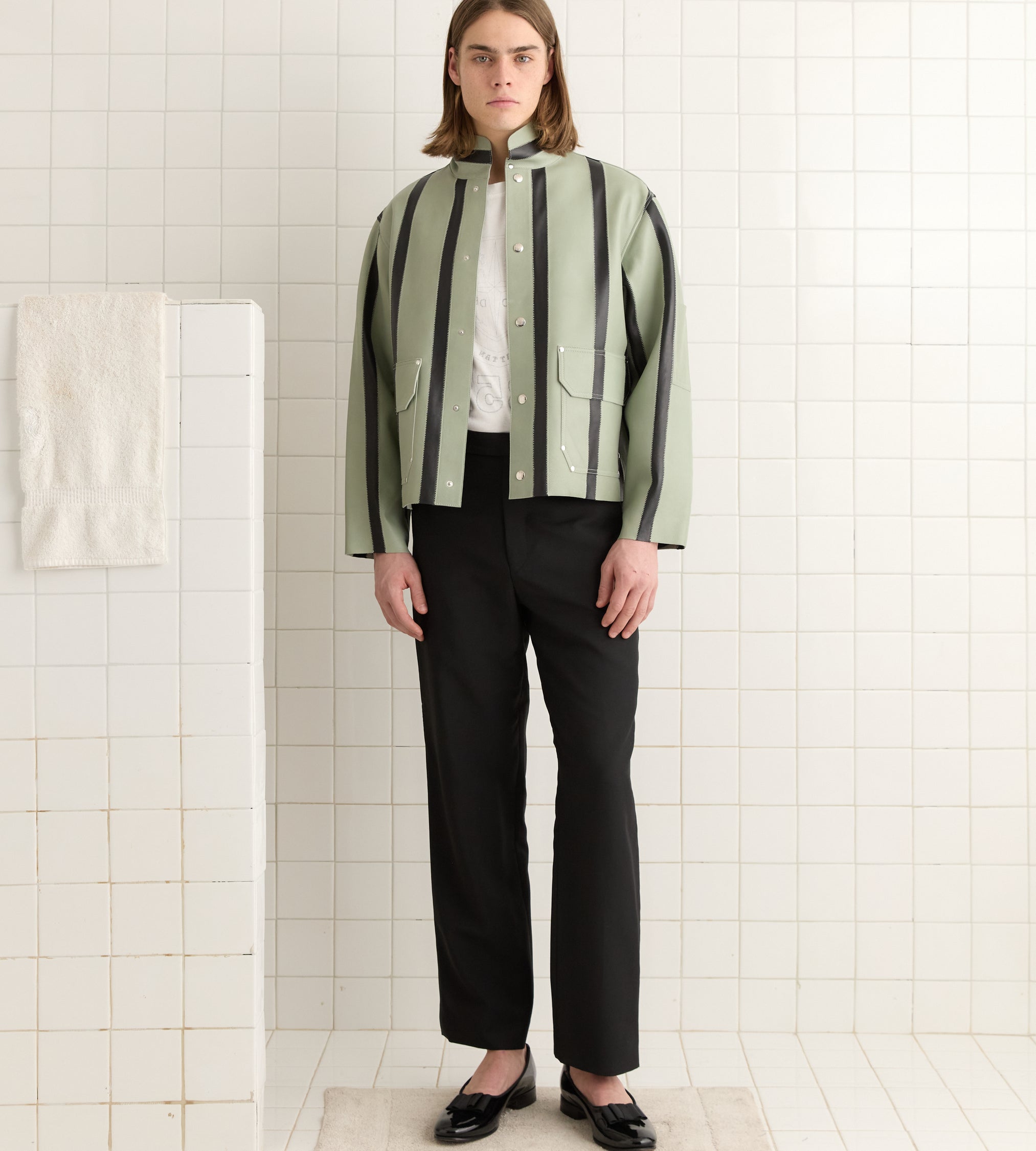 This style is inspired by a welding jacket from the midcentury. We reproduced the silhouette in stripes of black and seafoam leather. The jacket closes with snap buttons.