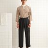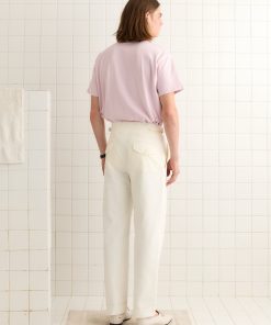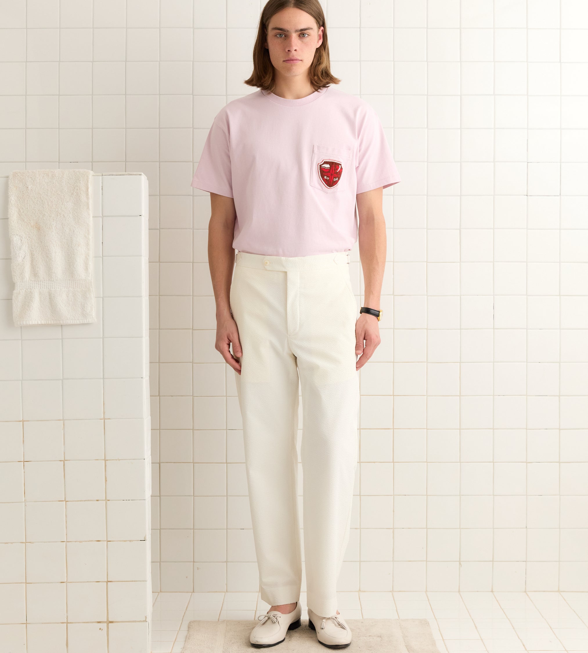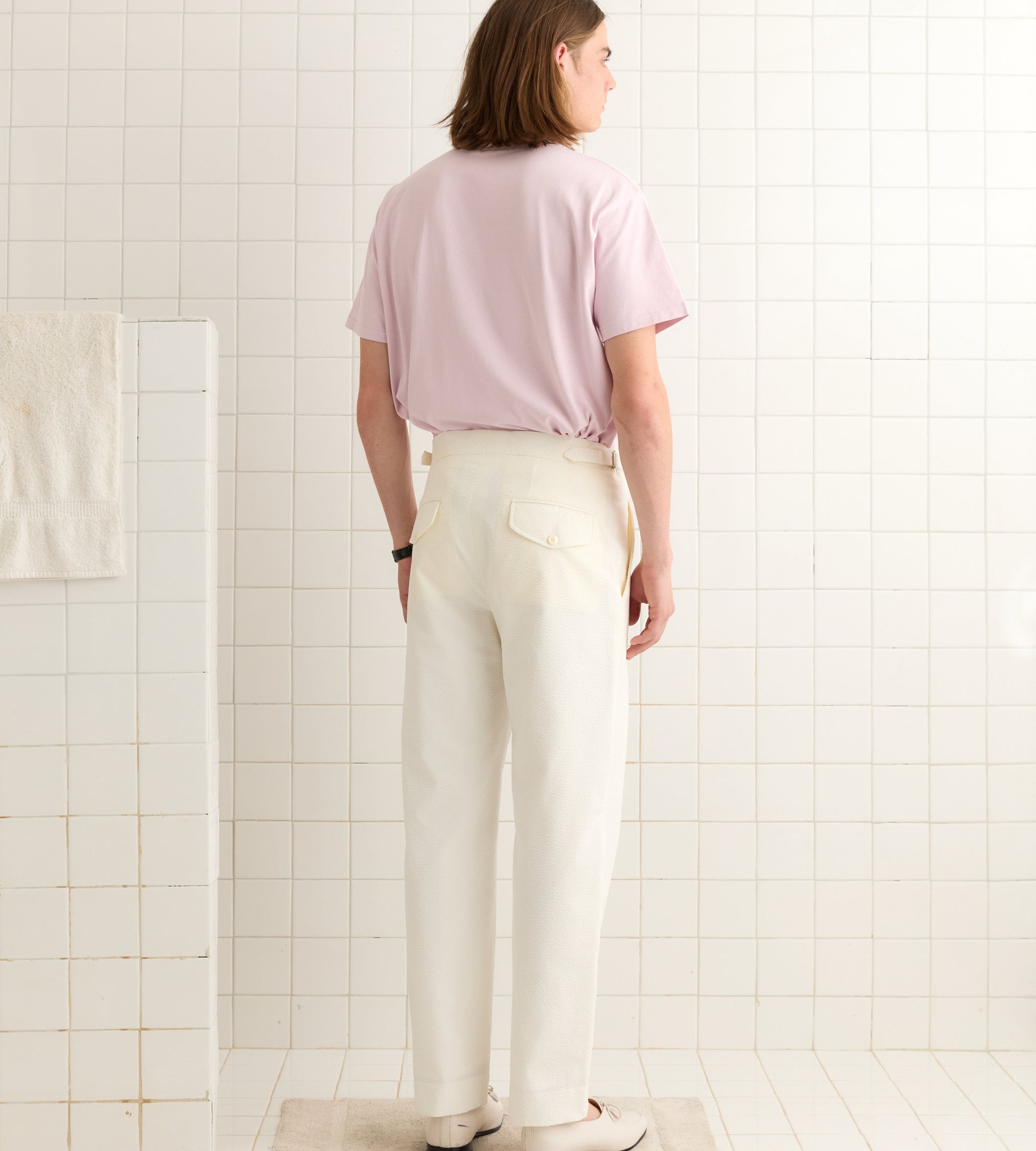 These trousers are inspired by men’s suiting from the 1950s-1960s. Made from white seersucker, they are cut with a mid-rise and a straight leg.