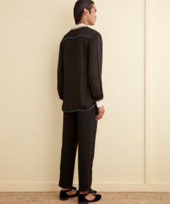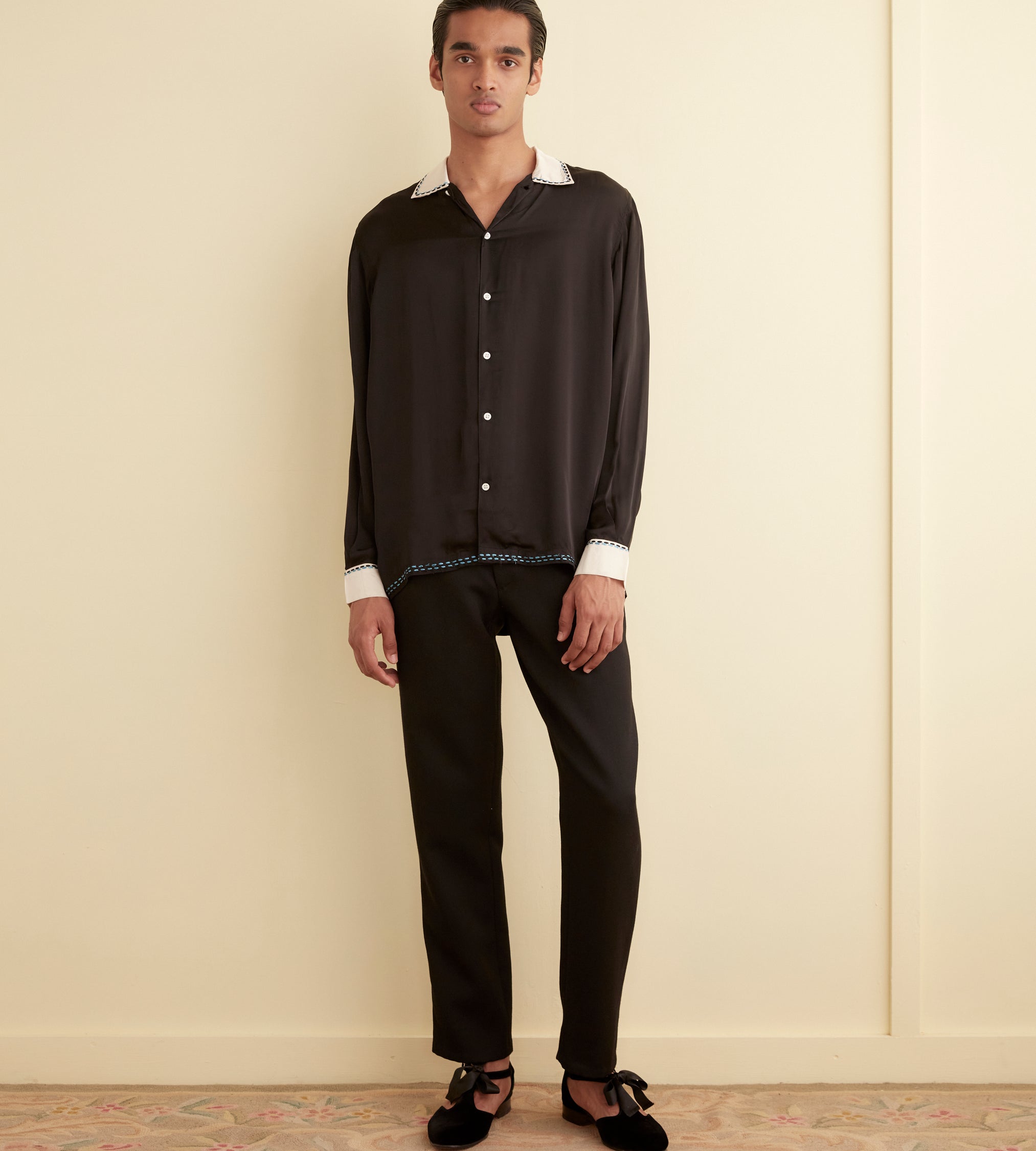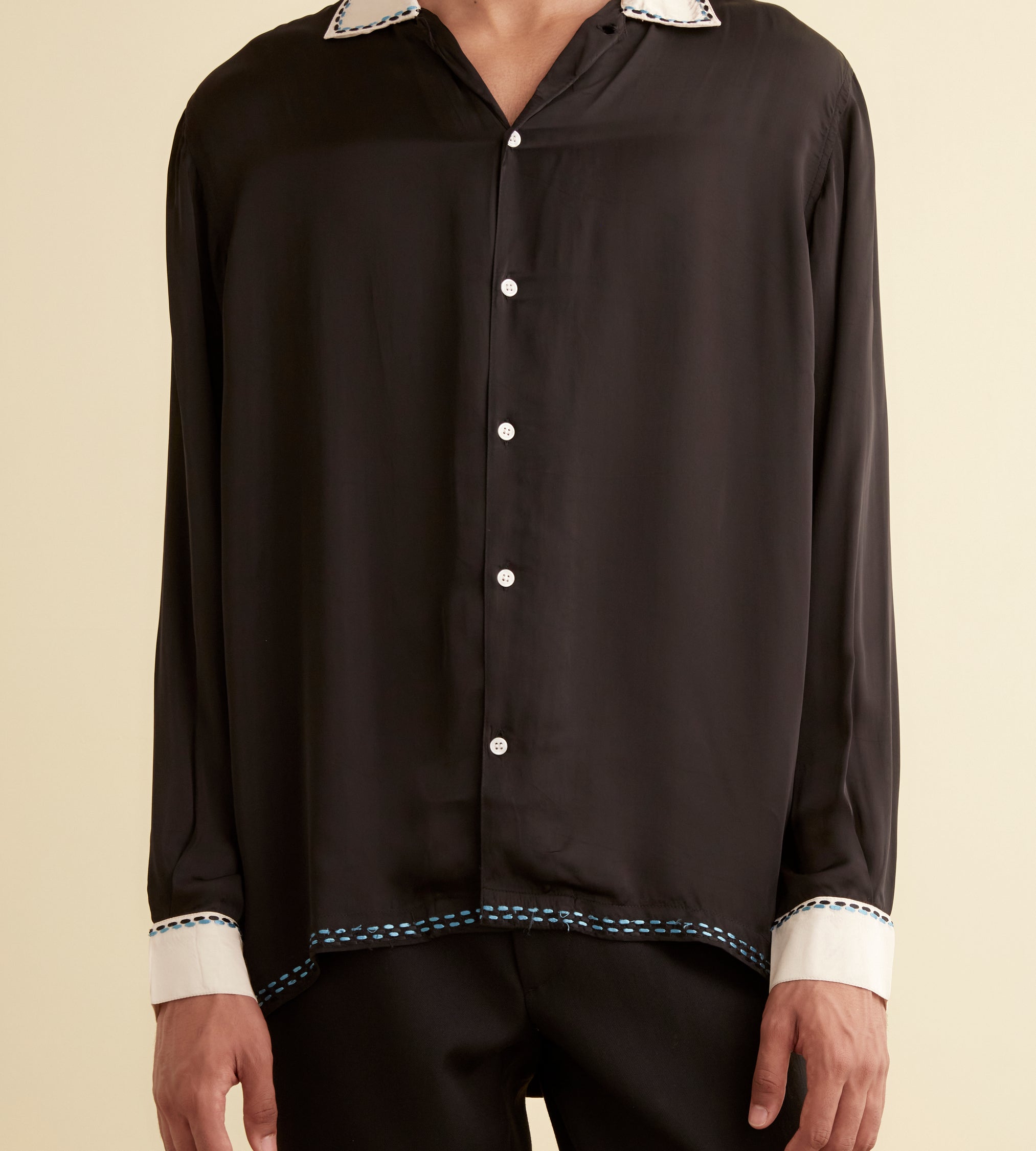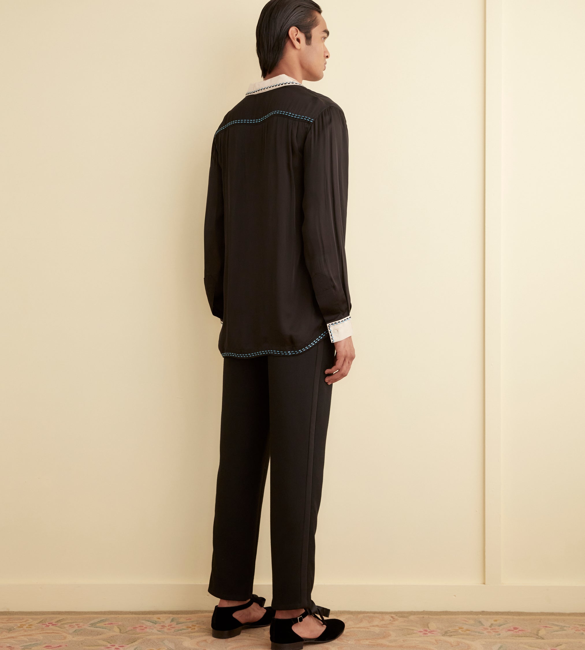 This shirt is inspired by a tunic from the 1900s-1920s, which featured this contrast collar and blue-and-black running stitches along the hem. We reproduced the details of the original piece on this long-sleeved shirt.