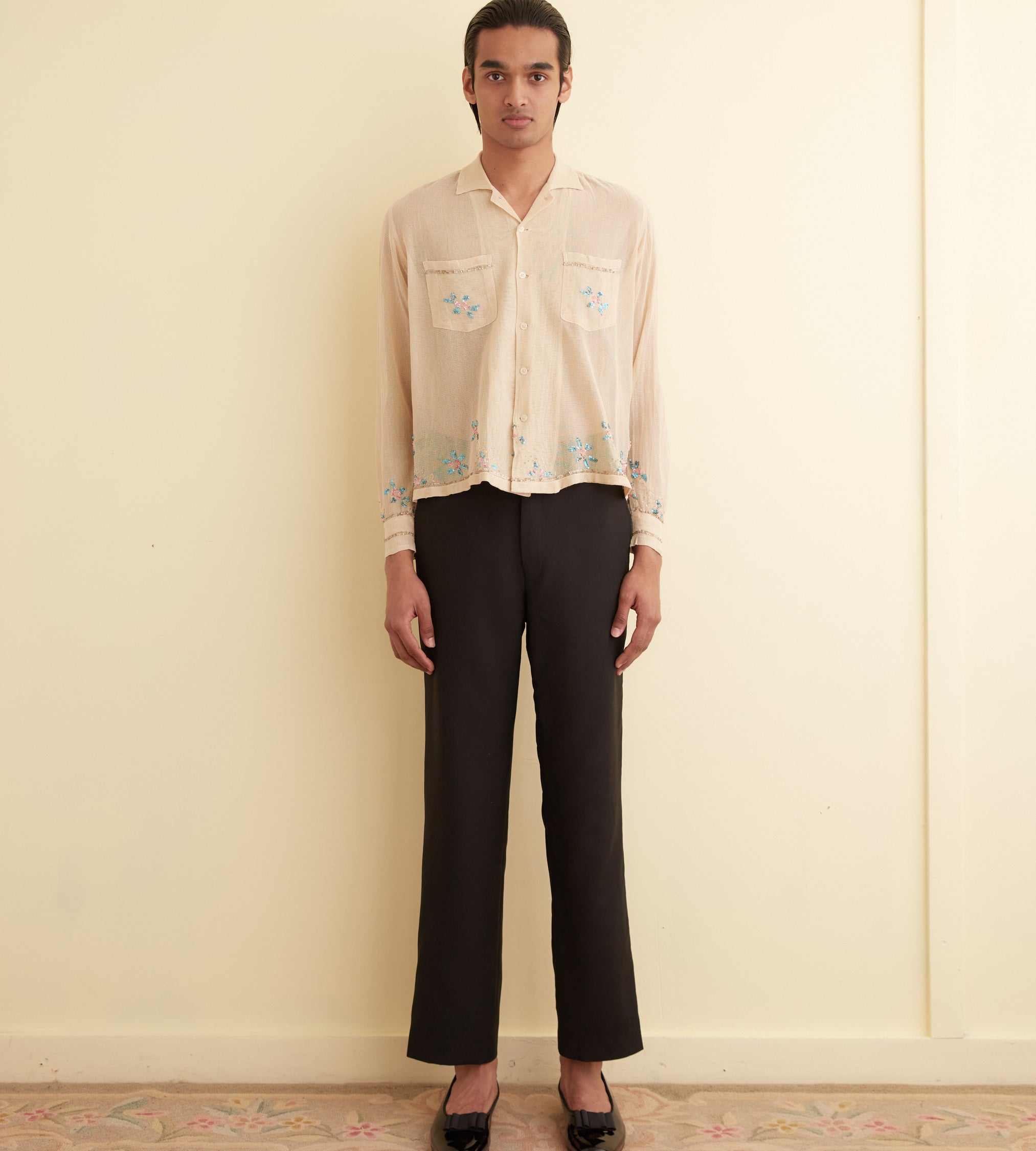 This long sleeve shirt is inspired by a remnant of a 1920s trim remnant. The shimmering appliqué flower design is a faithful reproduction of the trim remnant sourced in France.