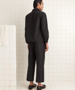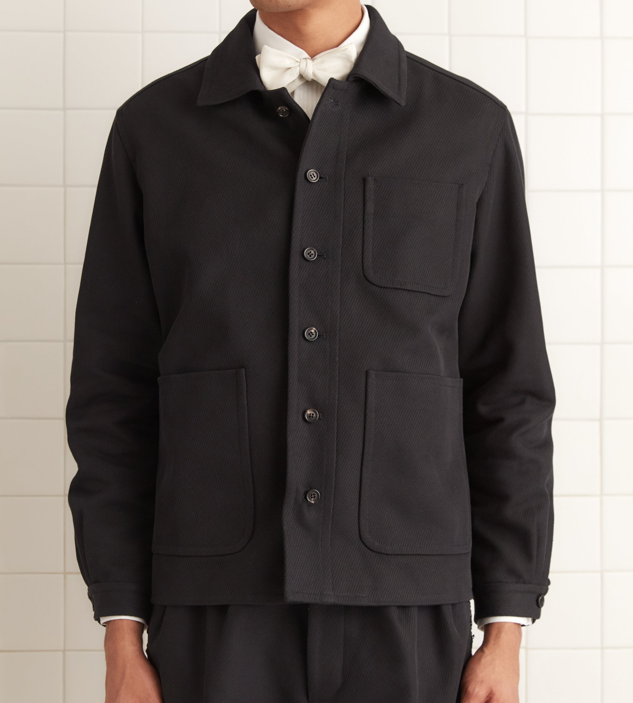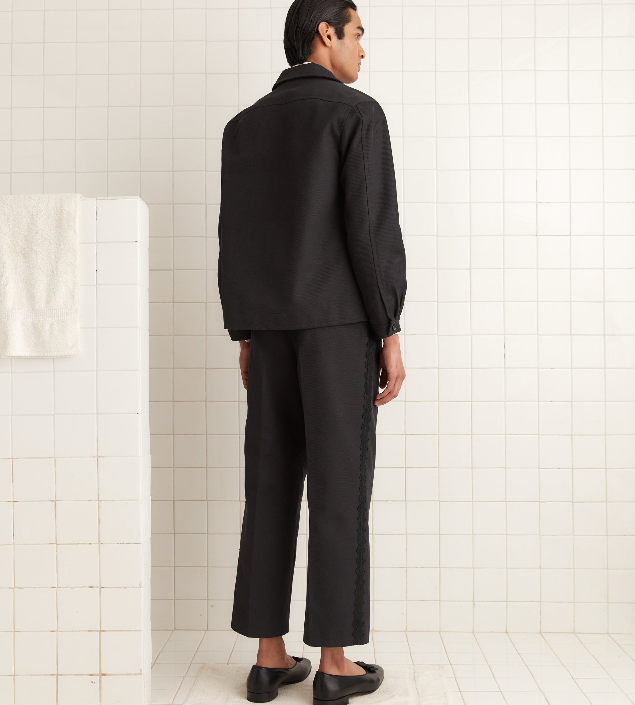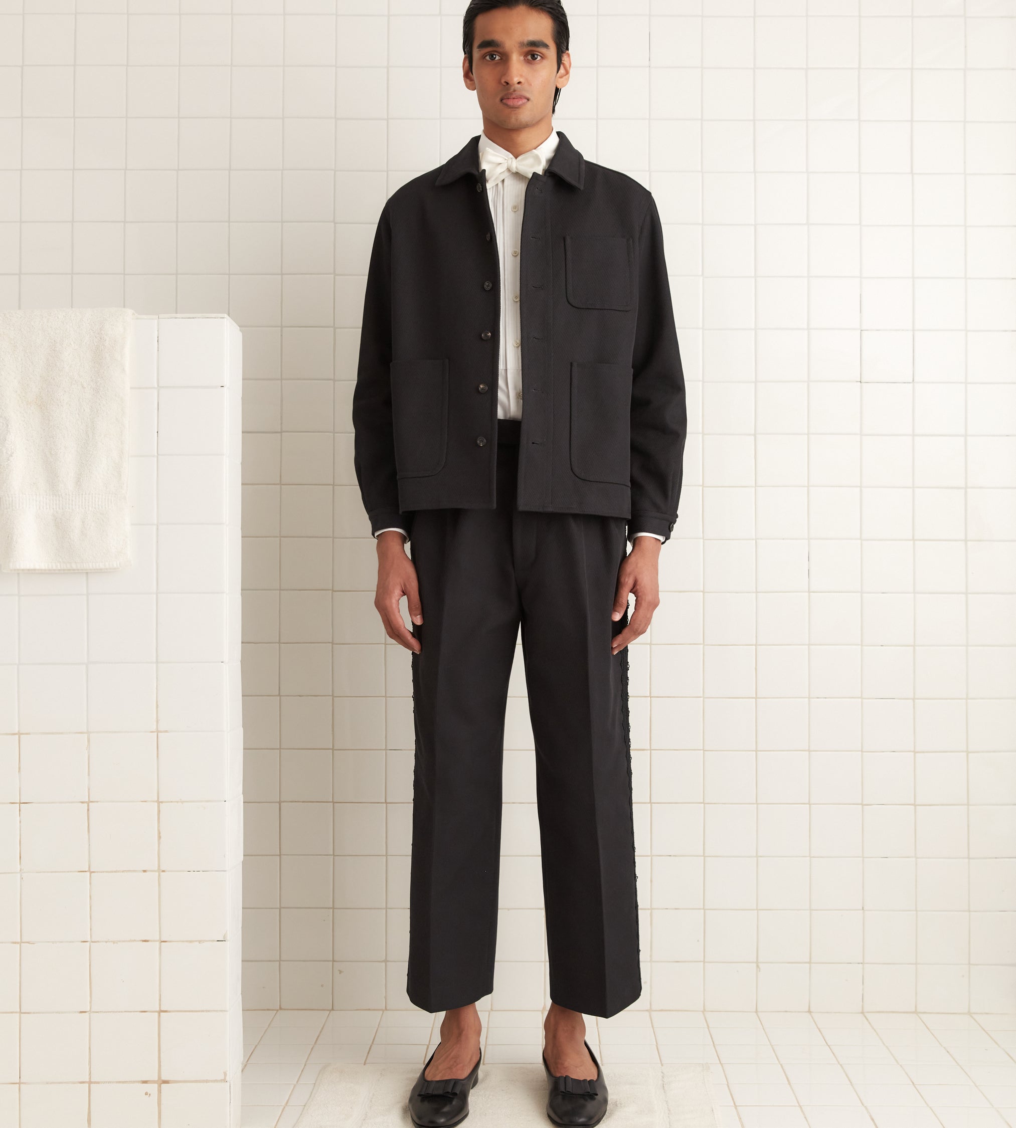 This jacket is inspired by a men’s workwear jacket sourced outside of Paris, c.1940s. We reproduced the silhouette in black wool twill.