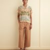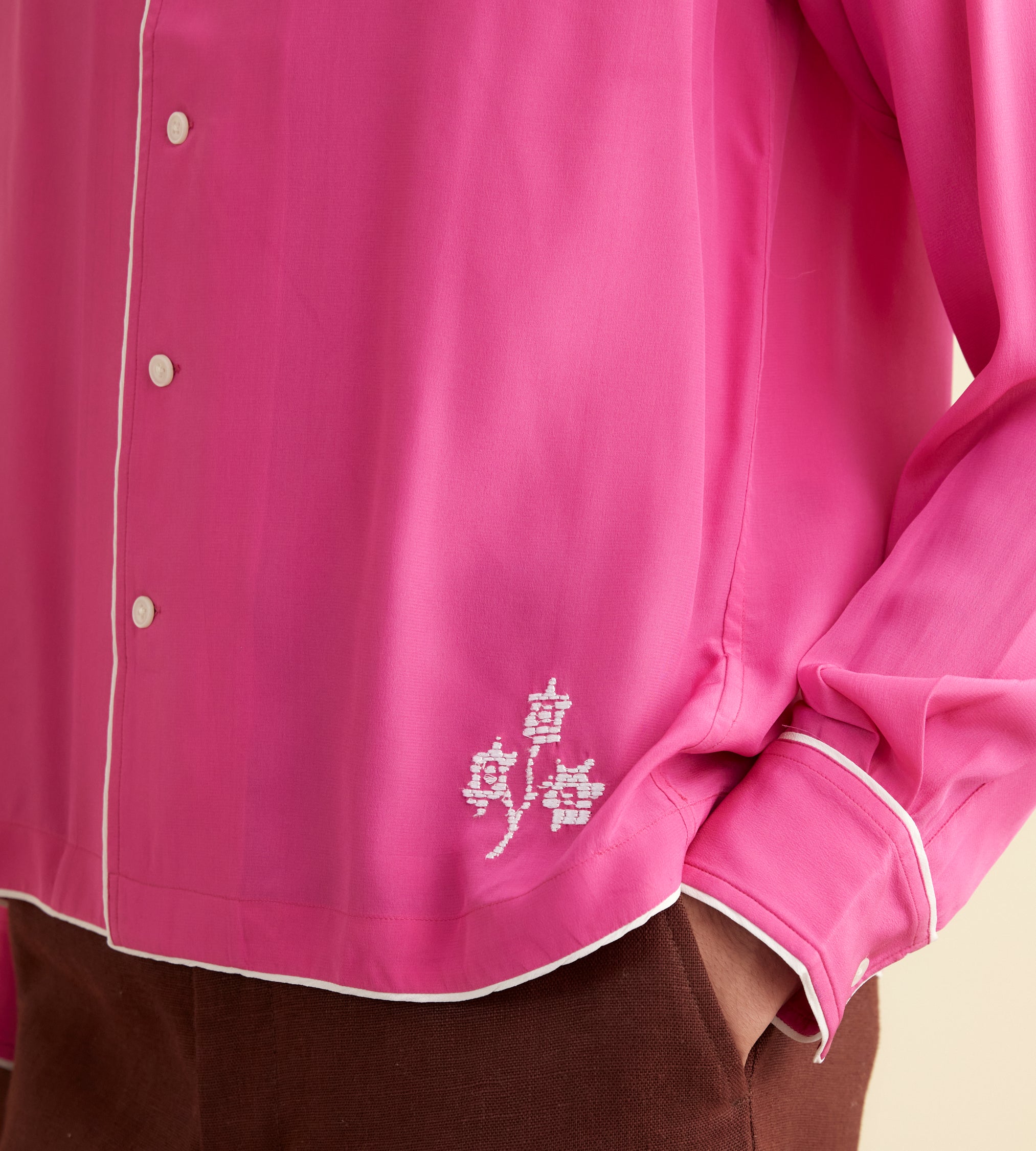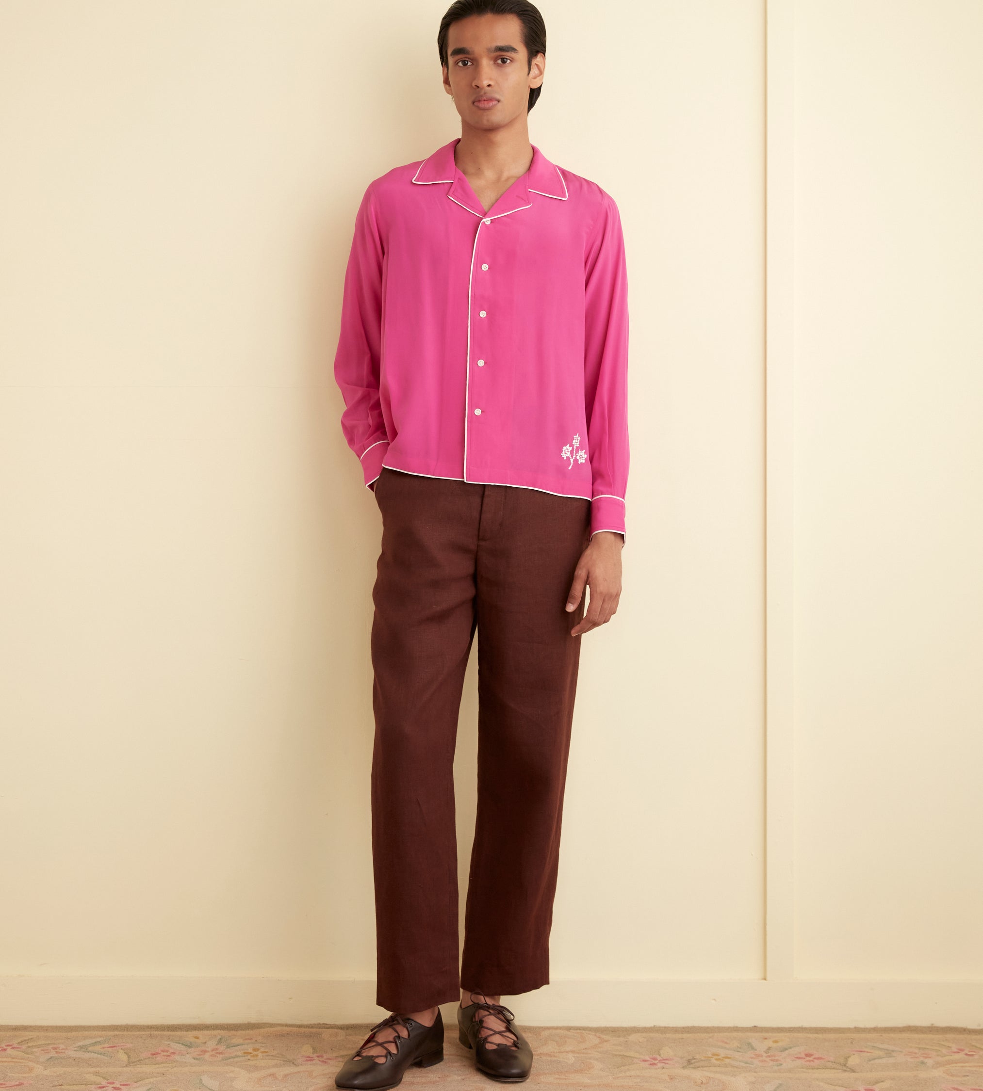 This shirt is inspired by men’s pajamas from the 1960s-1970s. We recreated the original pajama shirt—hot pink with white piping and embroidery—for this style.