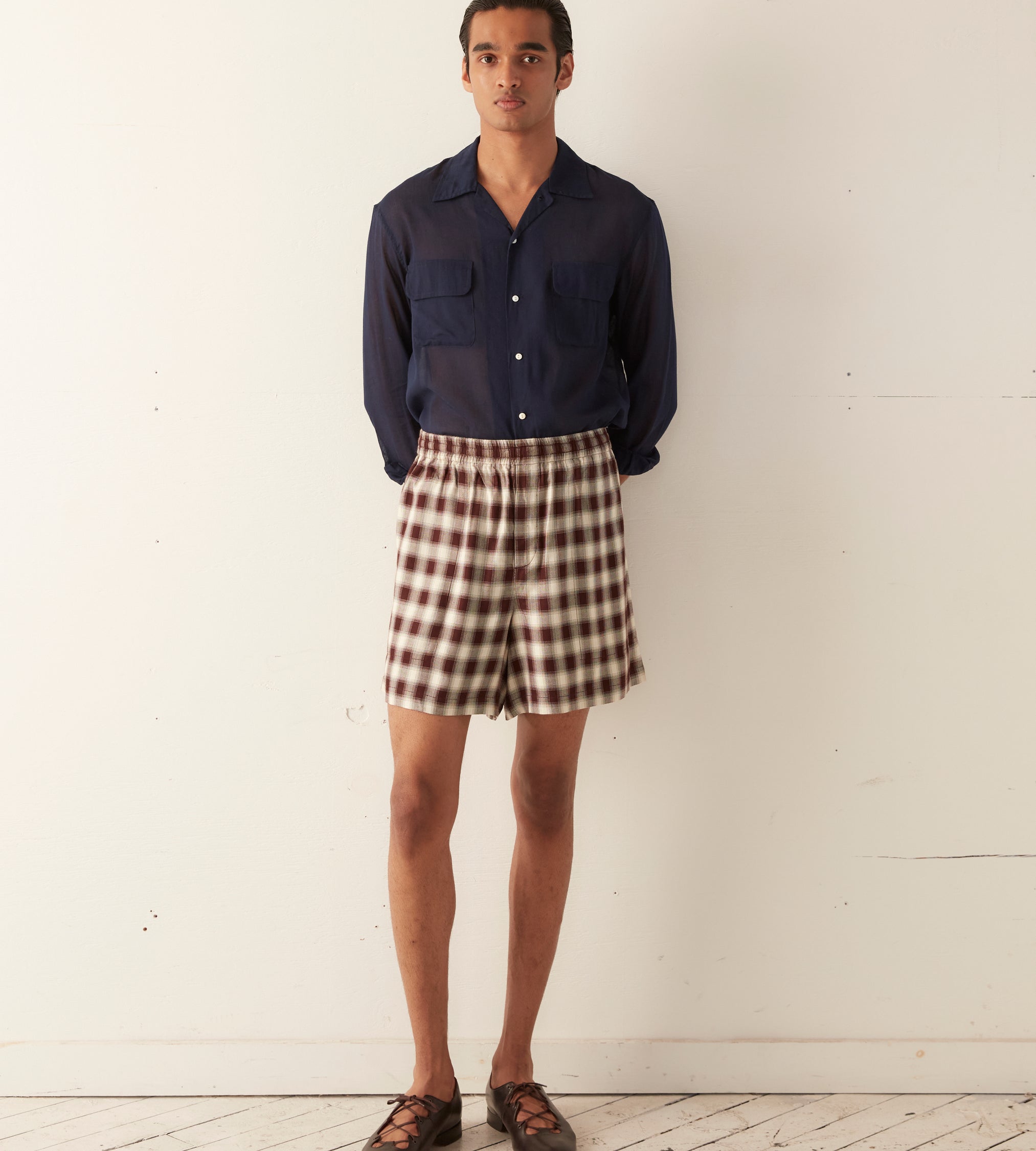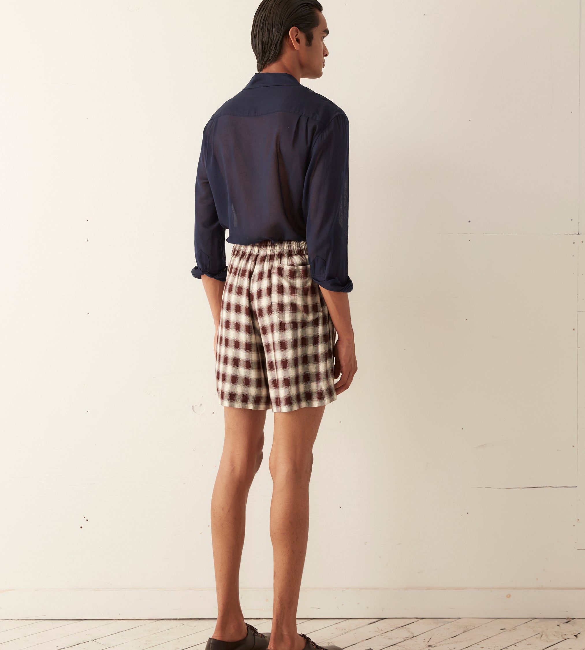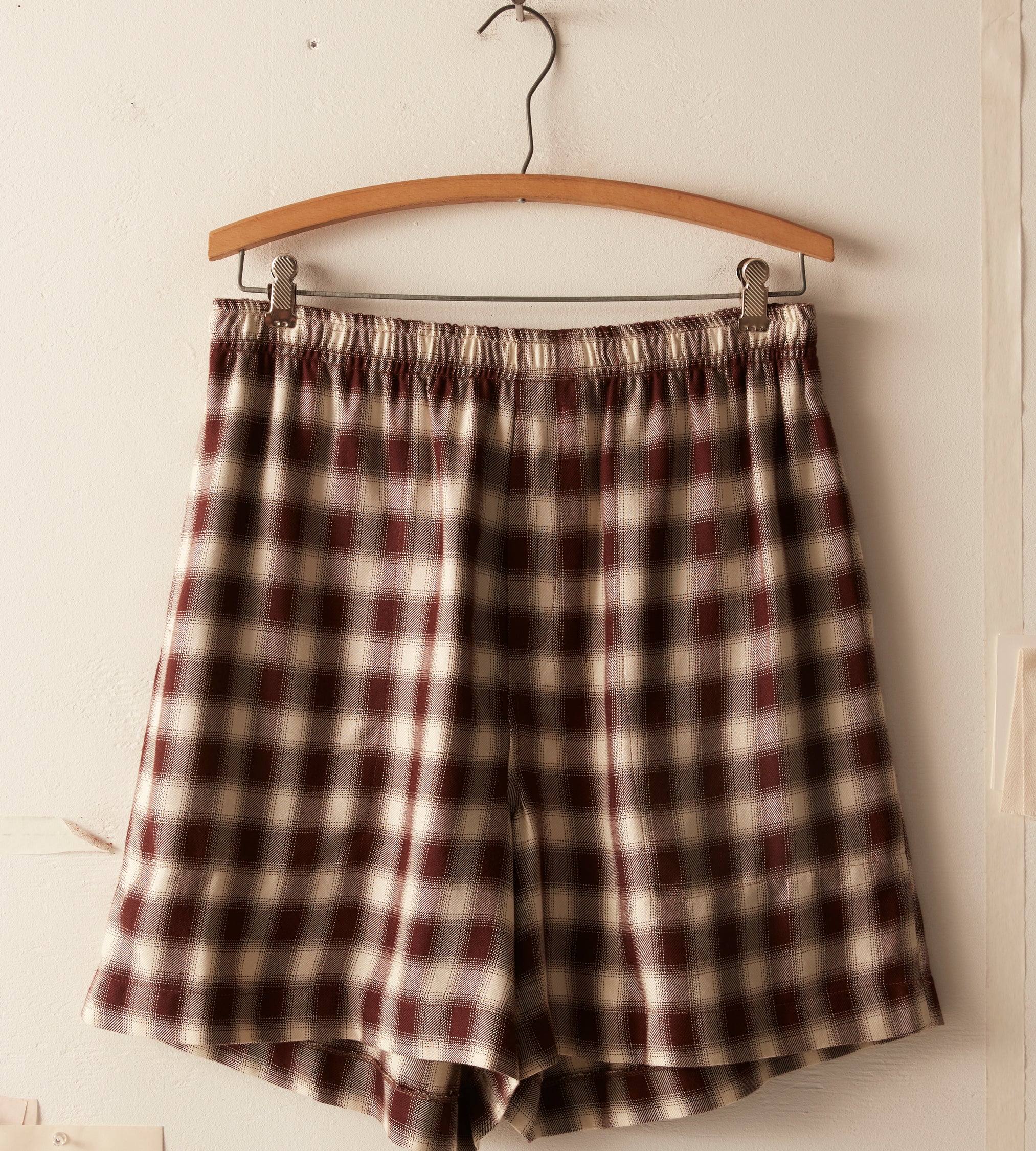 These shorts are inspired by a plaid suiting fabric circa 1940s. This style represents a historical reproduction of a classic ombré shadow plaid suiting fabric evocative of mid-century American workwear.