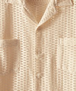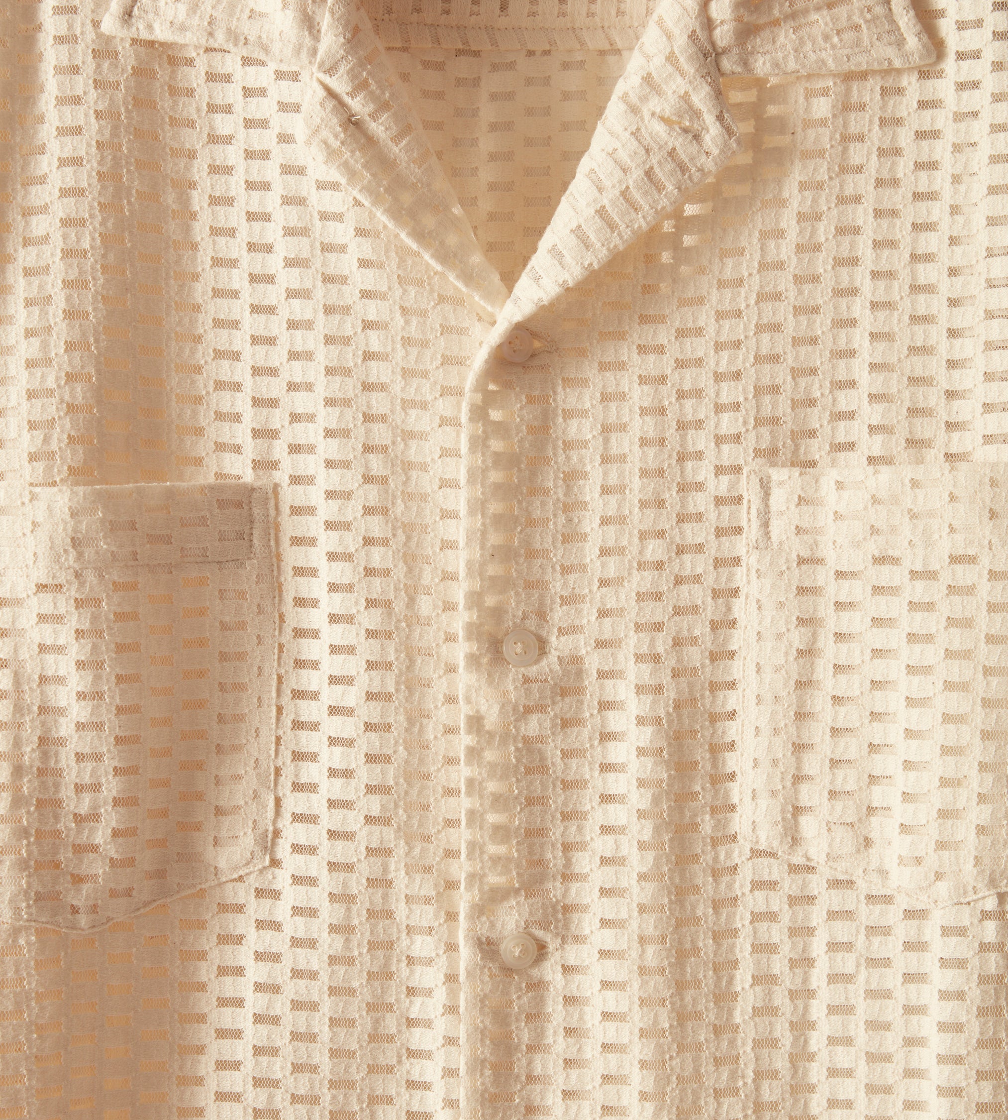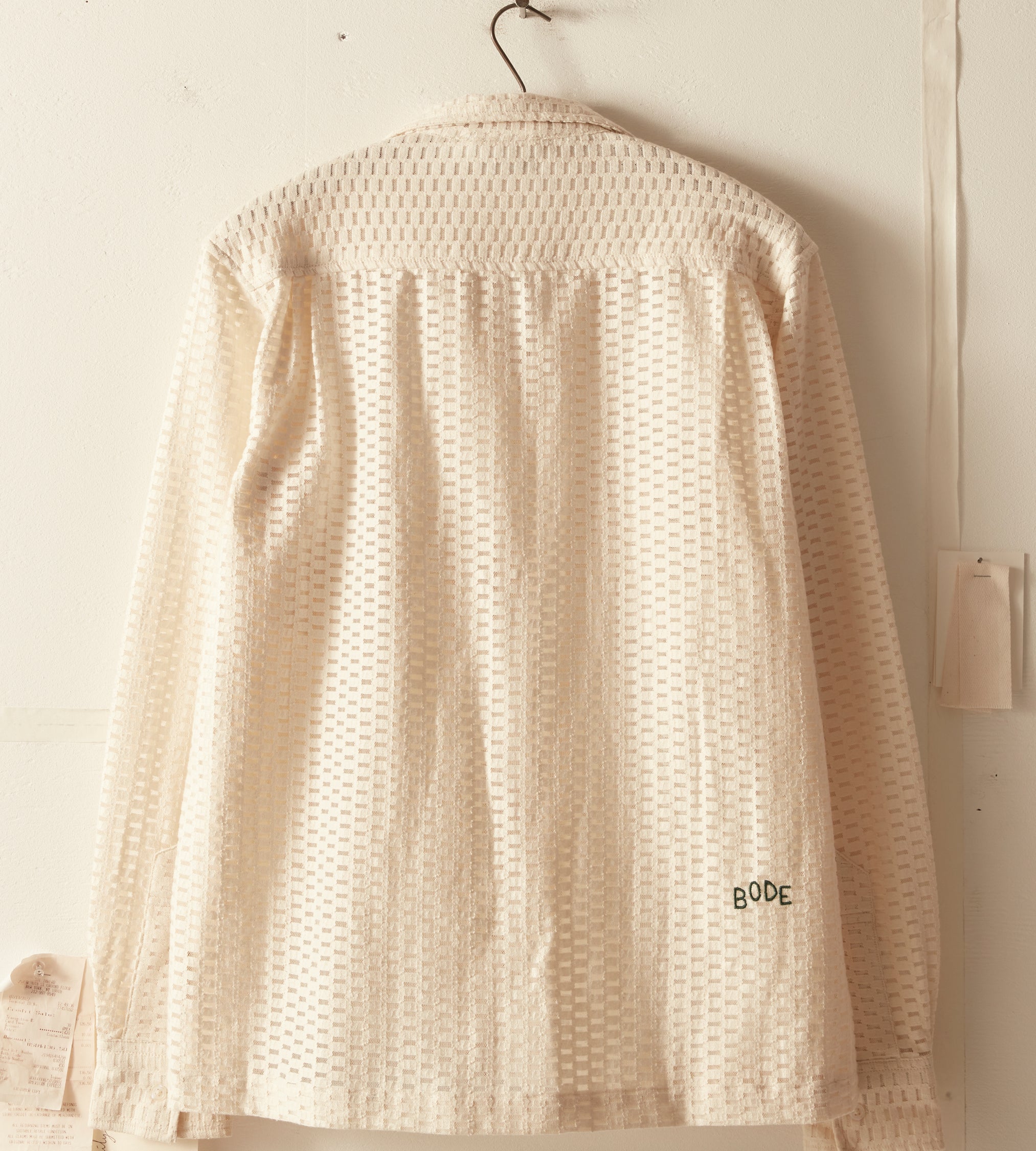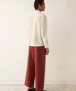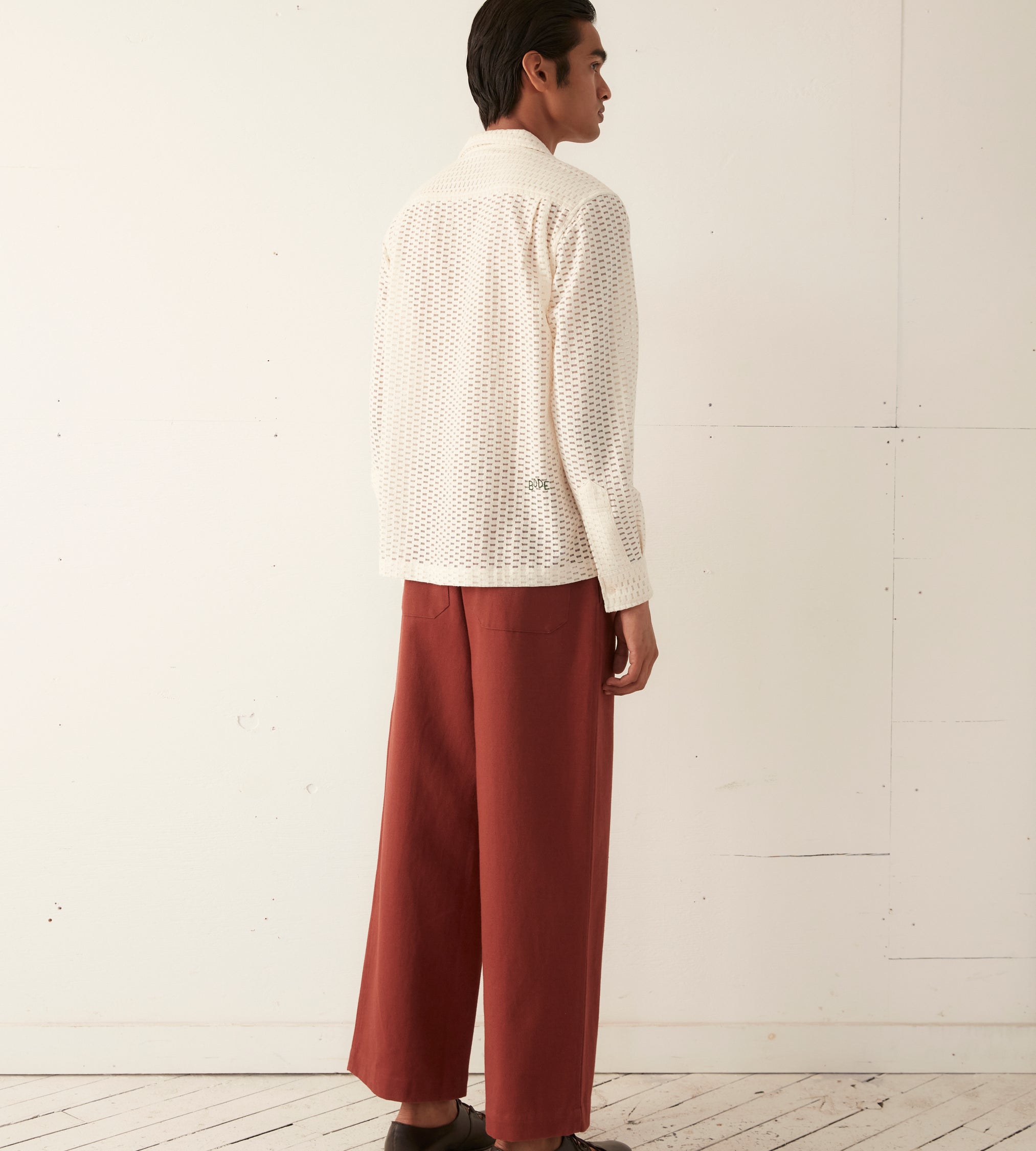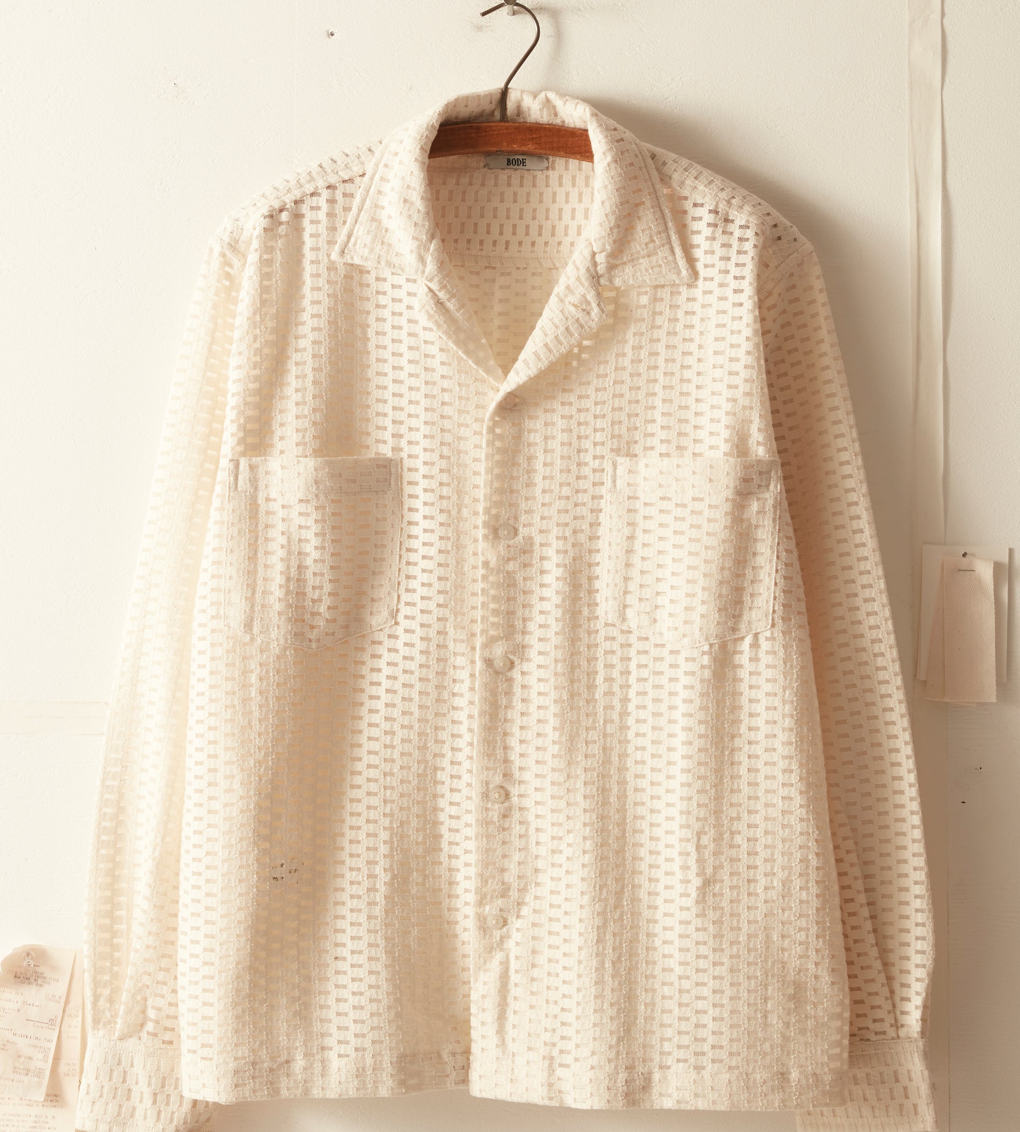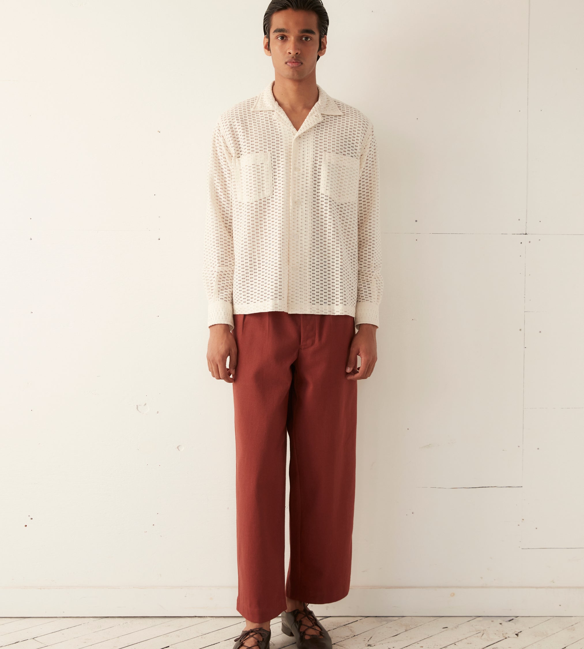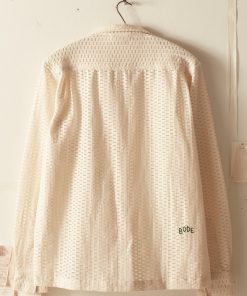 This long-sleeve shirt is inspired by a Quaker Lace curtain, circa 1940s. The Quaker Lace Company produced affordable machine-made lace and popularized lace tablecloths even appearing in the Eisenhower White House.