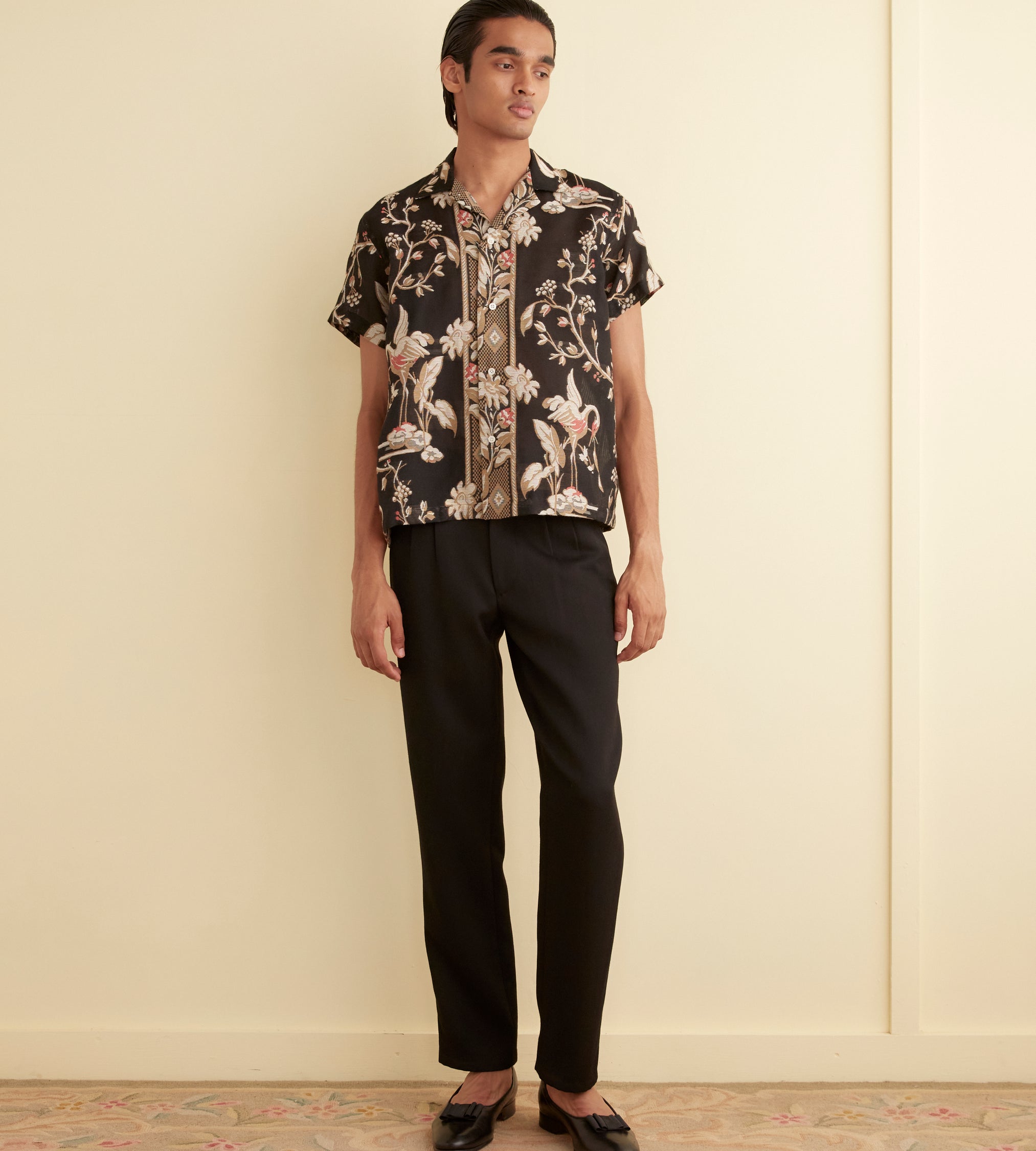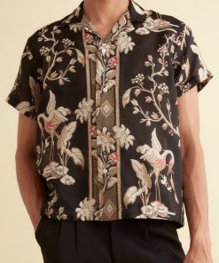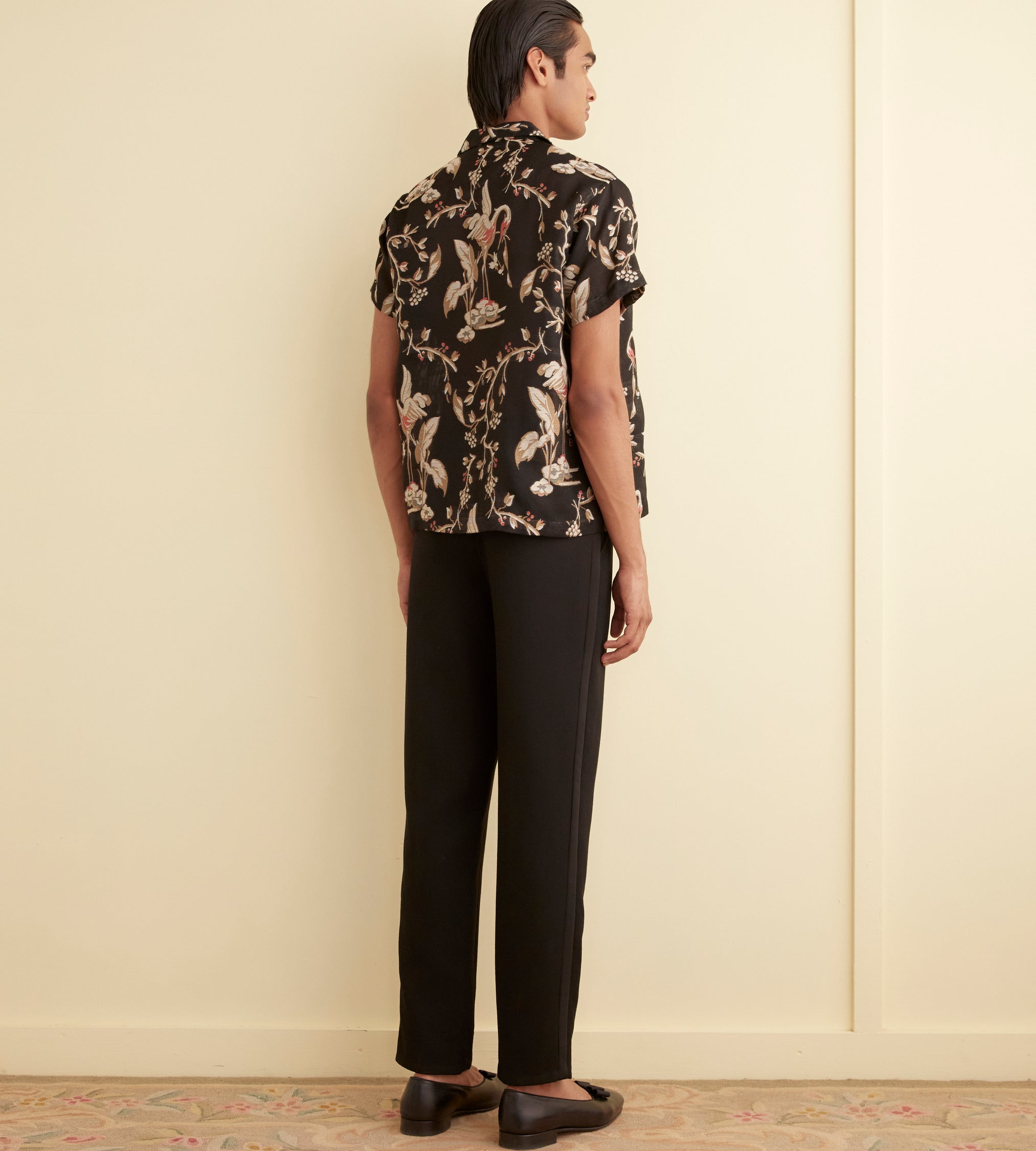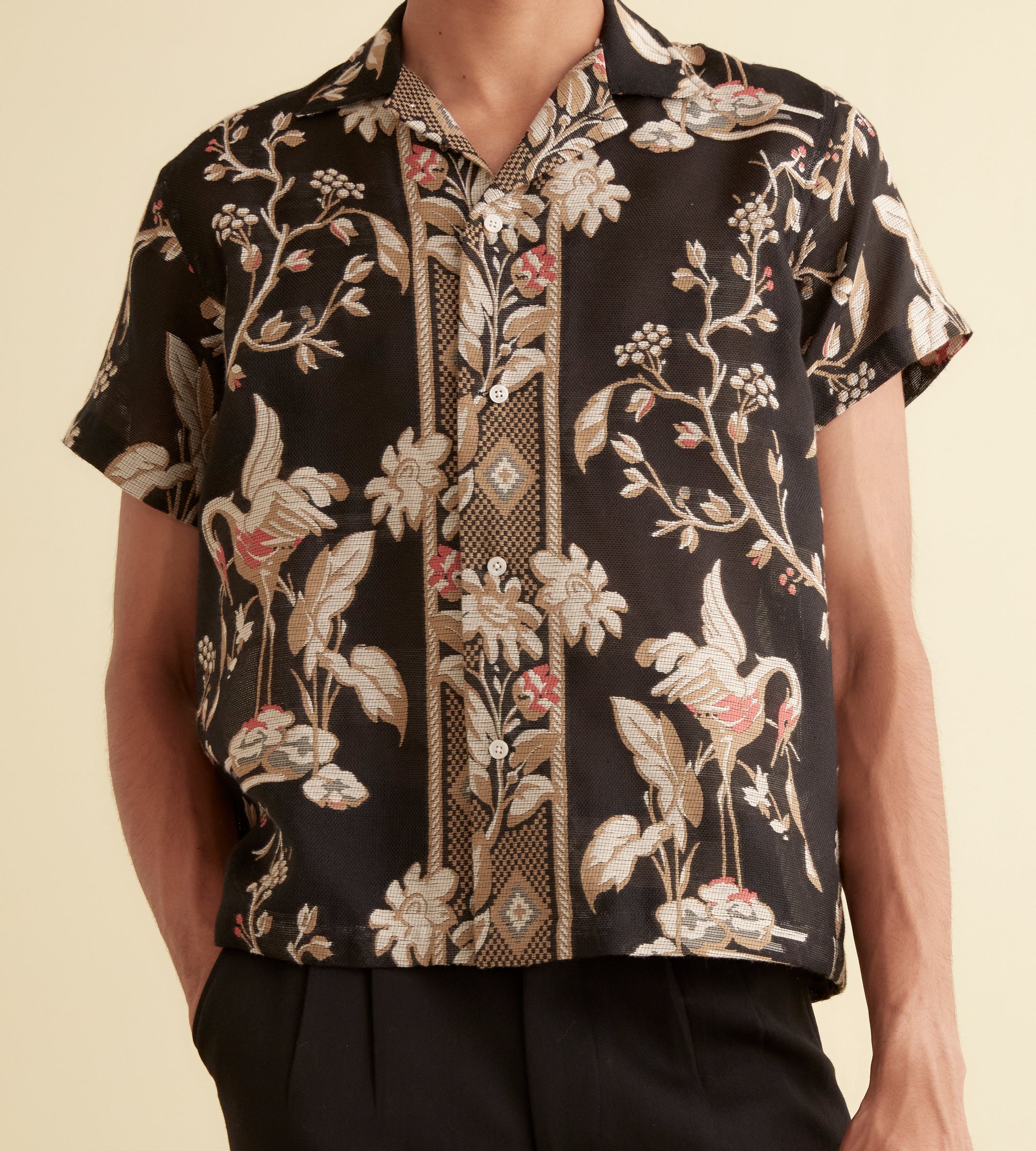This shirt is inspired by a 1940s tablecloth. We reproduced the pattern—cranes and flowers woven in cream, coral, and bronze—for this style. The shirt has a heavy handfeel and is ever-so-slightly sheer. Available in short and long sleeve.