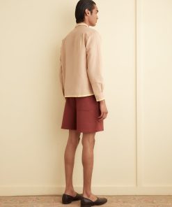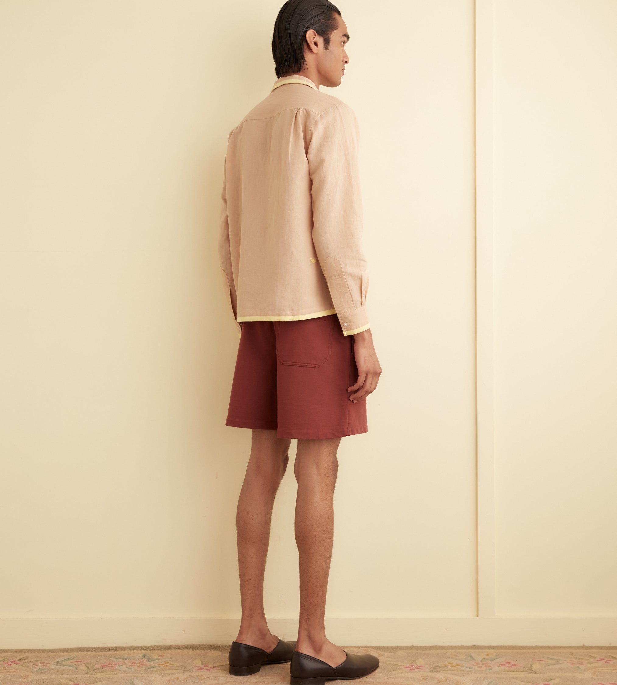 This shirt is inspired by a souvenir bag from the 1930s-1950s. The original bag featured the ship appliqué and contrast bias tape, both of which are reproduced here. Each piece of the appliqué is hand-cut and hand-applied.
