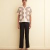 This shirt is inspired by a souvenir bag from the 1930s-1950s. The original bag featured the ship appliqué and contrast bias tape, both of which are reproduced here. Each piece of the appliqué is hand-cut and hand-applied.