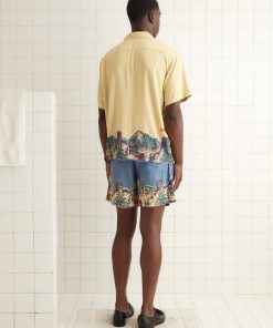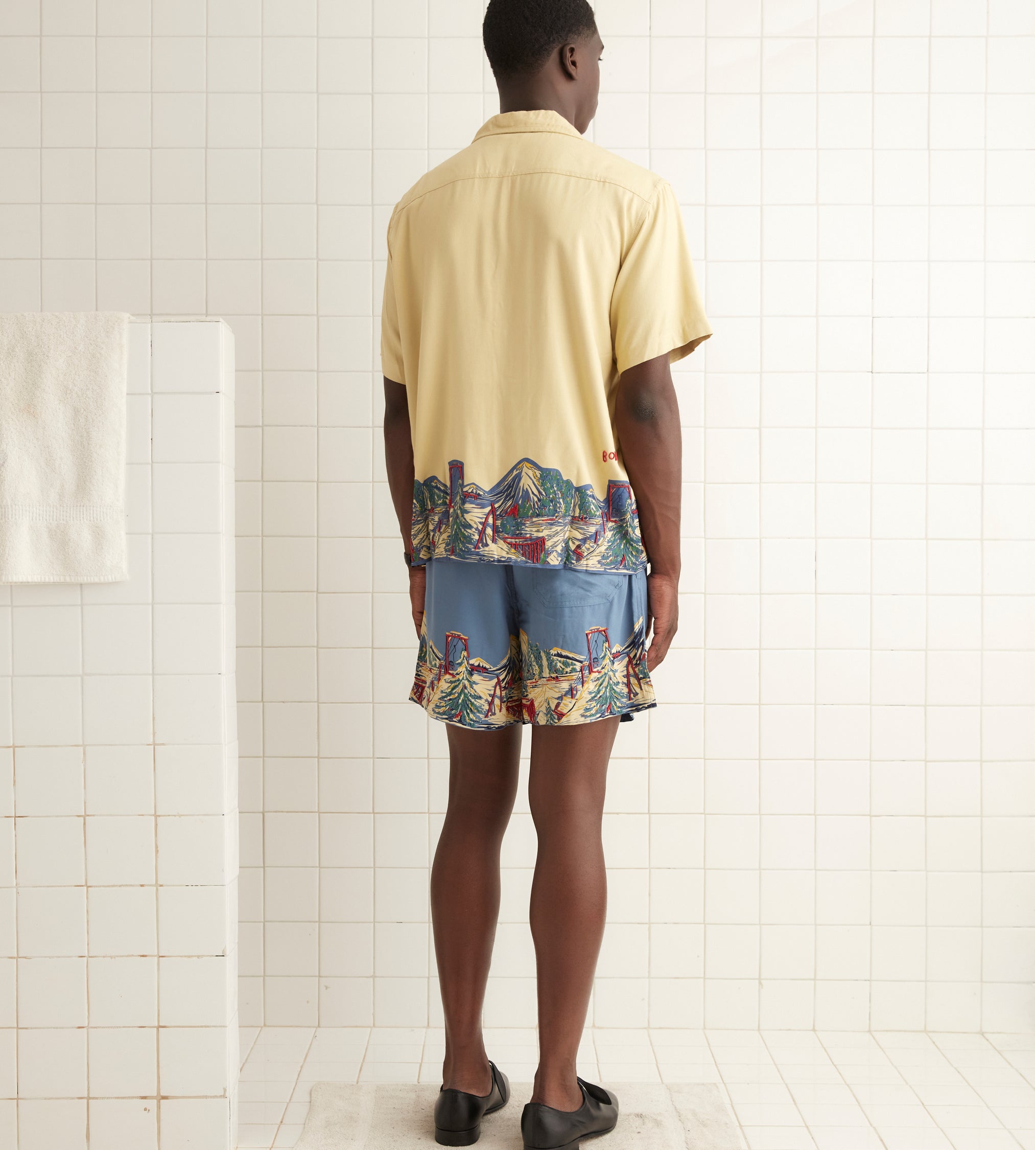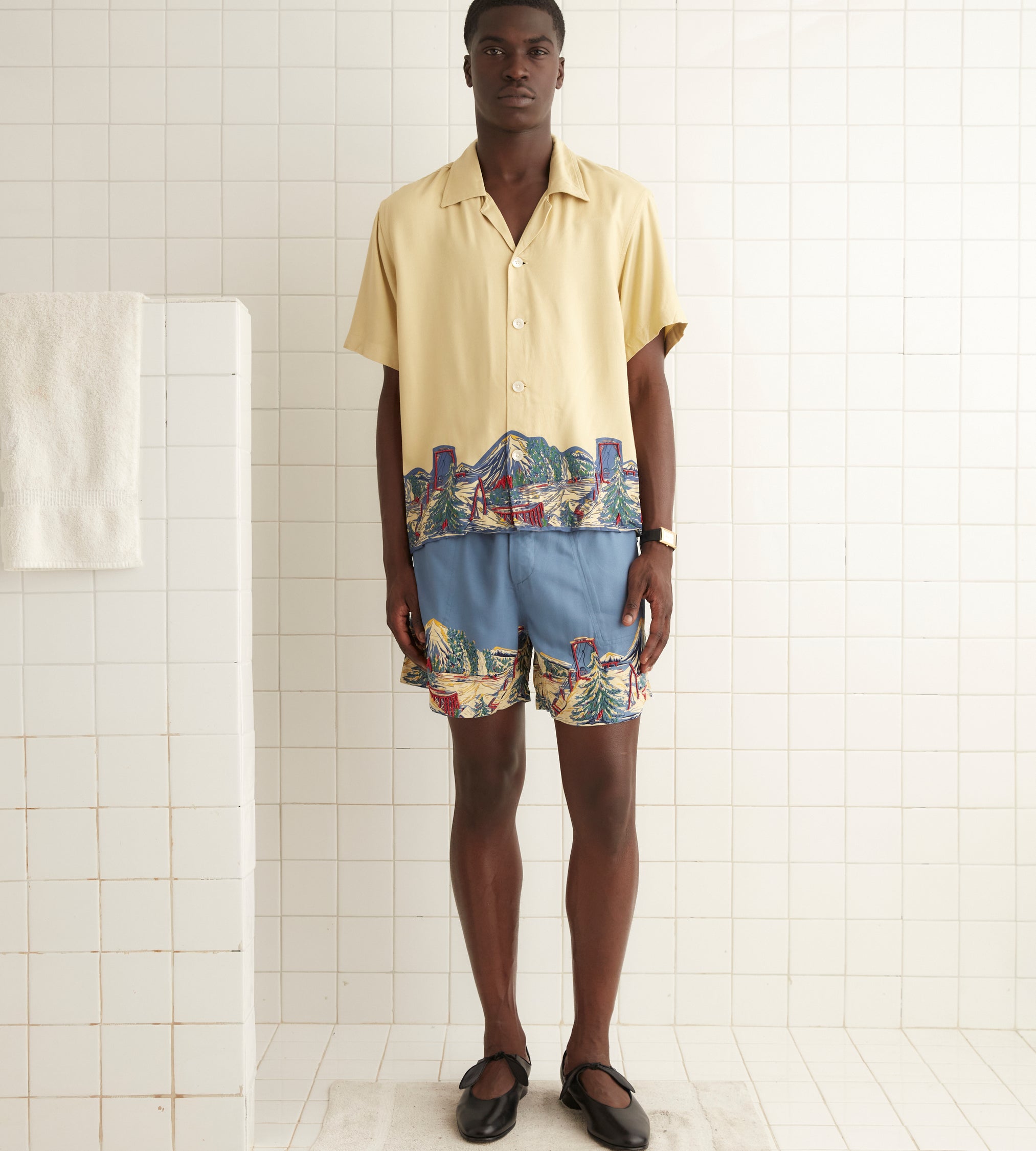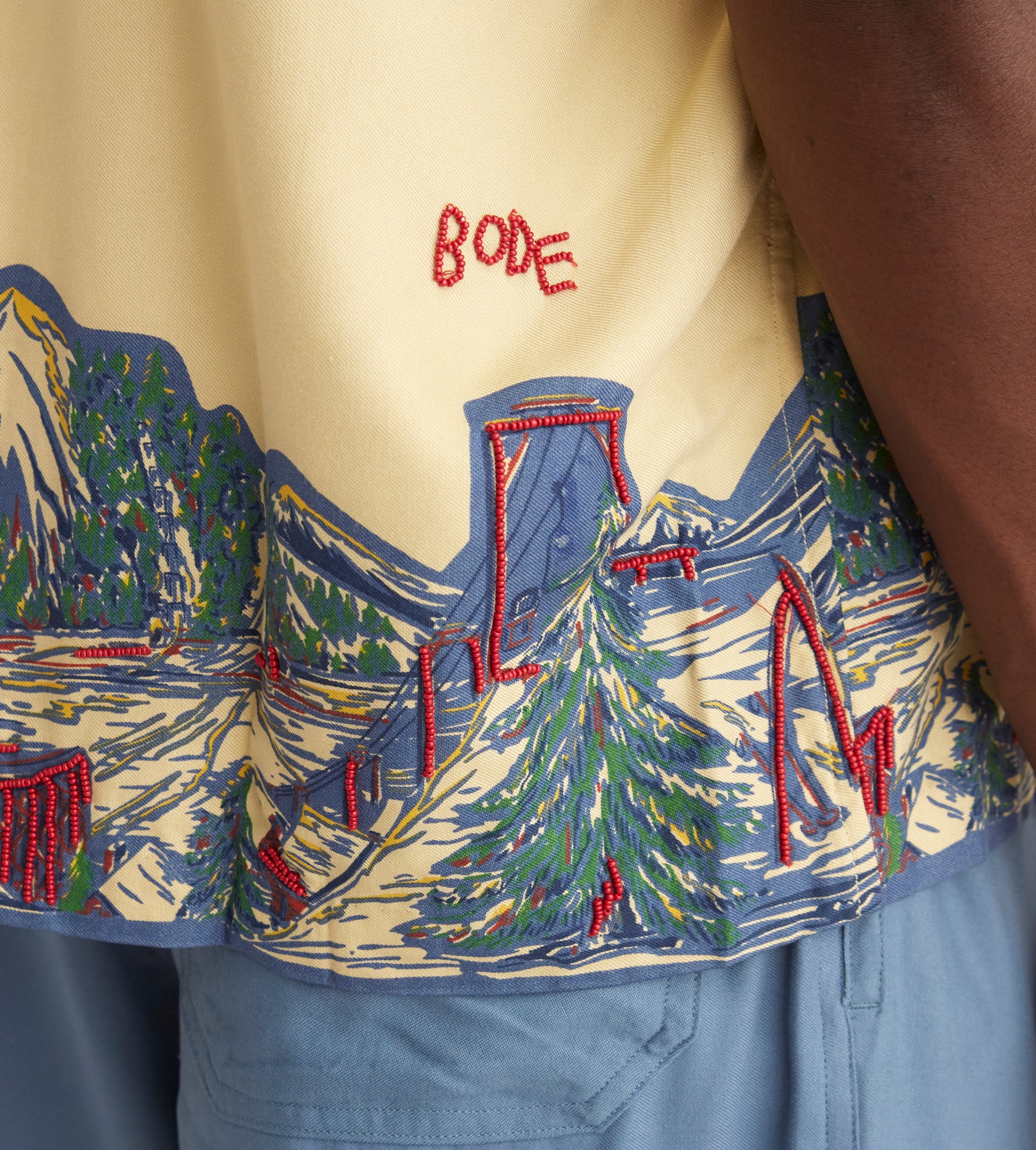 This shirt is inspired by deadstock yardage from the 1950s-1960s, which featured this printed ski-mountain scene. We reproduced the fabric for this style, which is embellished with decorative beadwork.