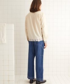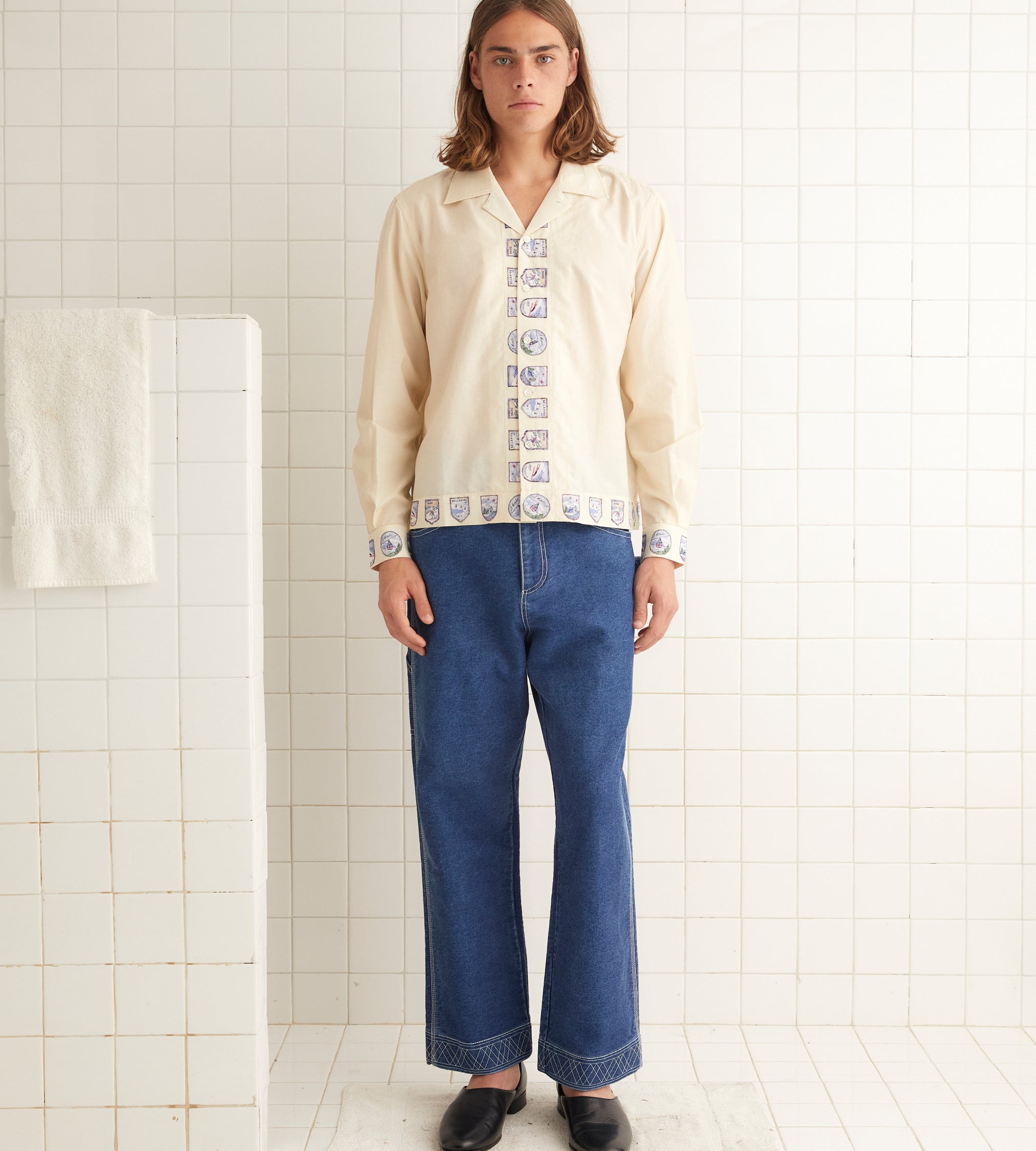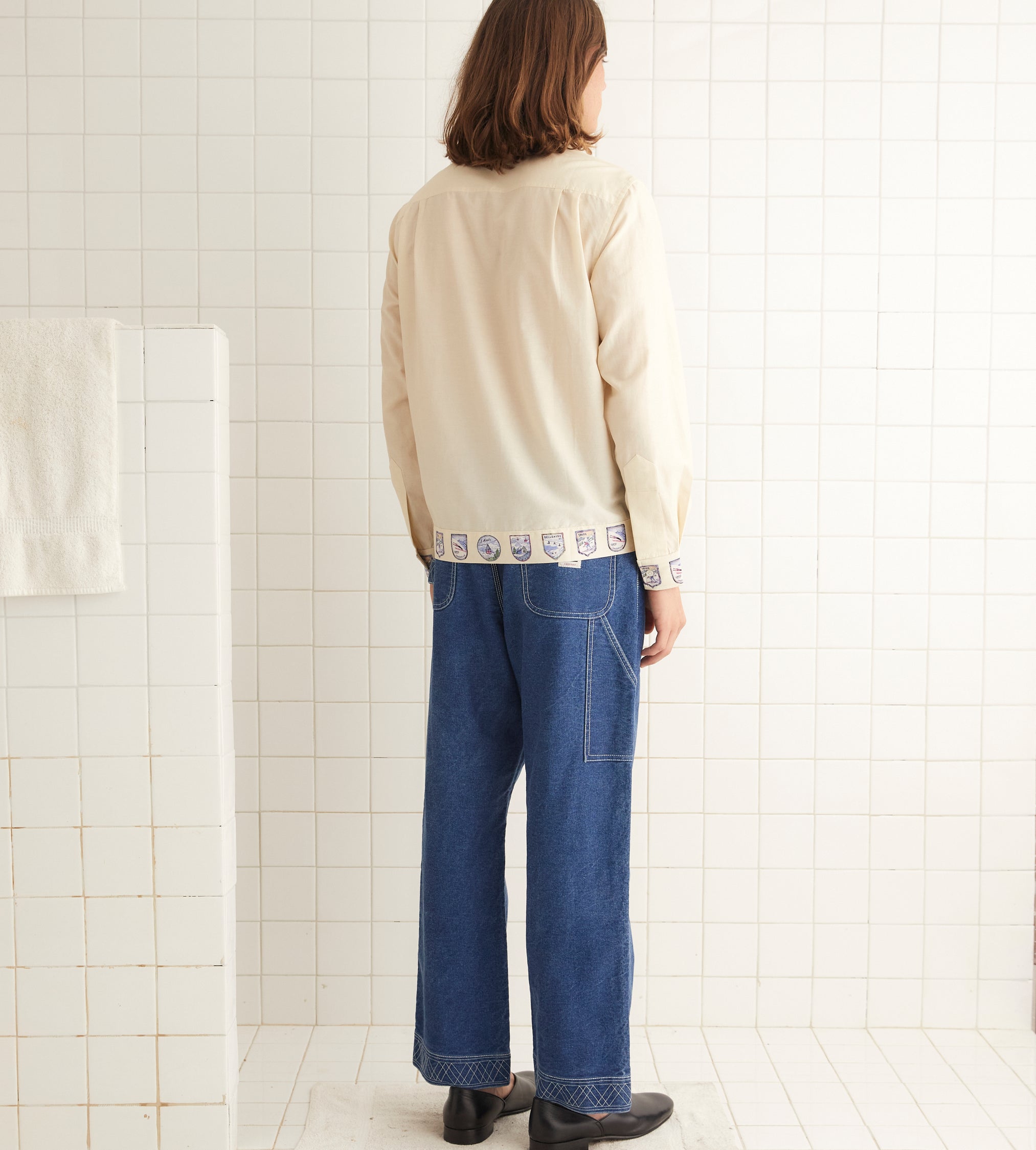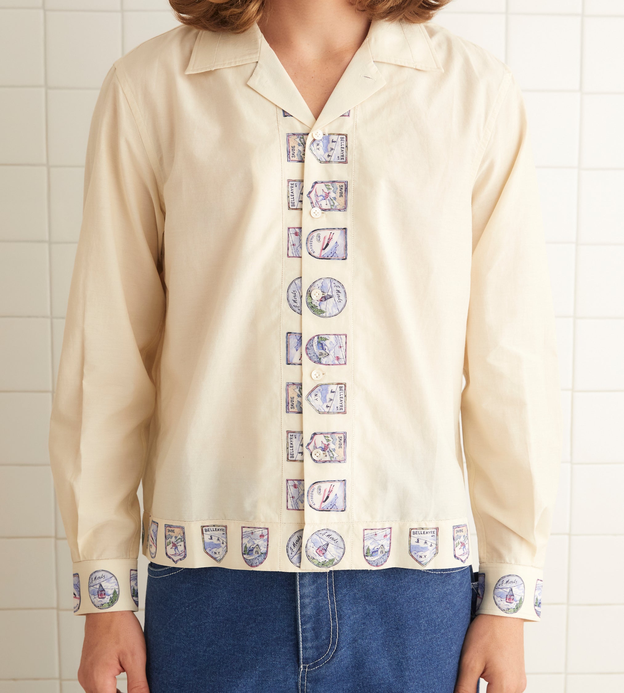 This shirt is inspired by a handkerchief from the 1940s, which was patterned with crests. We reproduced the pattern for this style with illustrations of skiing destinations.