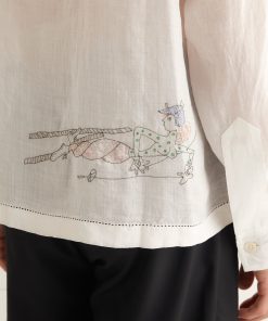 This shirt is inspired by a scarf from the midcentury, which was printed with tumbling skiers. We reproduced the motifs in delicate, single-thread embroidery. The shirt is made of lightweight linen and has picot detaling along the hem.