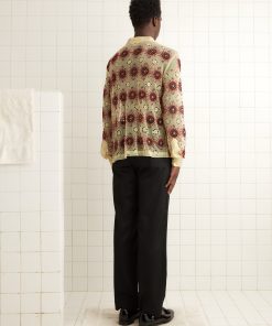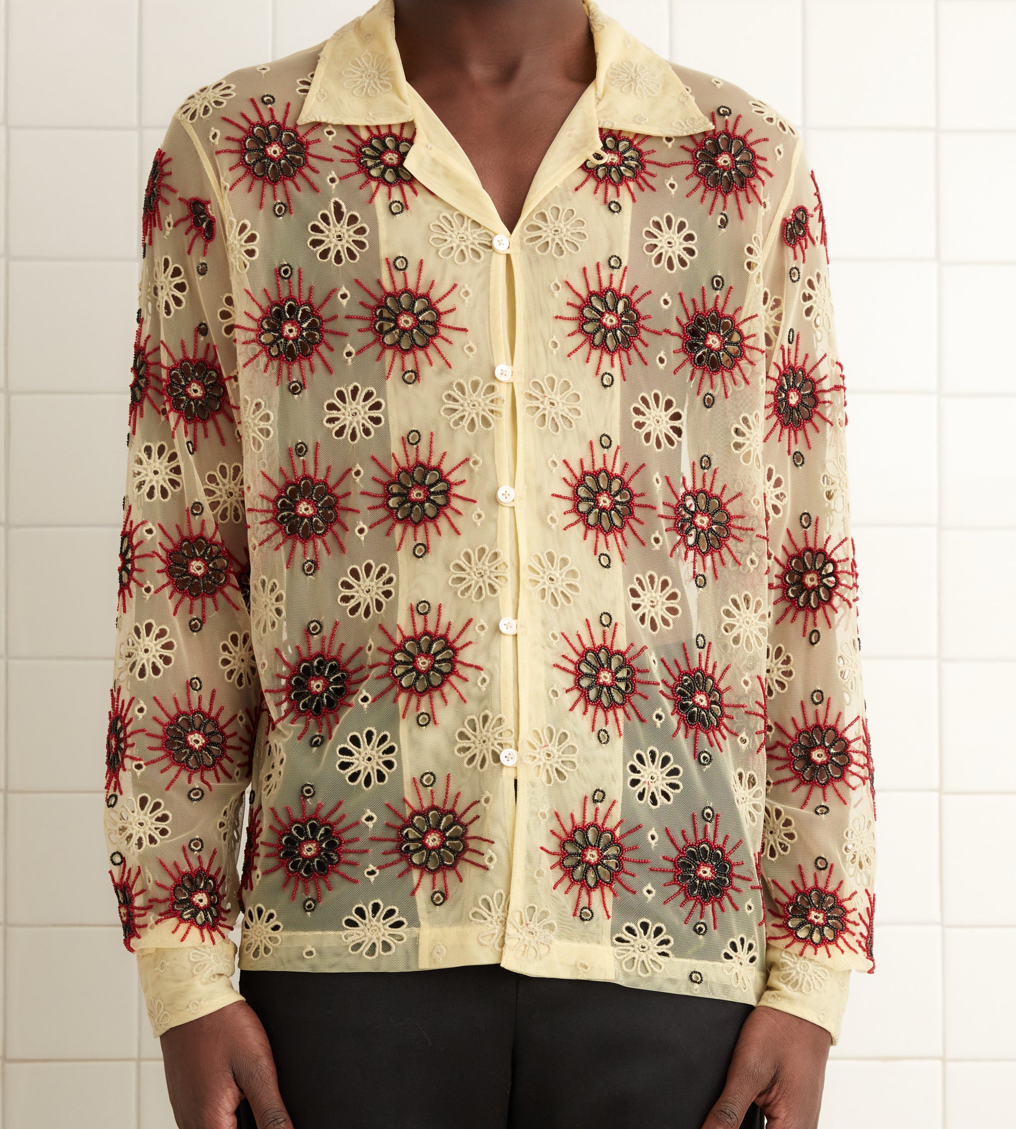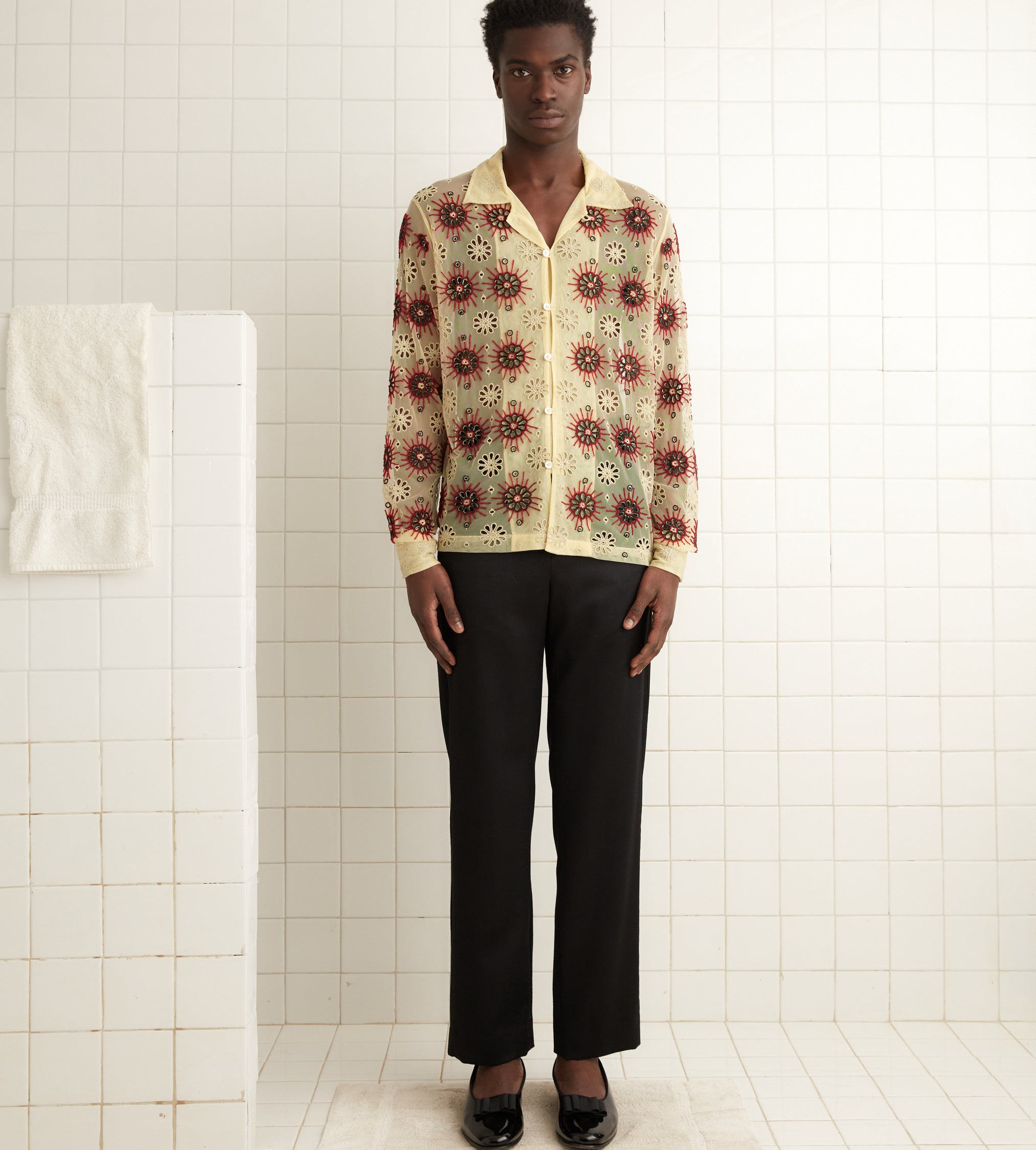 This shirt is inspired by a scrap of beaded yardage from the 1930s. We reproduced the fabric, a fine ecru mesh with beaded floral eyelets, for this style. All beadwork is done by hand.