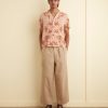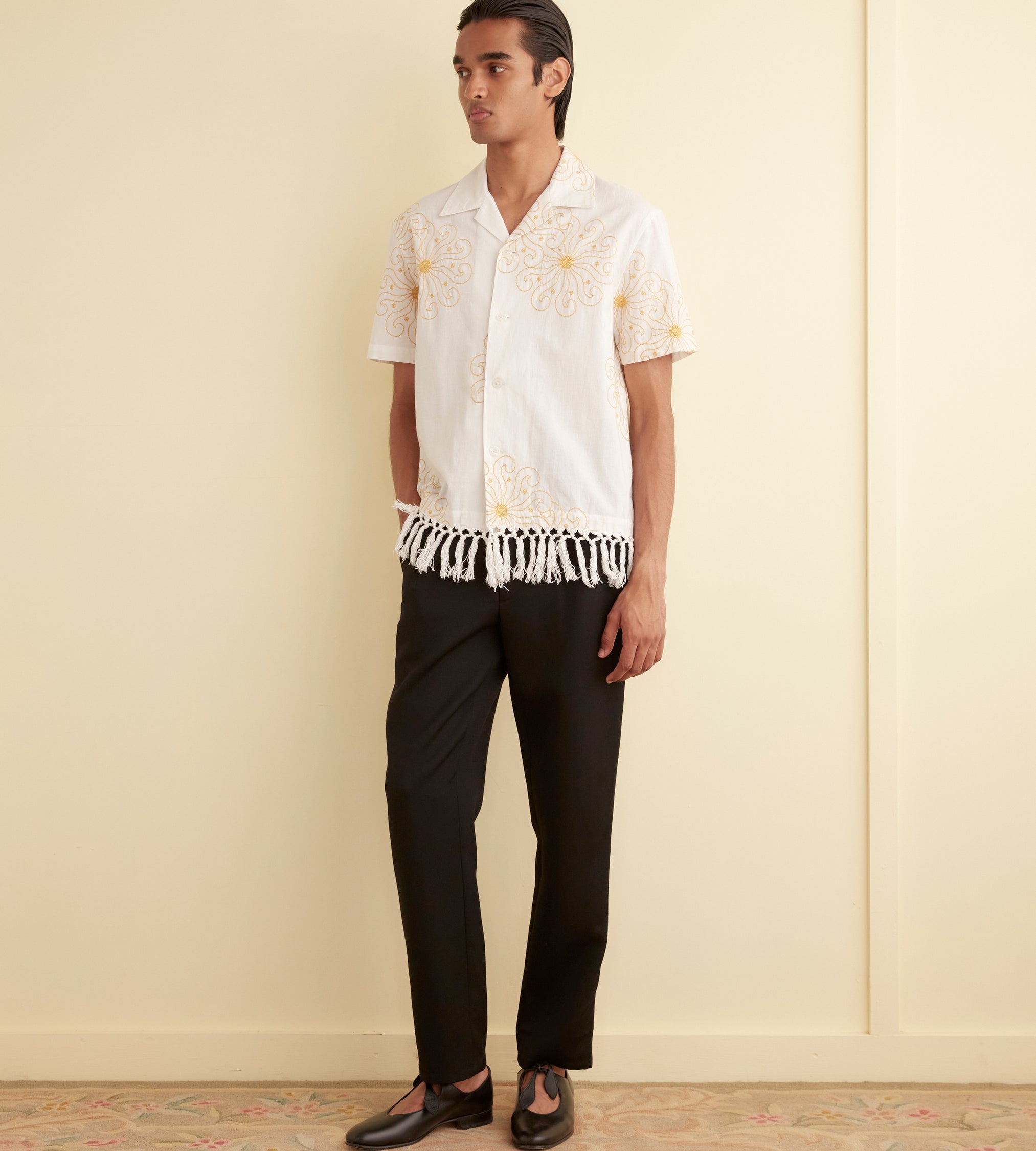 This shirt is inspired by a 1950s-1960s embroidered tablecloth. The sunburst pattern has been replicated here with stem-stitched embroidery and fringe at the hem.