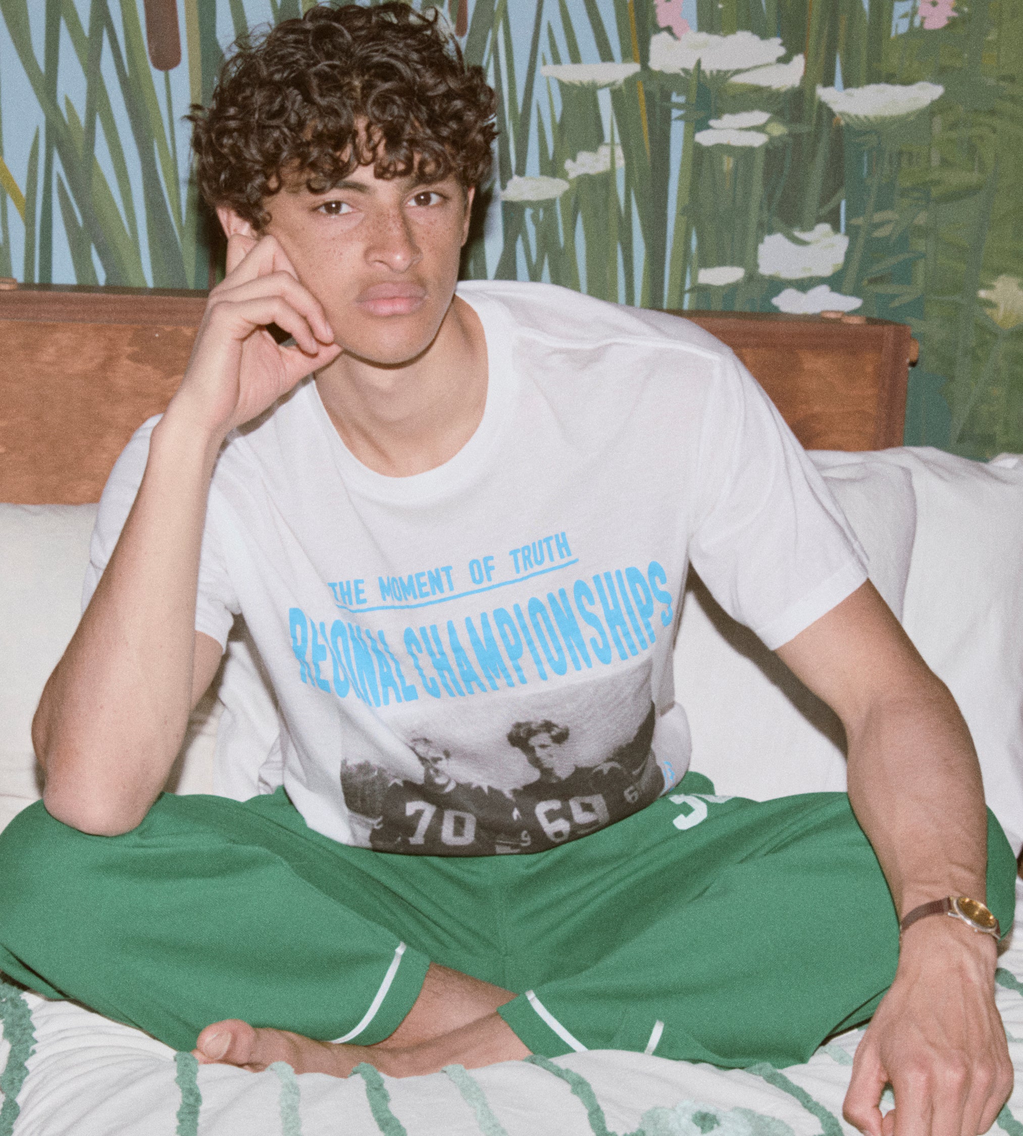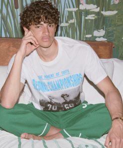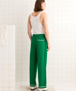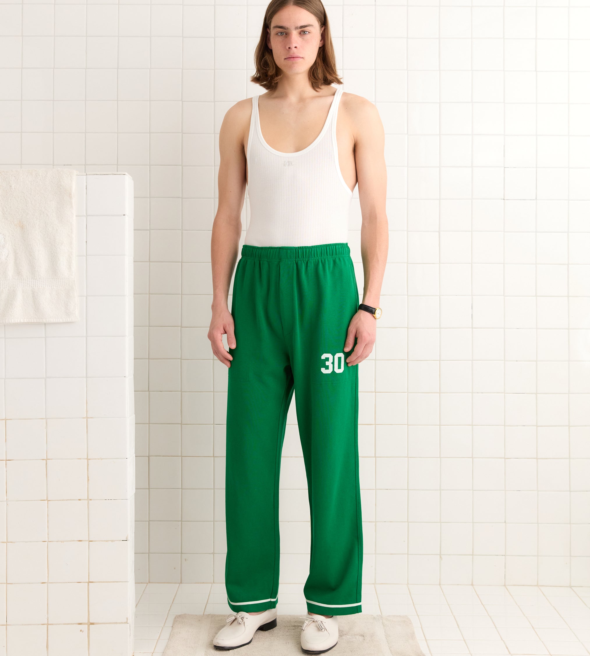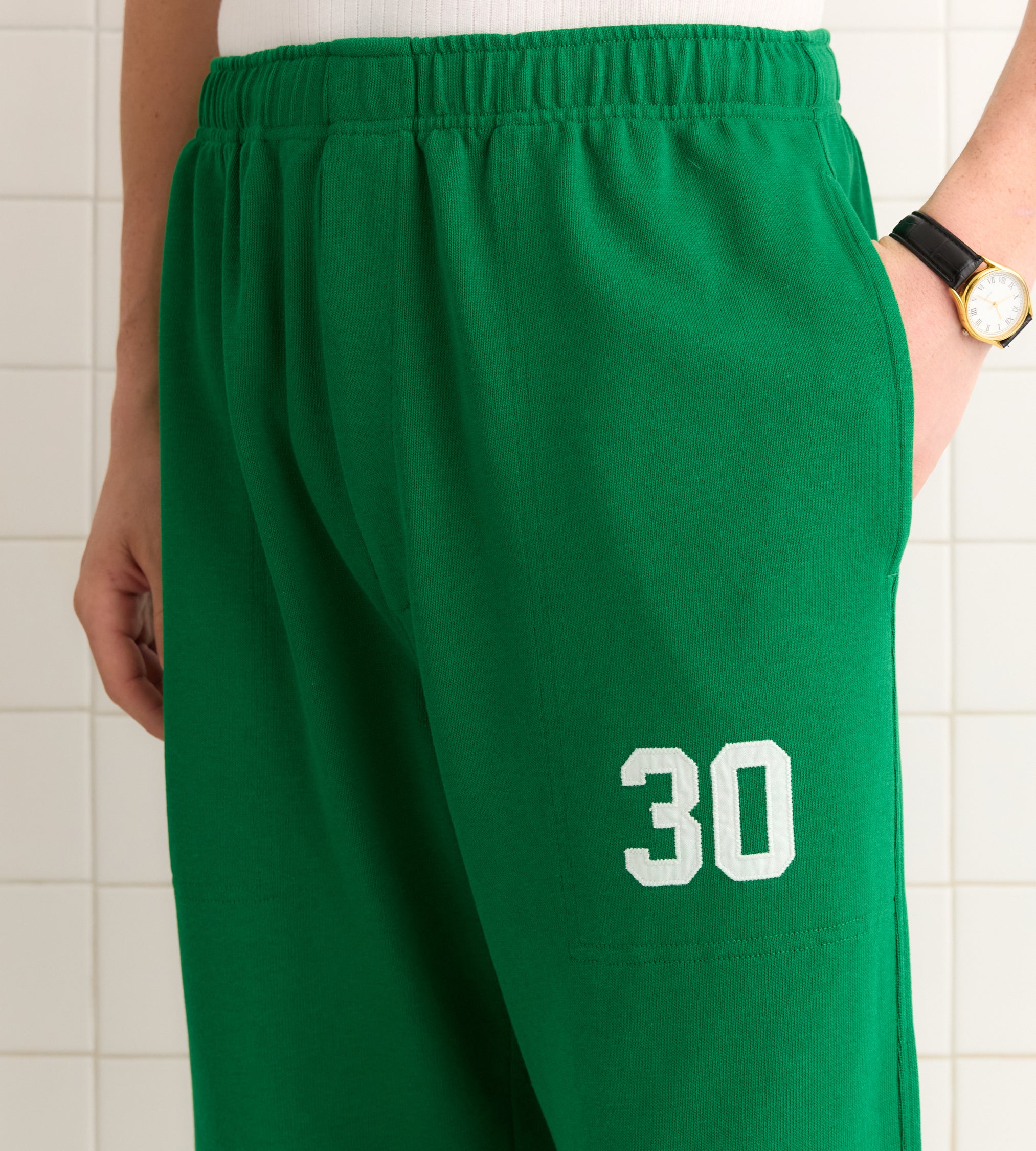 These sweatpants are inspired by a jacket from a 1950s school club. We reproduced the green-and-white trim for this style, which is appliquéd with the number 30. The pants are made from a silky, heavyweight fabric reproduced from vintage jerseys.