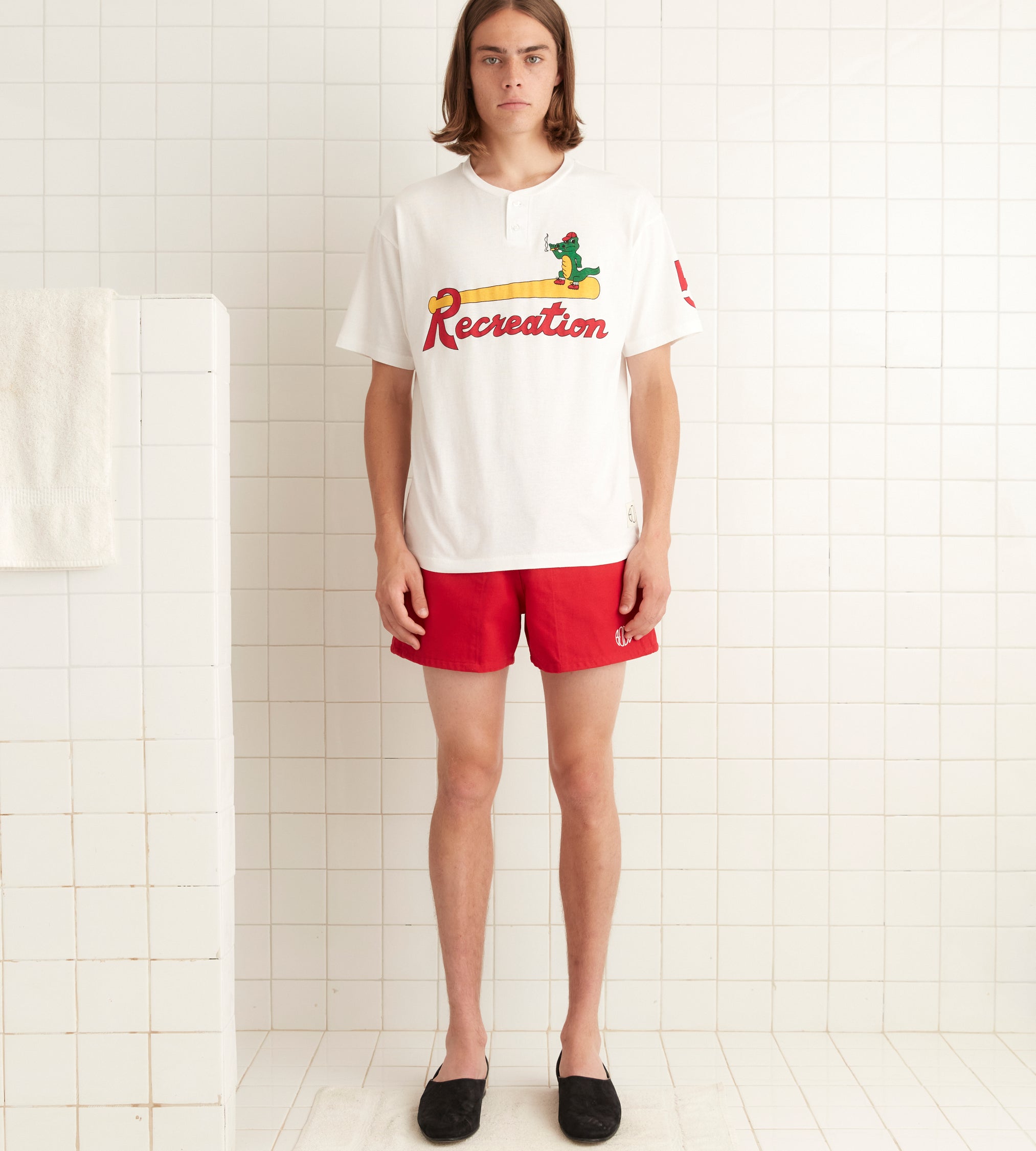 This style is inspired by 1980s rugby shorts from New Zealand. We reproduced the silhouette, with its short inseam and wide leg opening, in heavyweight cotton twill. The shorts are embroidered with a Bode logo.