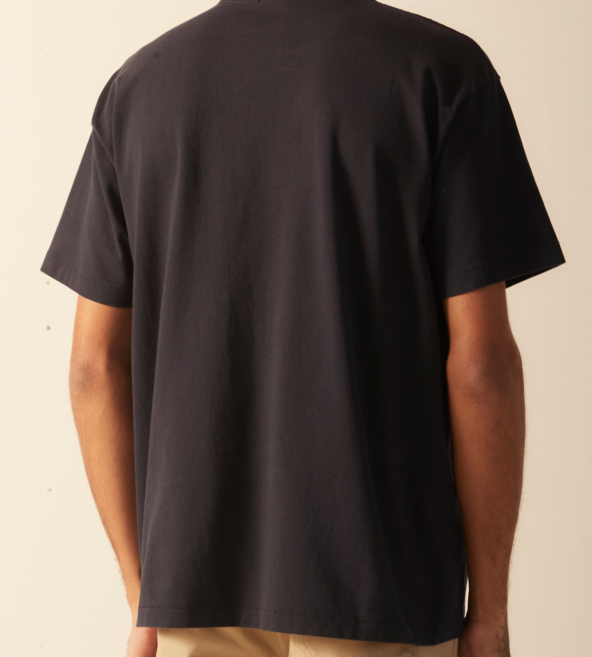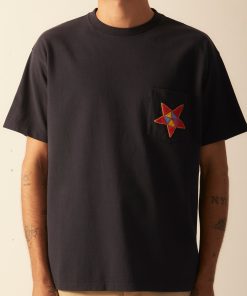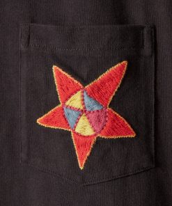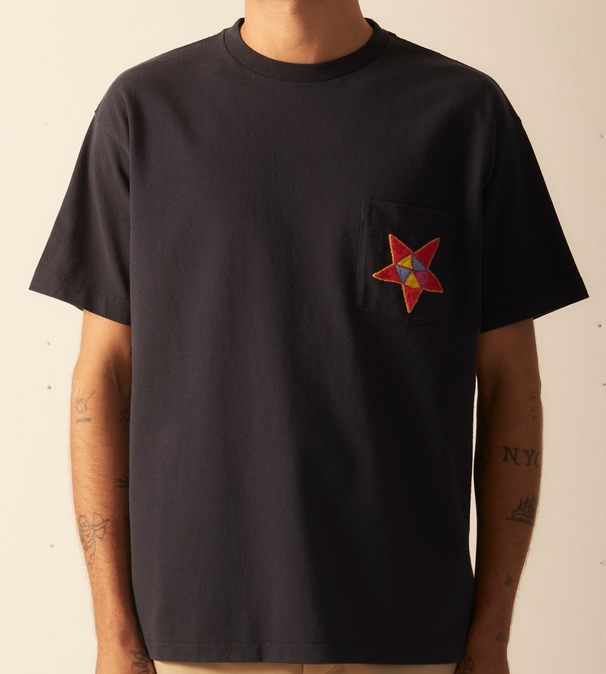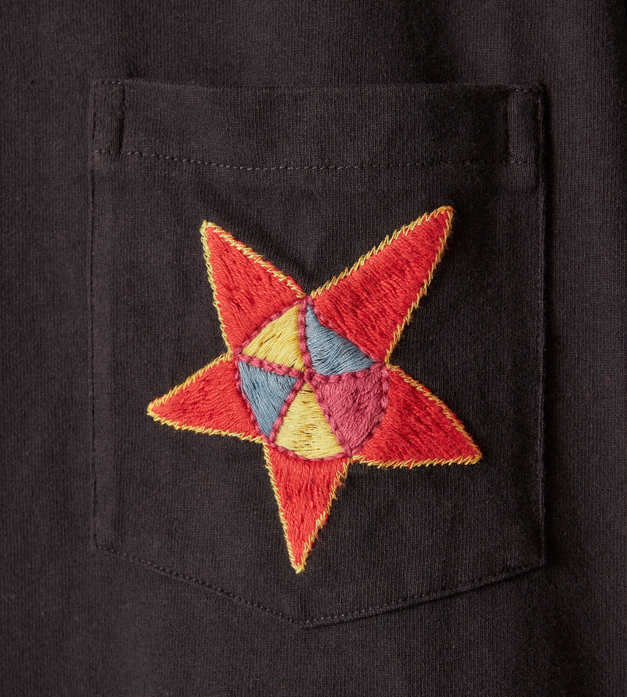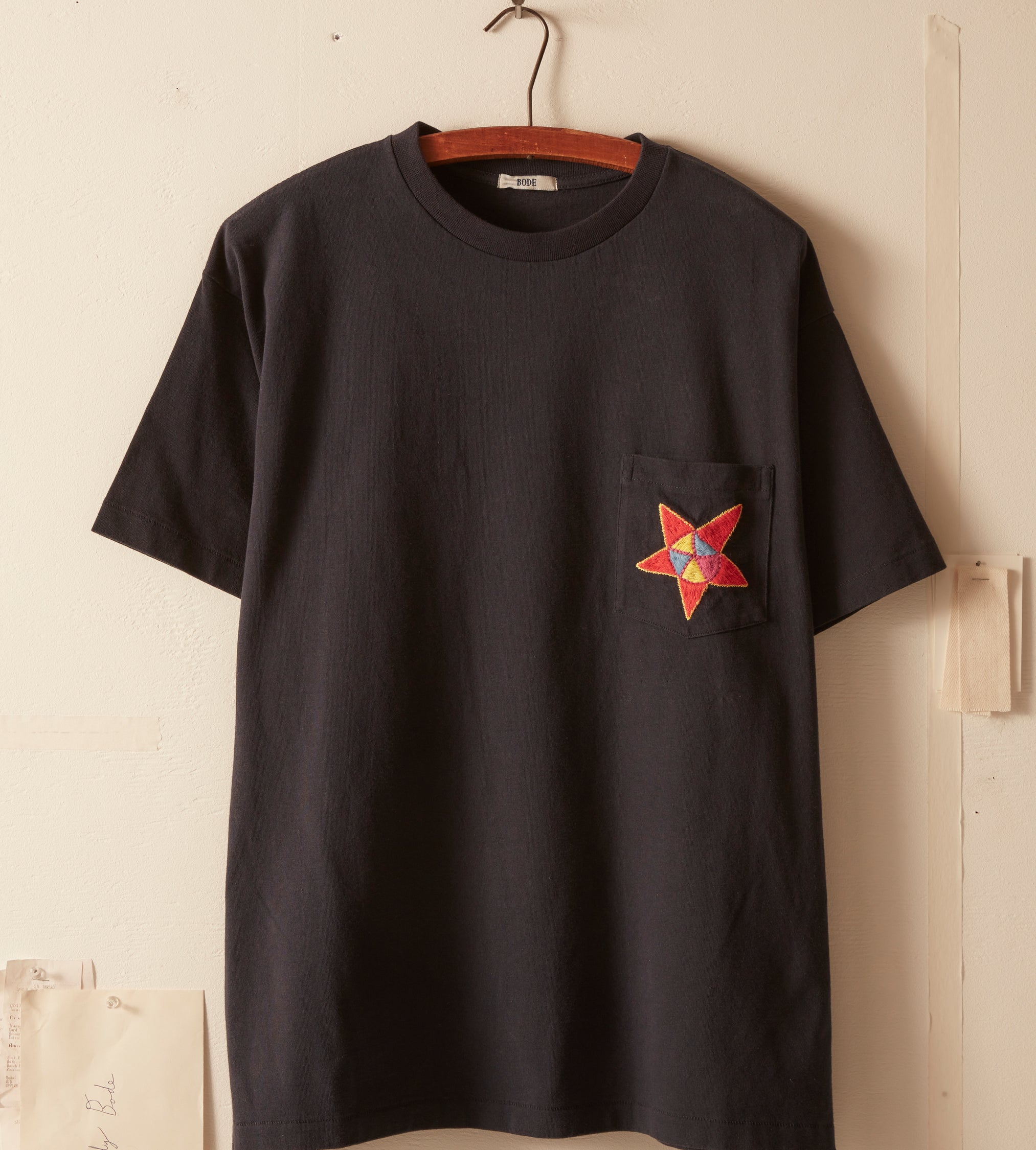 This short sleeve tee is inspired by a Children’s tee, circa 1970s. The embroidery on the pocket is a reproduction of a star found on a souvenir tee made in India and imported by a California company for the US market.