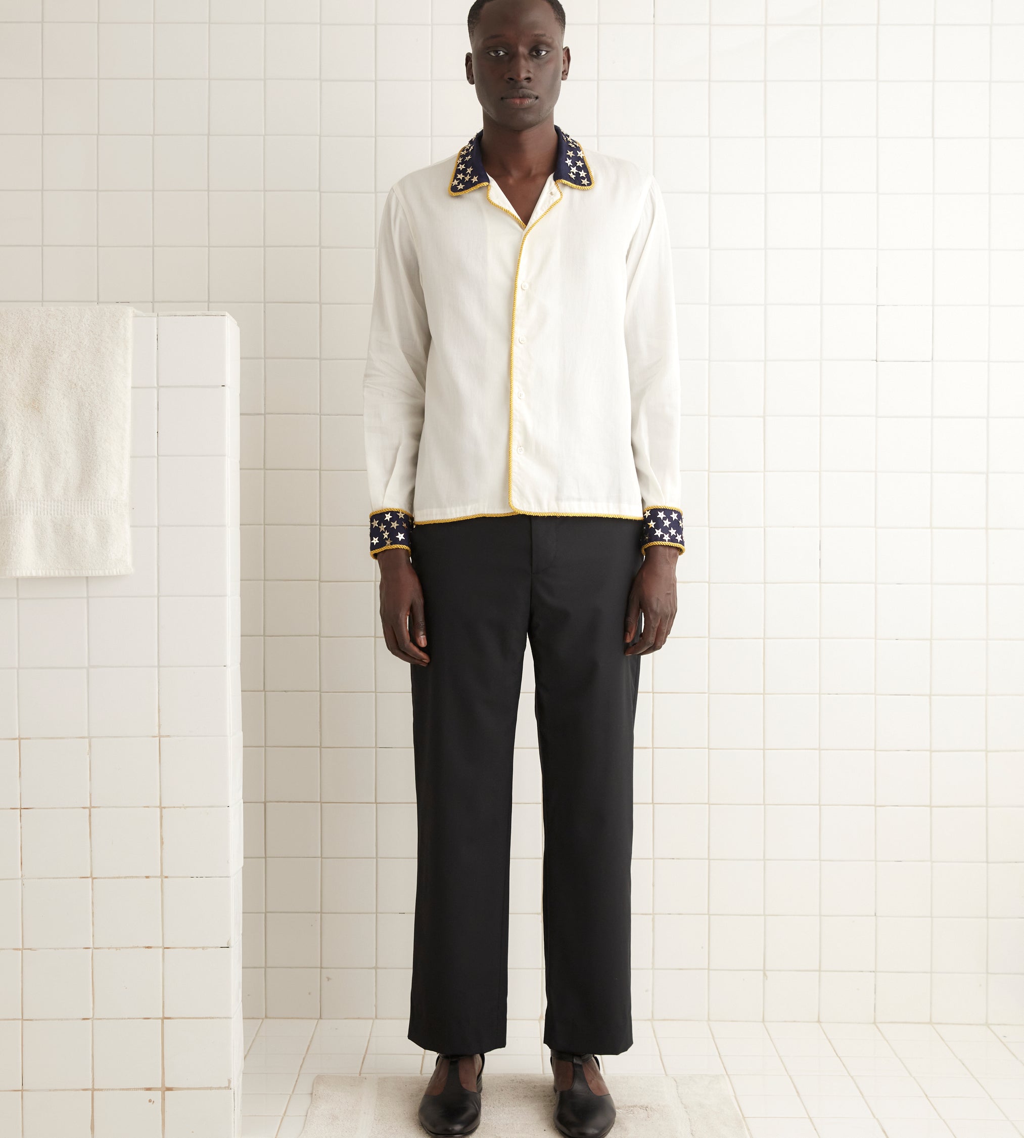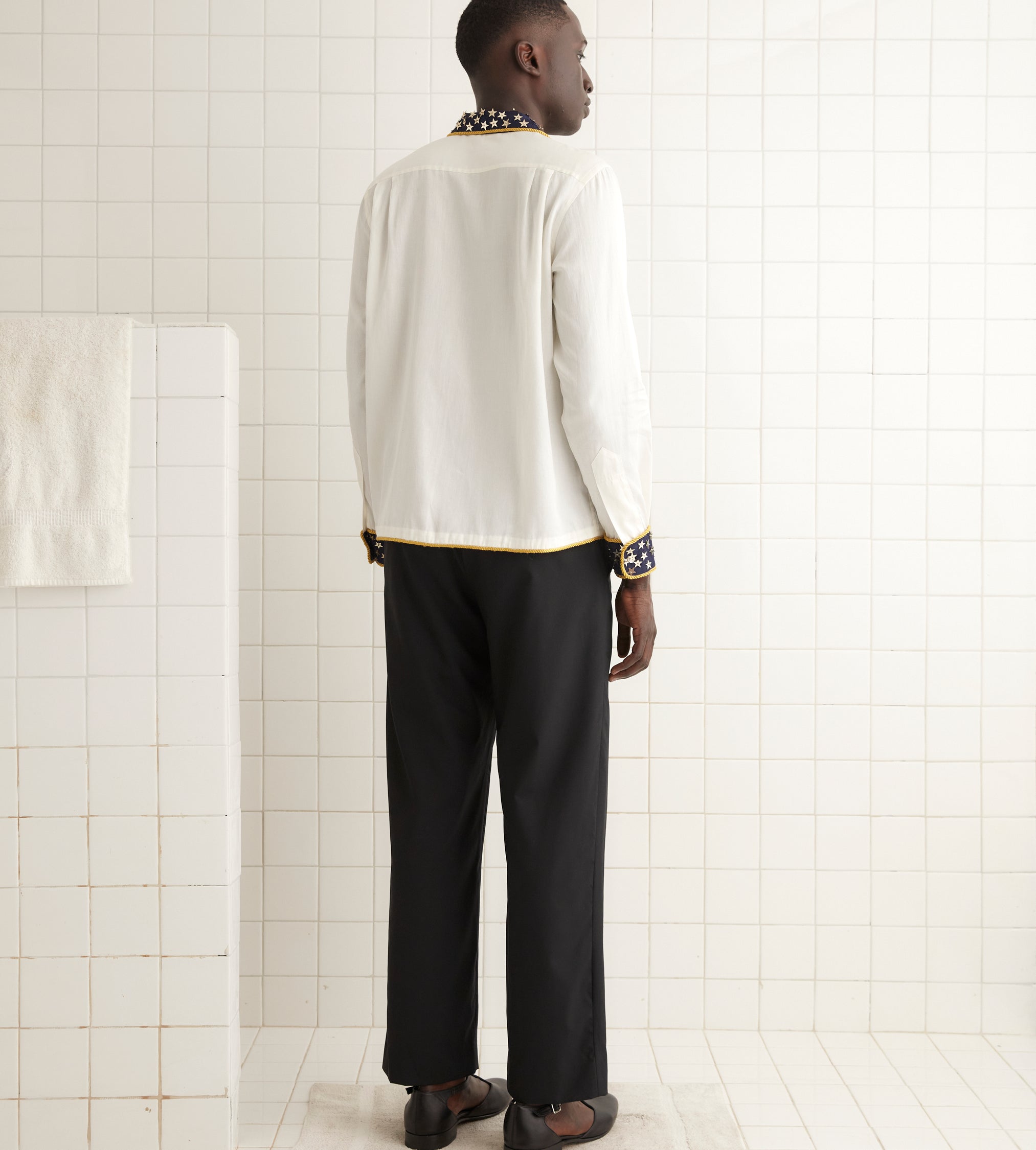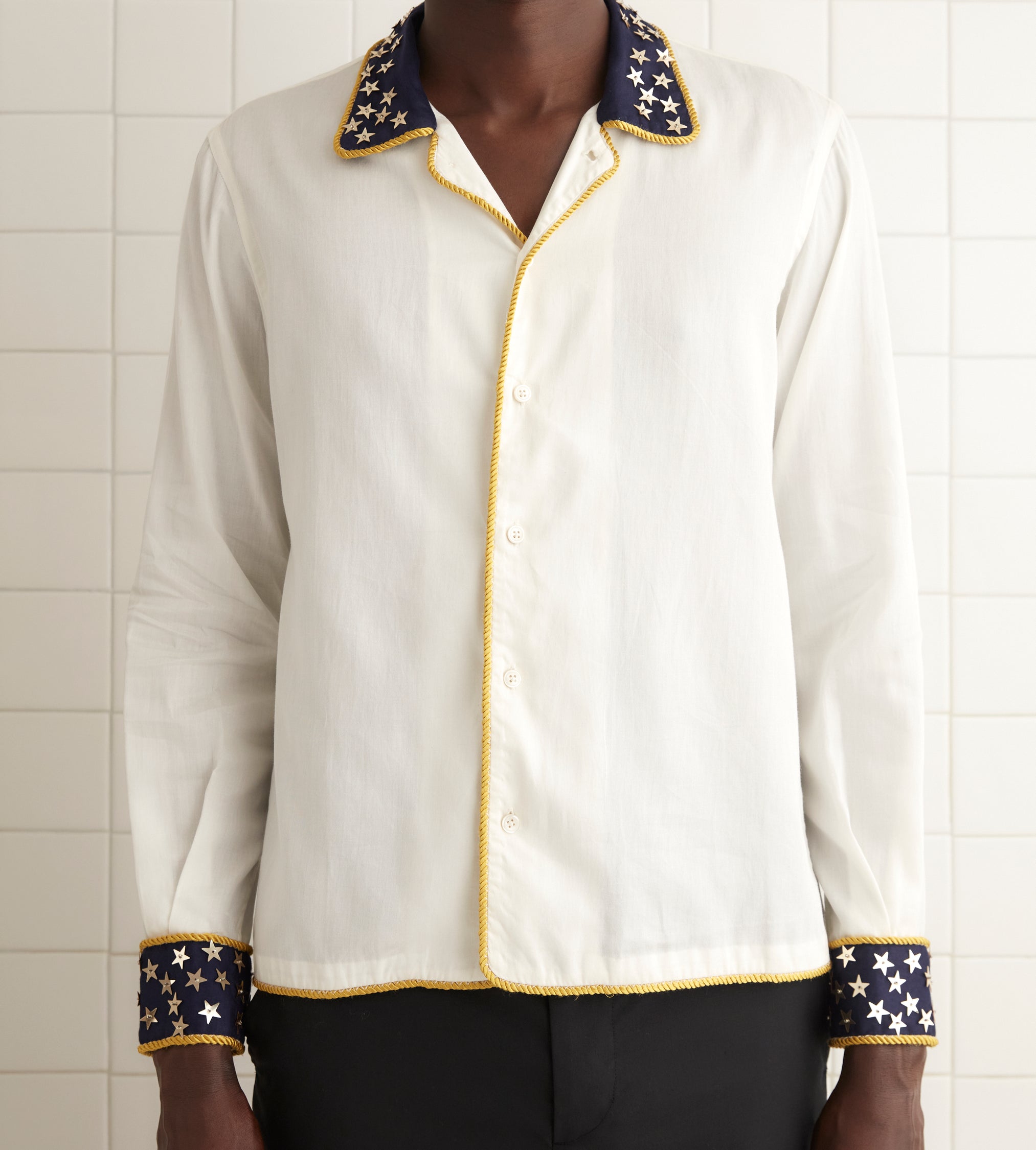 This shirt is inspired by a costume dress from the 1930s-1940s. We reproduced the blue contrast collar and cuffs, studded with star sequins, and gold roping trim for this style.