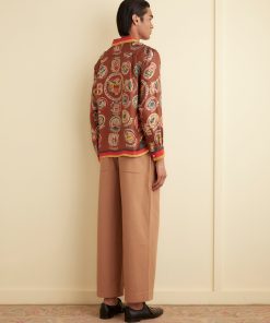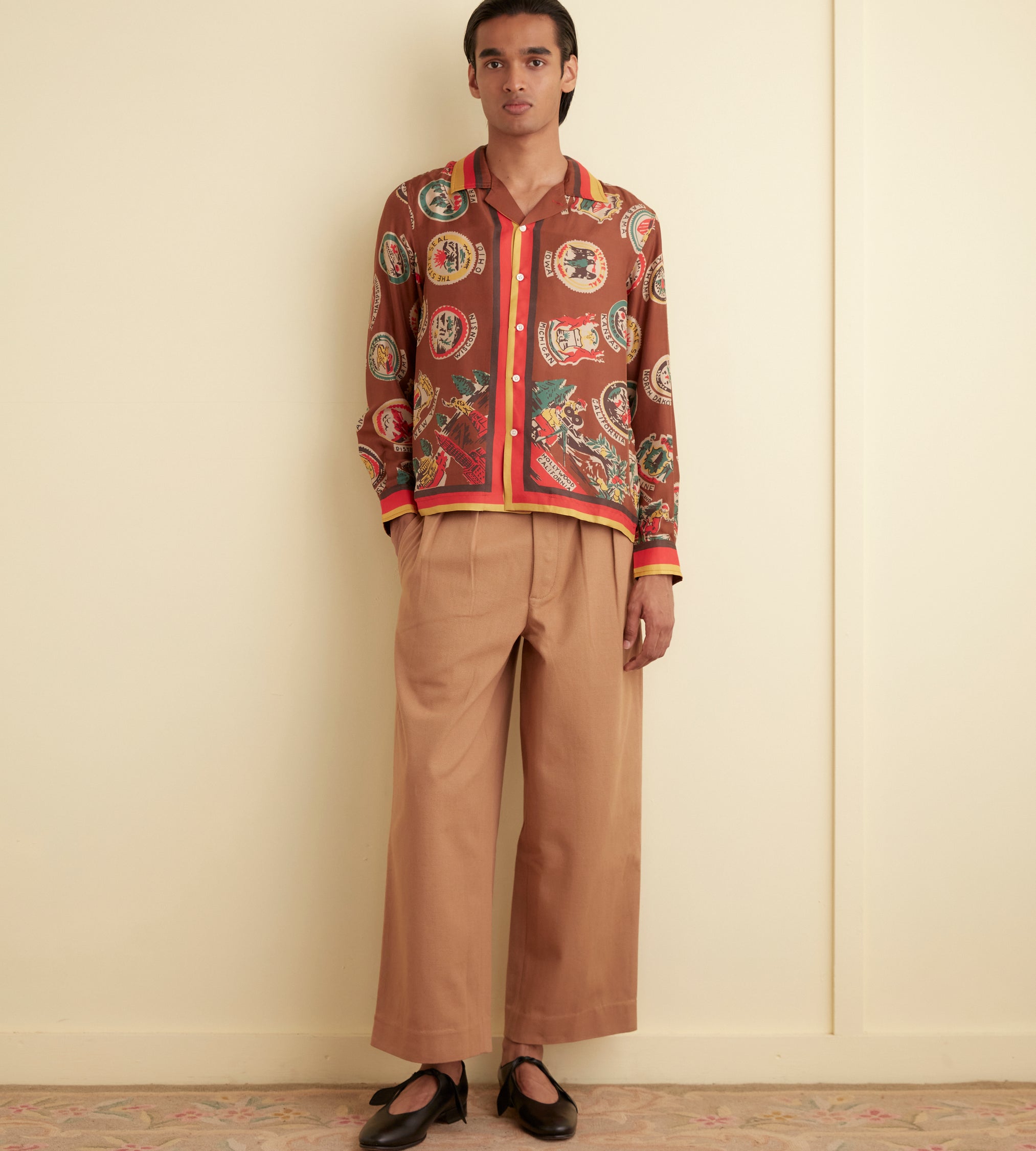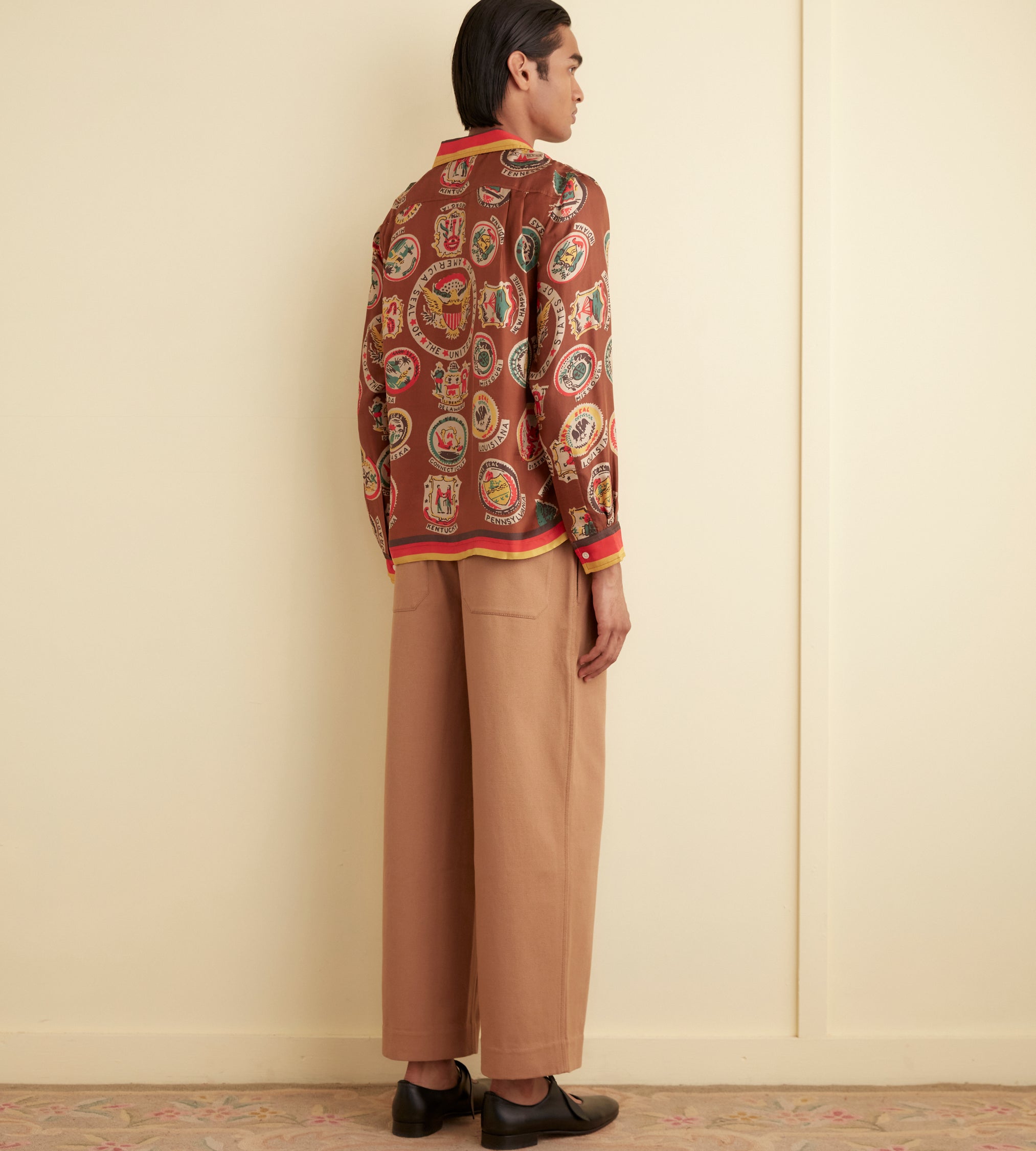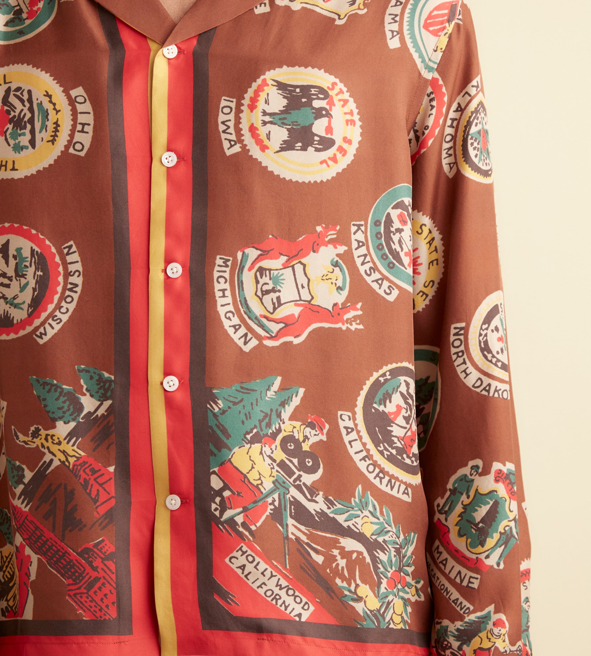 This shirt is inspired by a novelty scarf from the midcentury, printed with state seals. We reproduced the original print for this style.