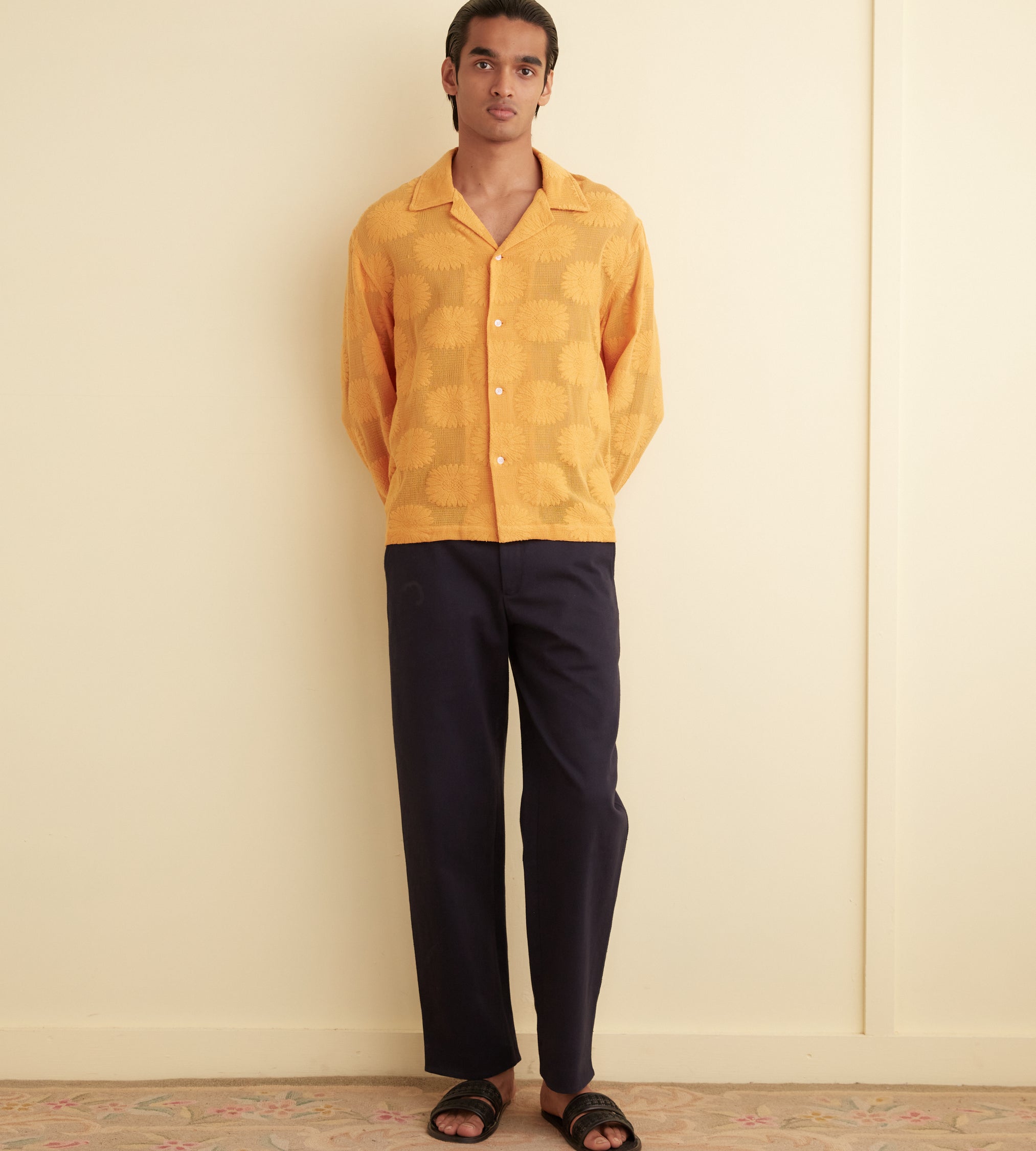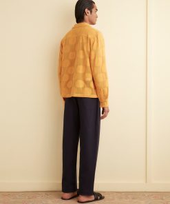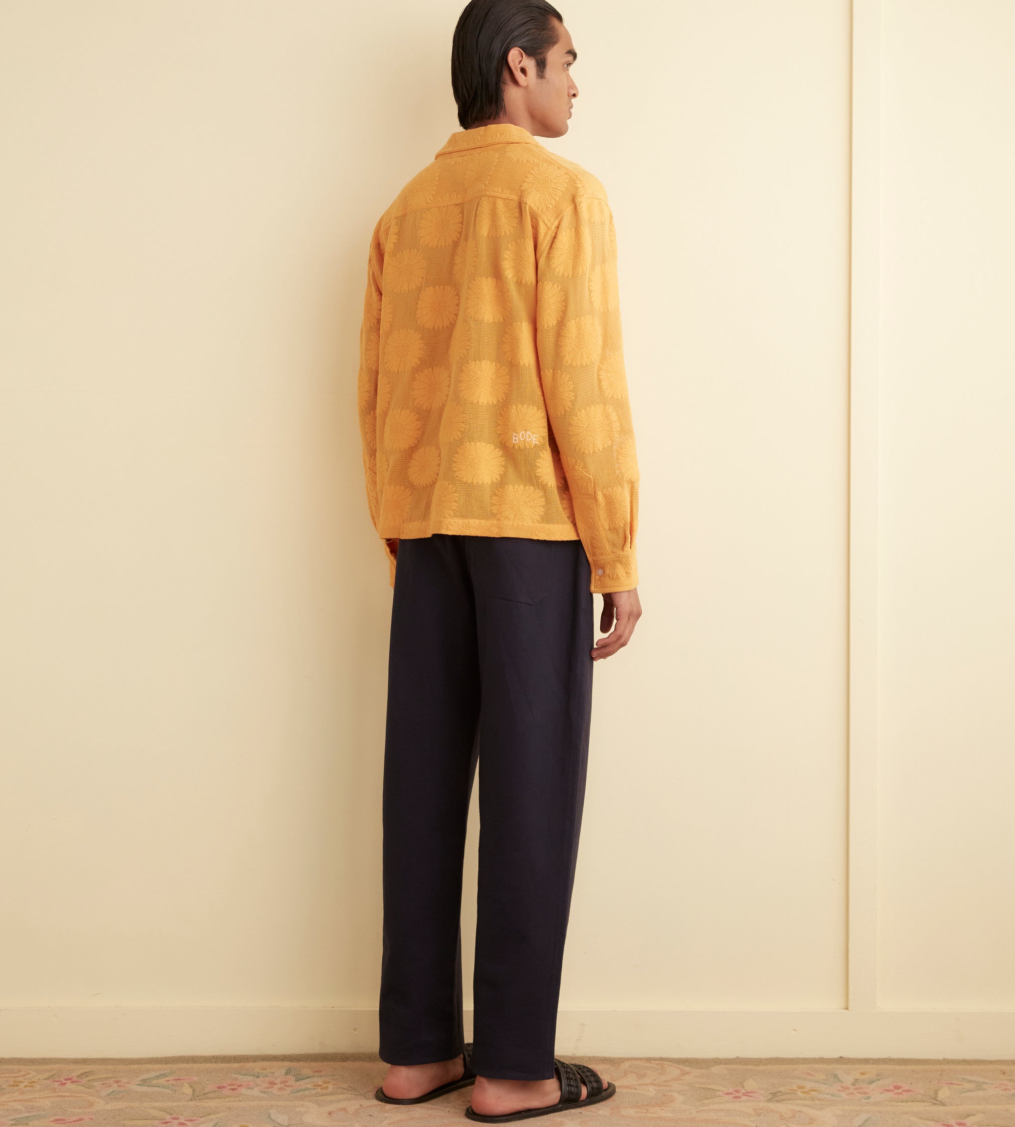 This shirt is inspired by a lace curtain from the 1930s-1950s and is part of Bode’s lace development program. Made of golden lace and patterned with sunflowers, it has a camp collar and a straight hem. The shirt features a hand-embroidered Bode logo on the back.