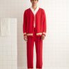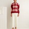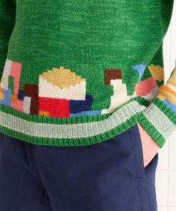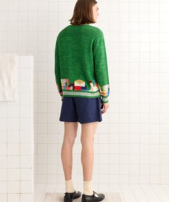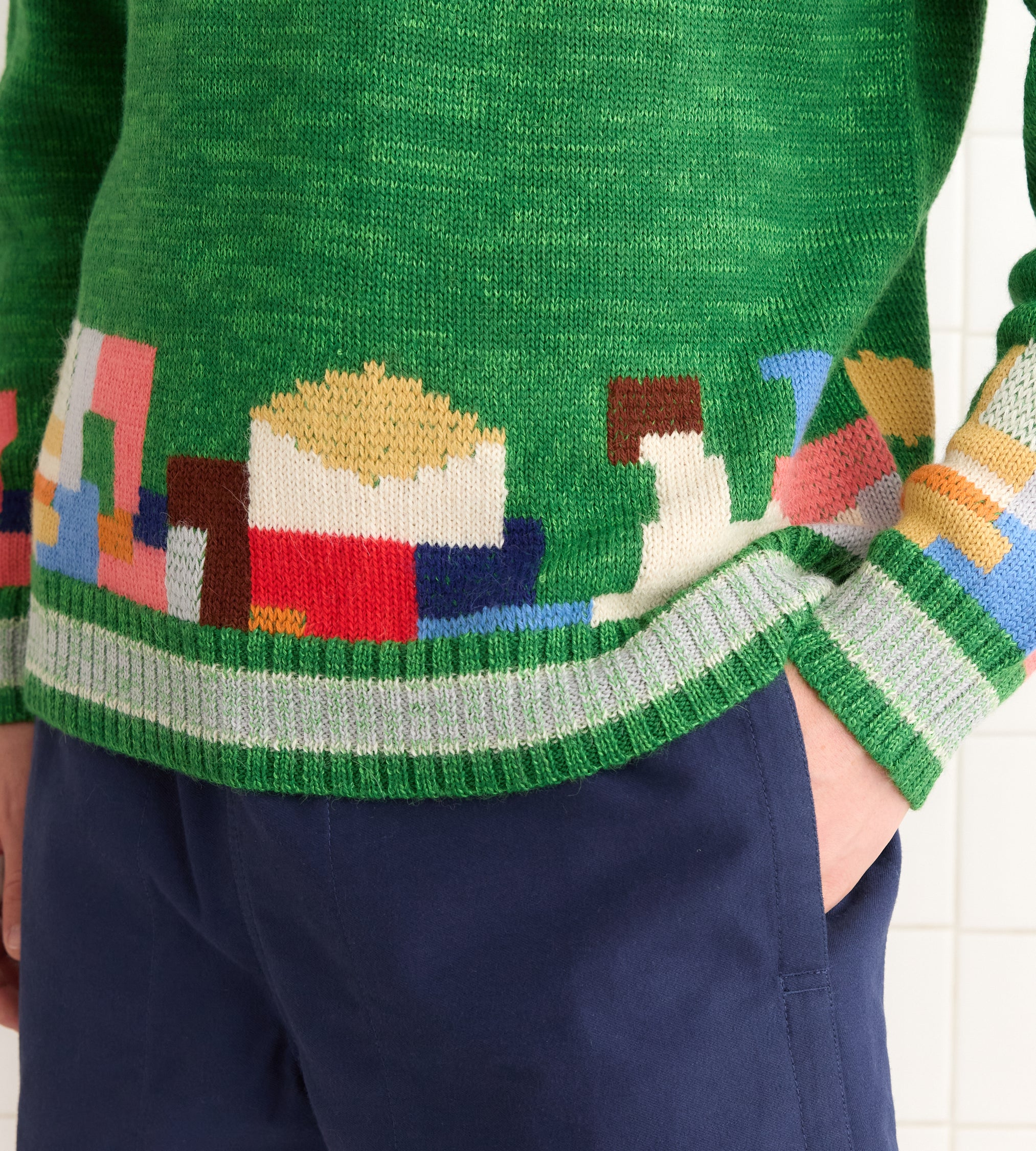 This sweater is a historical reproduction of a children’s sweater, made for a Chicago department store in the 1930s. We reproduced the knit pattern, with its blocks of color around the hem and cuffs, for this style.