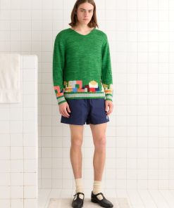 This sweater is a historical reproduction of a children’s sweater, made for a Chicago department store in the 1930s. We reproduced the knit pattern, with its blocks of color around the hem and cuffs, for this style.