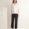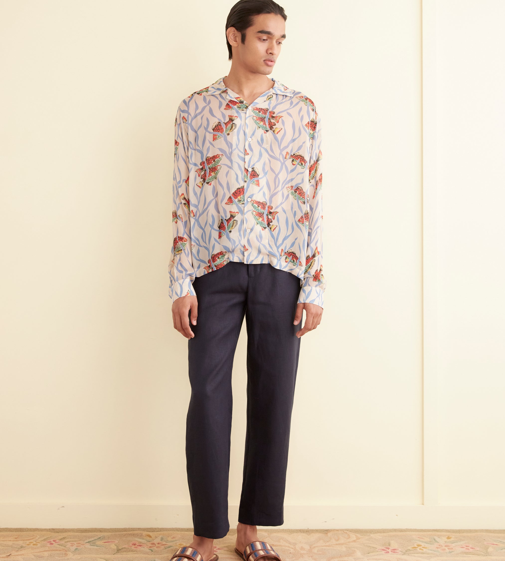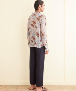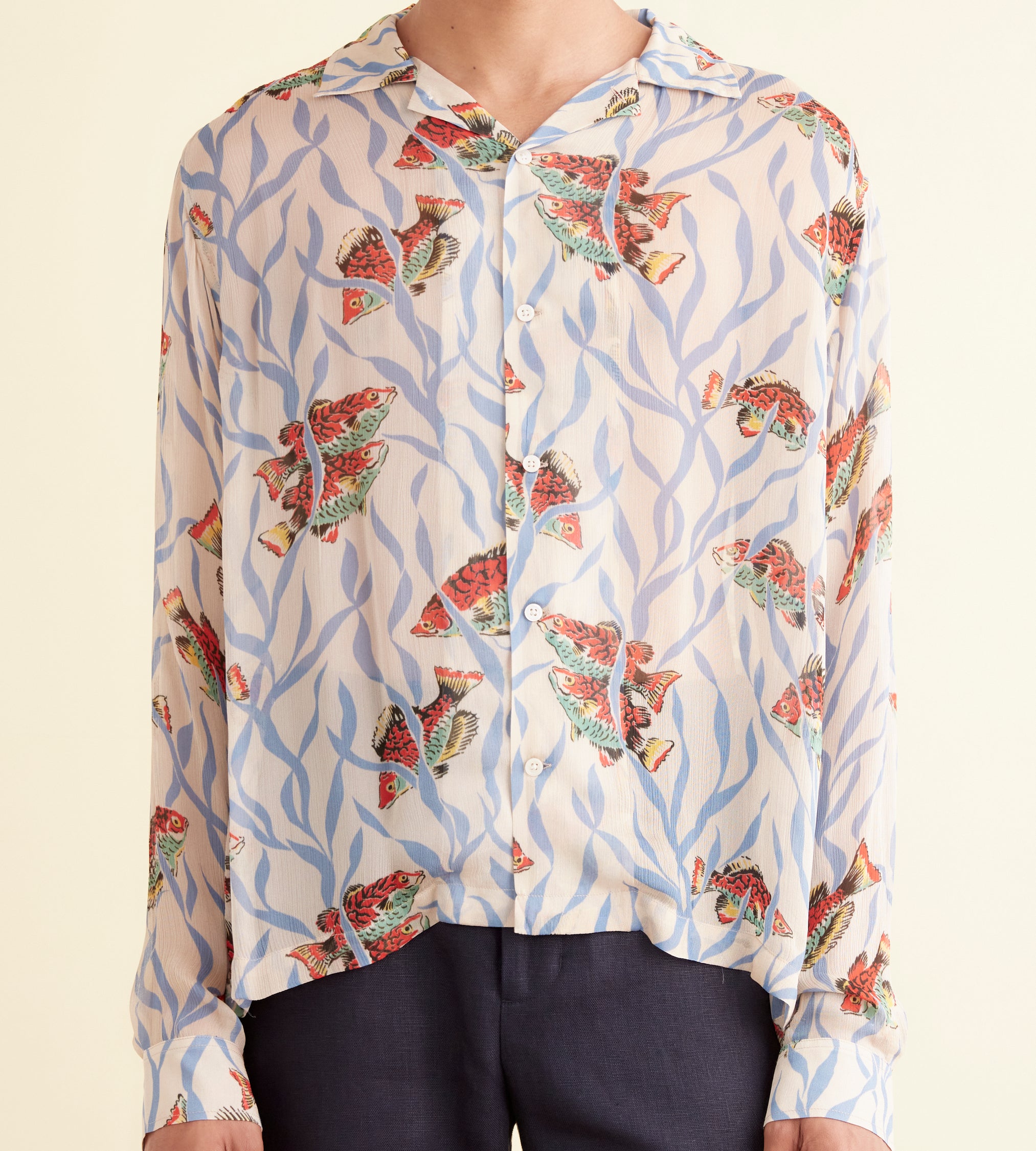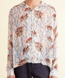 This shirt is inspired by deadstock yardage from the midcentury, which was printed with a pattern of blue seaweed and orange fish. We reproduced the original print on a fine, textured crepe for this style.