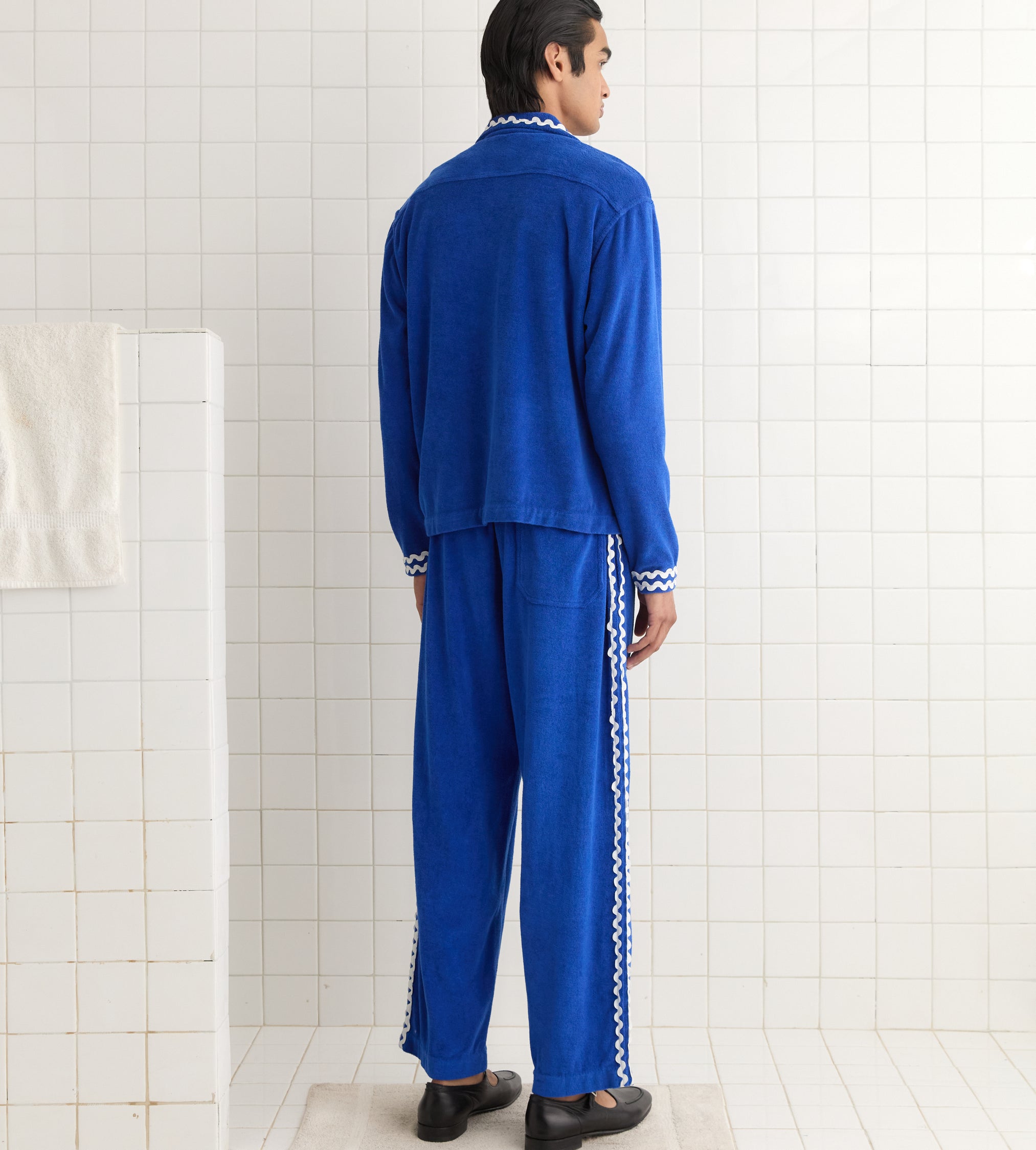 This overshirt is inspired by a French tracksuit from the 1980s. We reproduced the soft blue terrycloth for this style, which is trimmed with white rickrack across the collar, cuffs, and pockets.