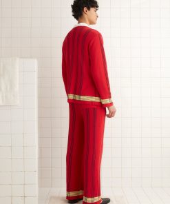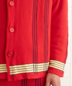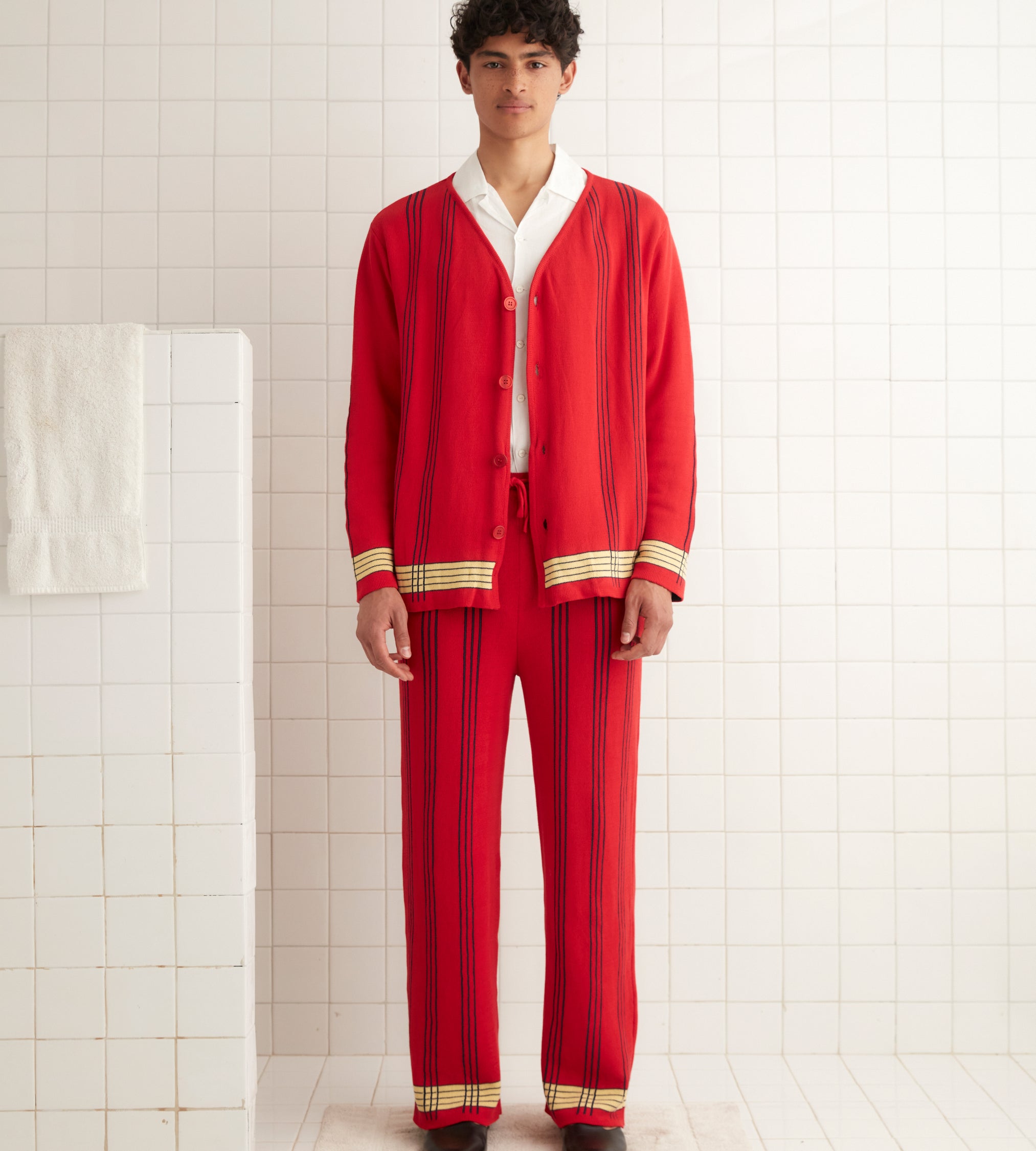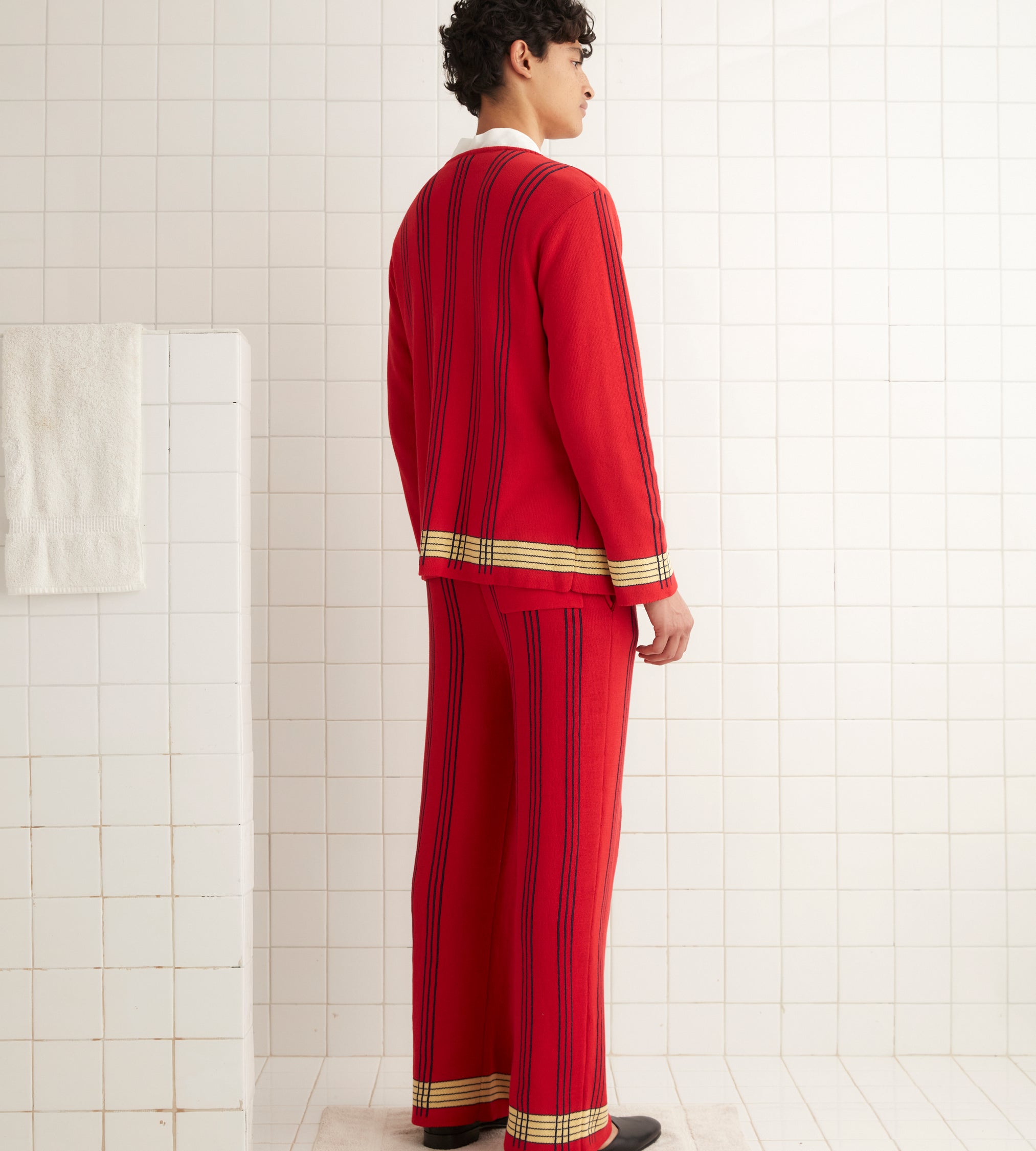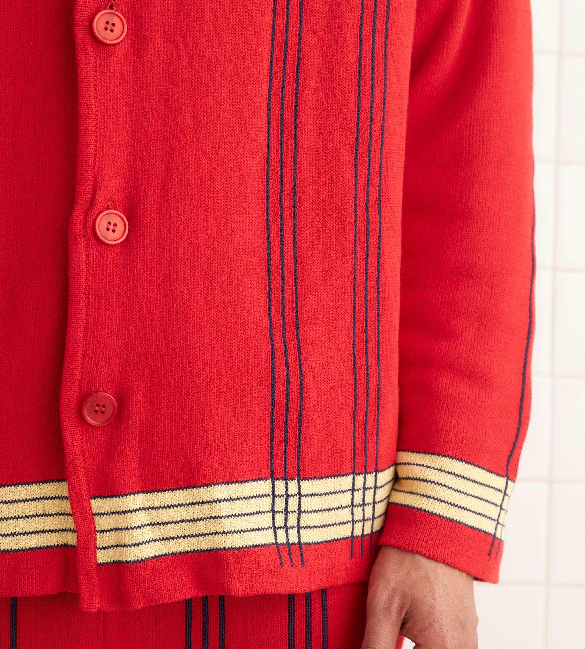 This cardigan is inspired by a knit vest from the 1970s. We reproduced the pattern in a three-color jacquard weave.