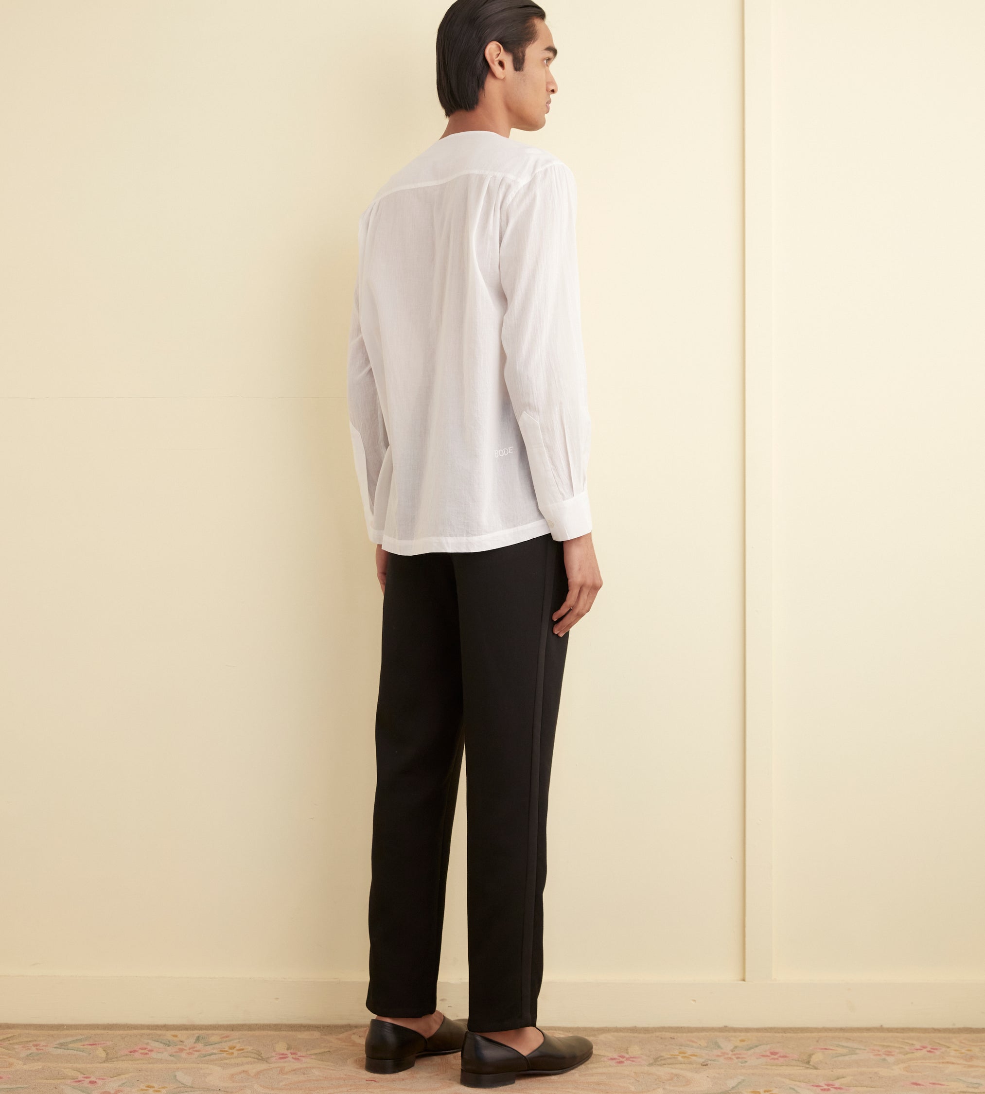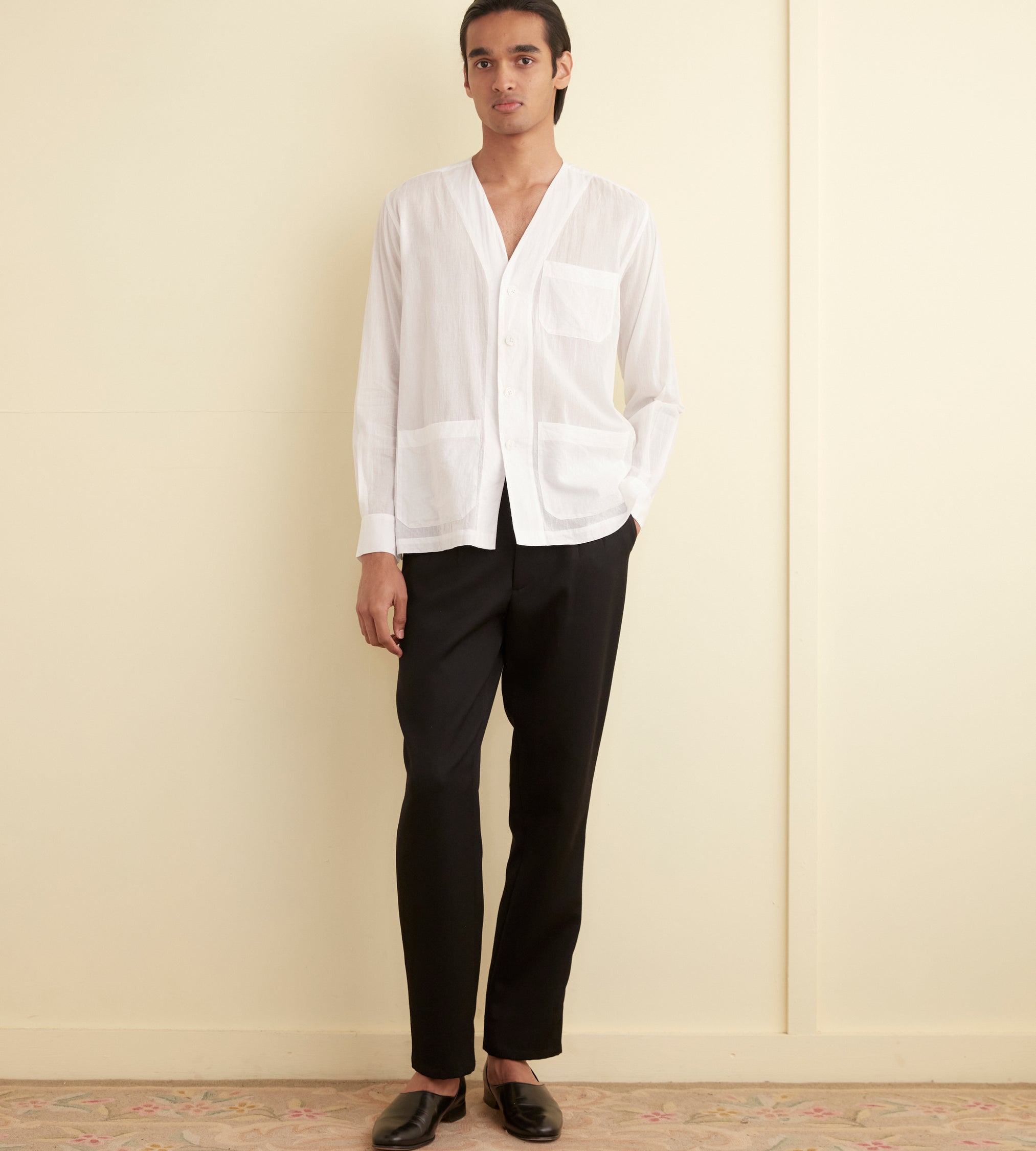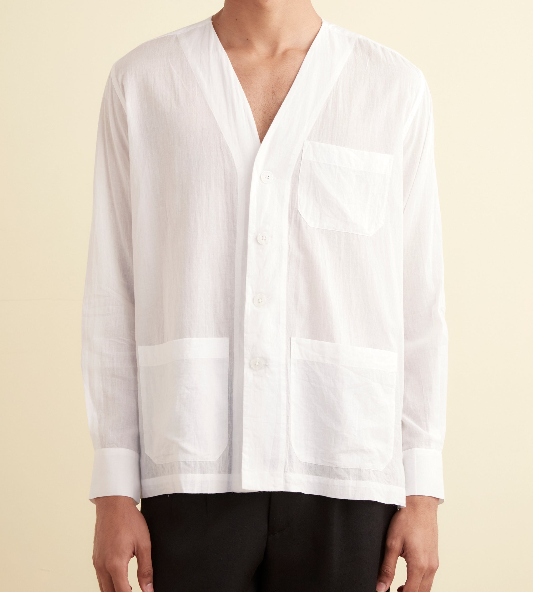 This long-sleeve shirt is inspired by a midcentury overshirt. We reproduced the silhouette, likely meant to be worn over a traditional collared shirt as a work or shop jacket, in lightweight cotton voile.
