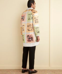 This coat is inspired by a souvenir quilt from the midcentury. We reproduced the original quilt, with its prints from different U.S. cities, for this jacket.
