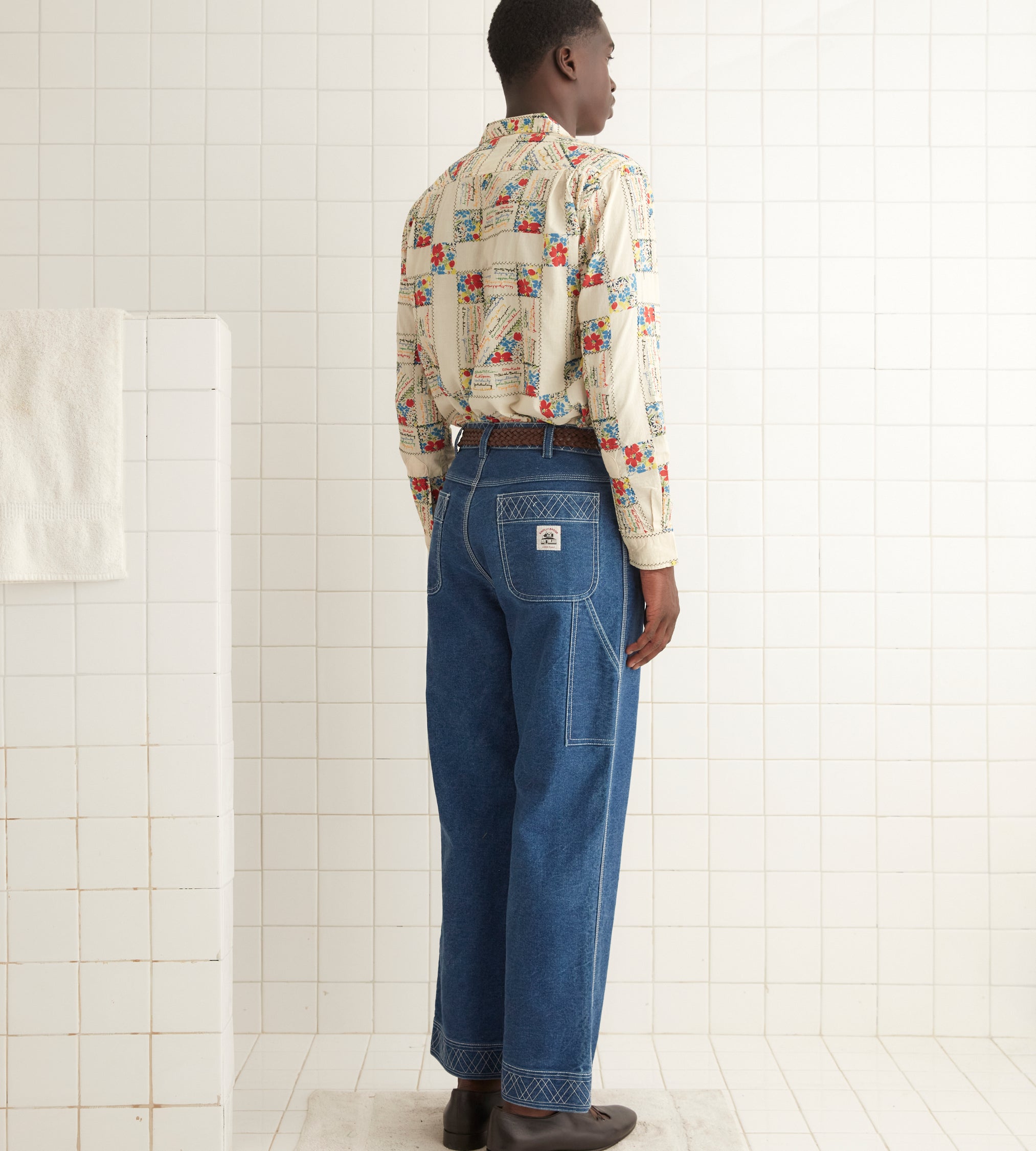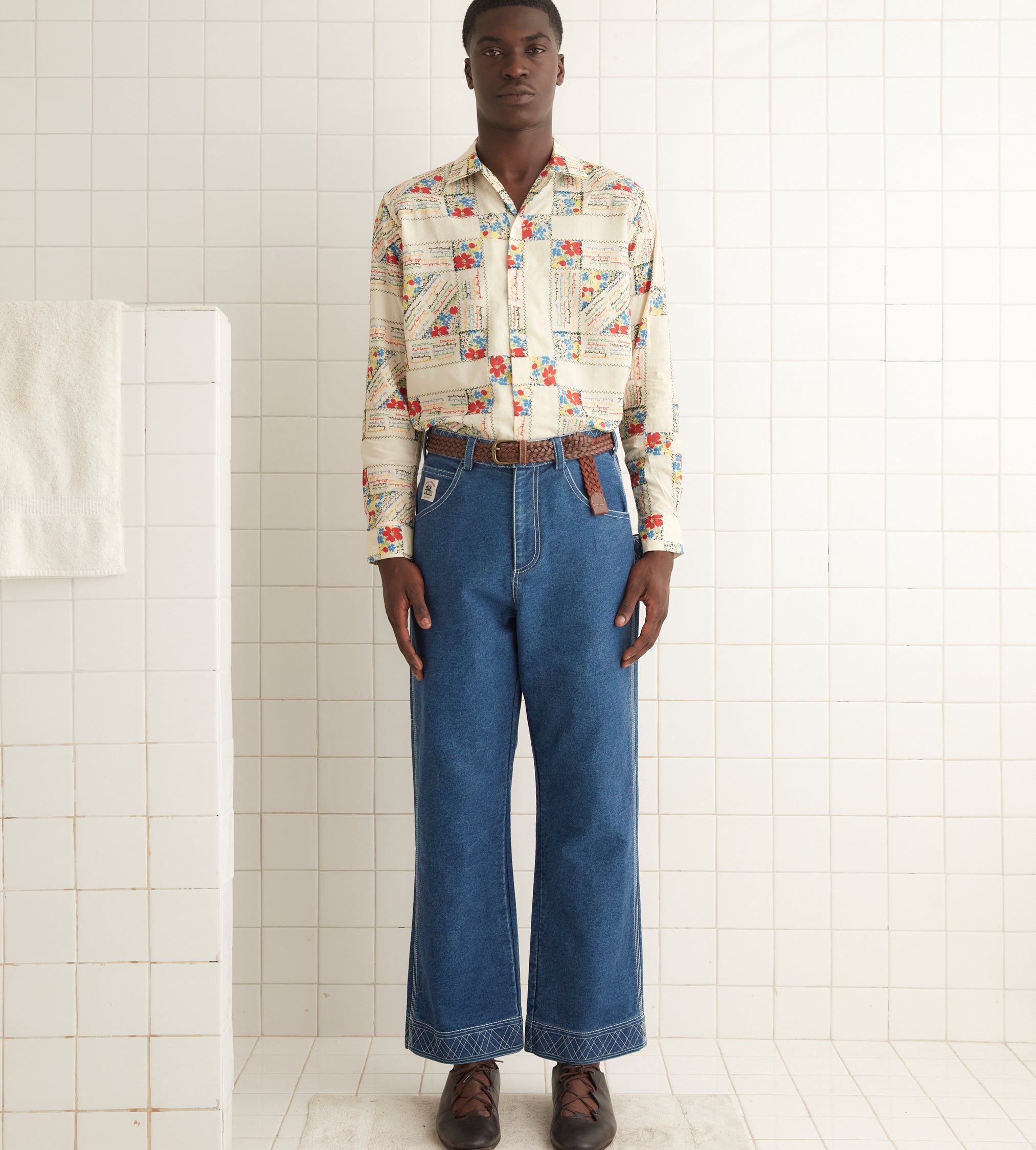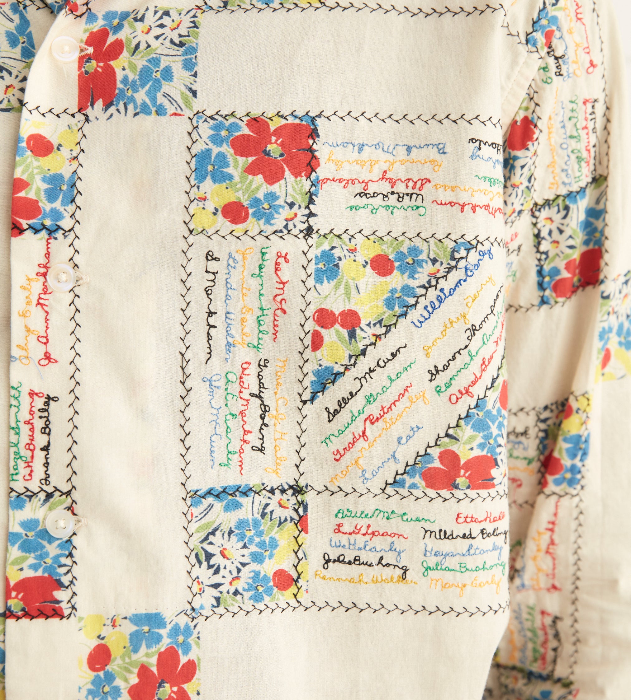 This long sleeve shirt is inspired by antique patchwork and embroidery, circa 1970s Tennessee. Groups of friends and colleagues would often sign quilt blocks as a means to fundraise for an institution, school, church, neighborhood, or as a gift or family tree.
