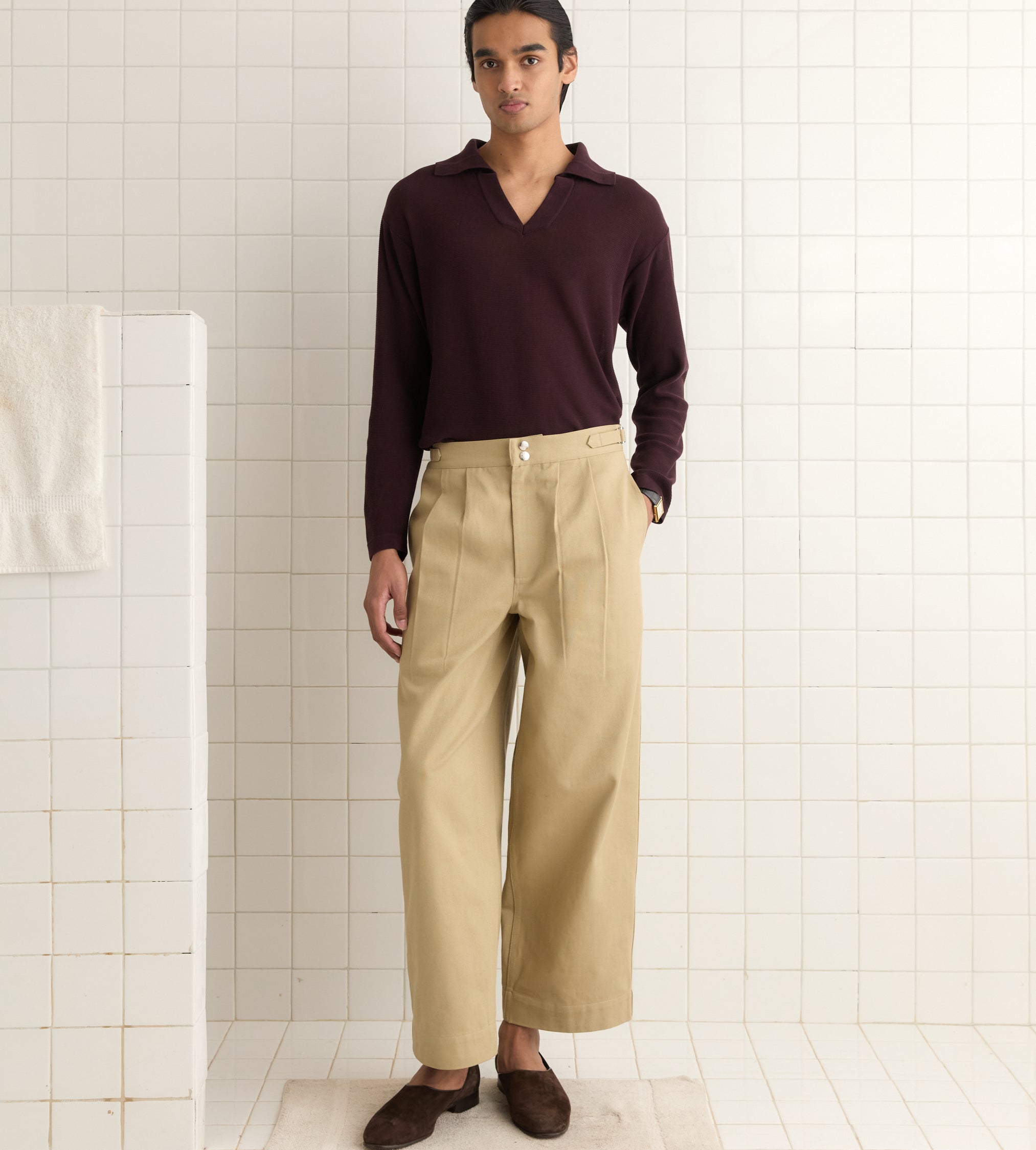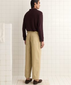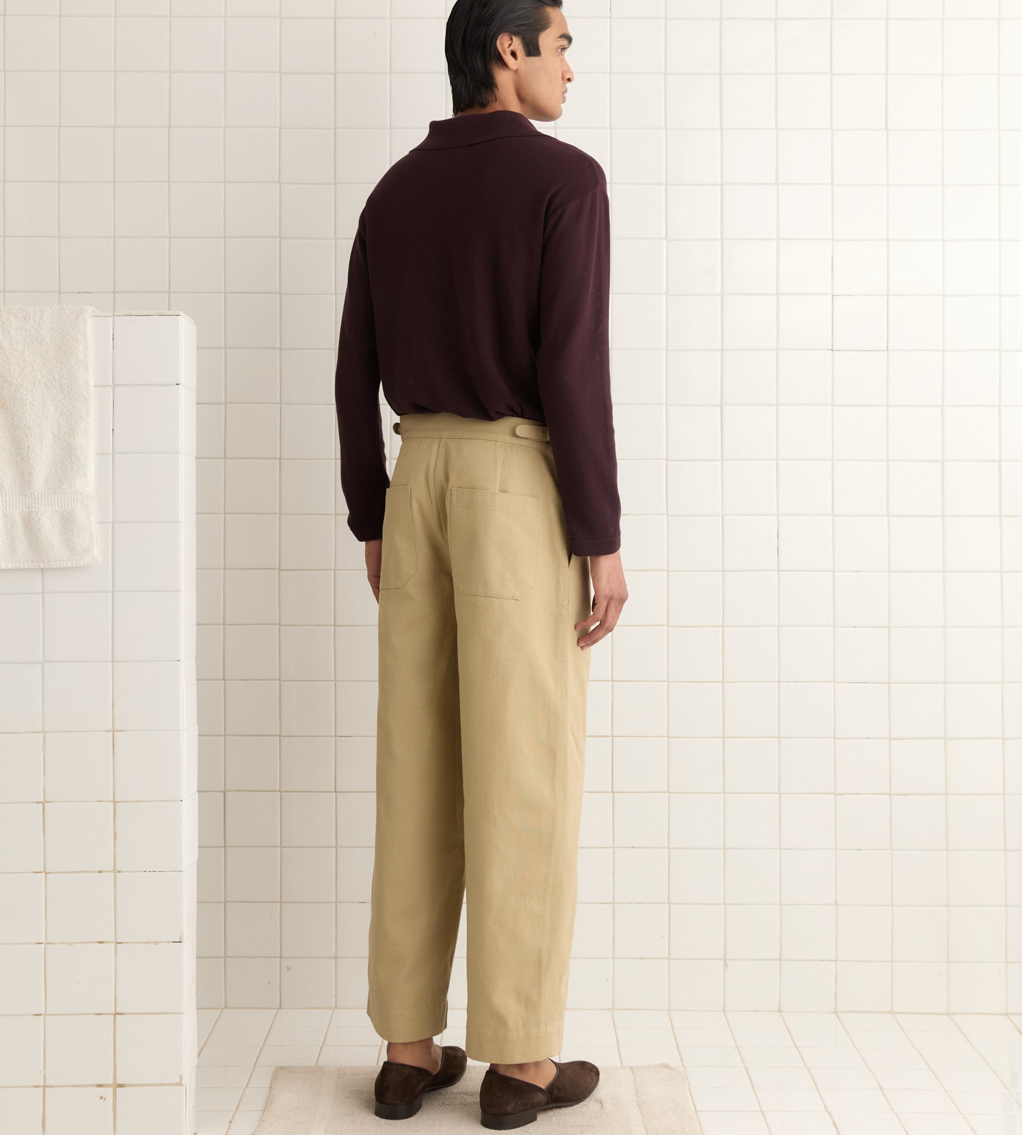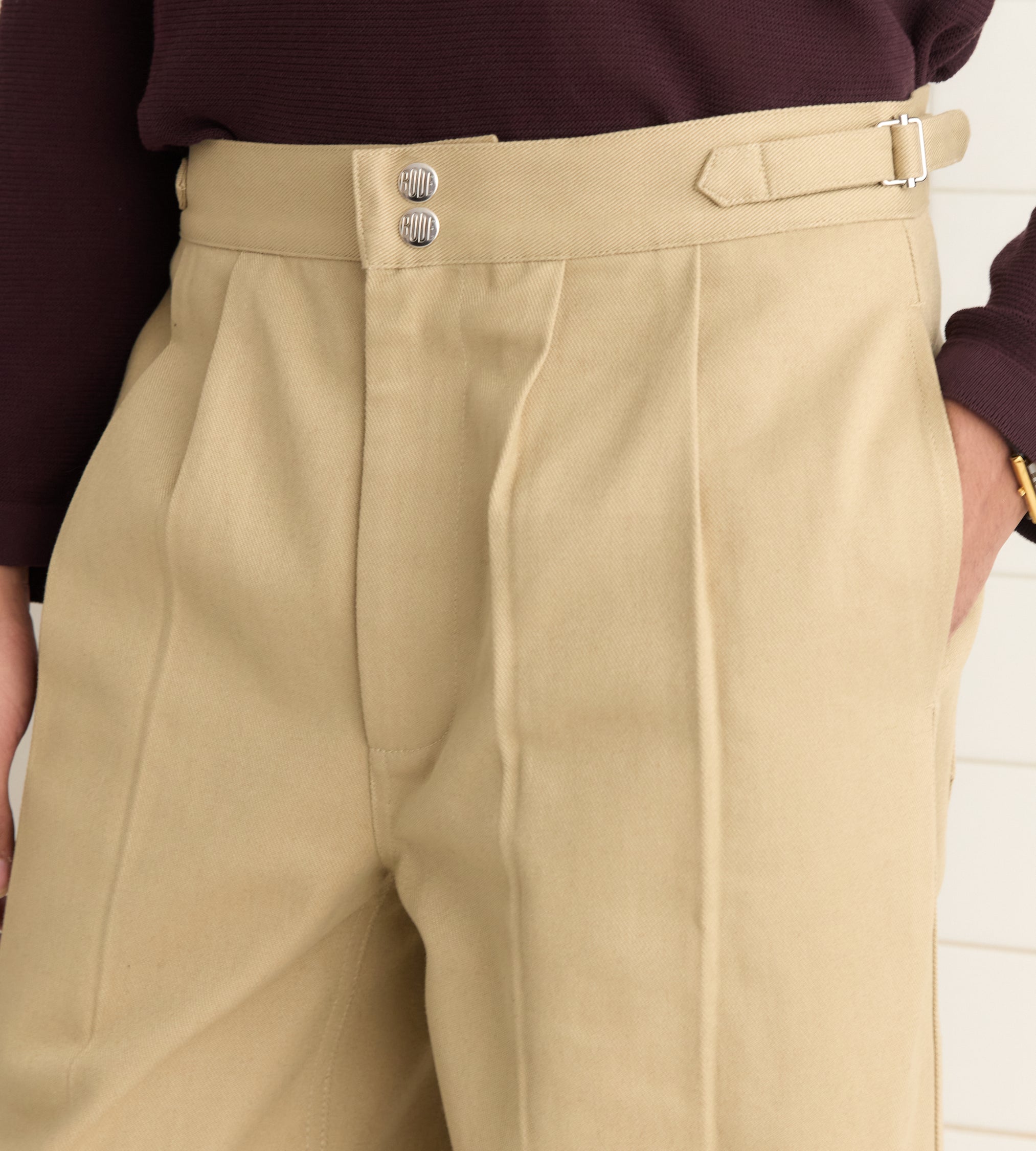 These trousers are inspired by vintage Australian military pants. Made of a heavyweight twill, they feature double front pleating and a snap closure.