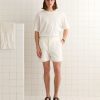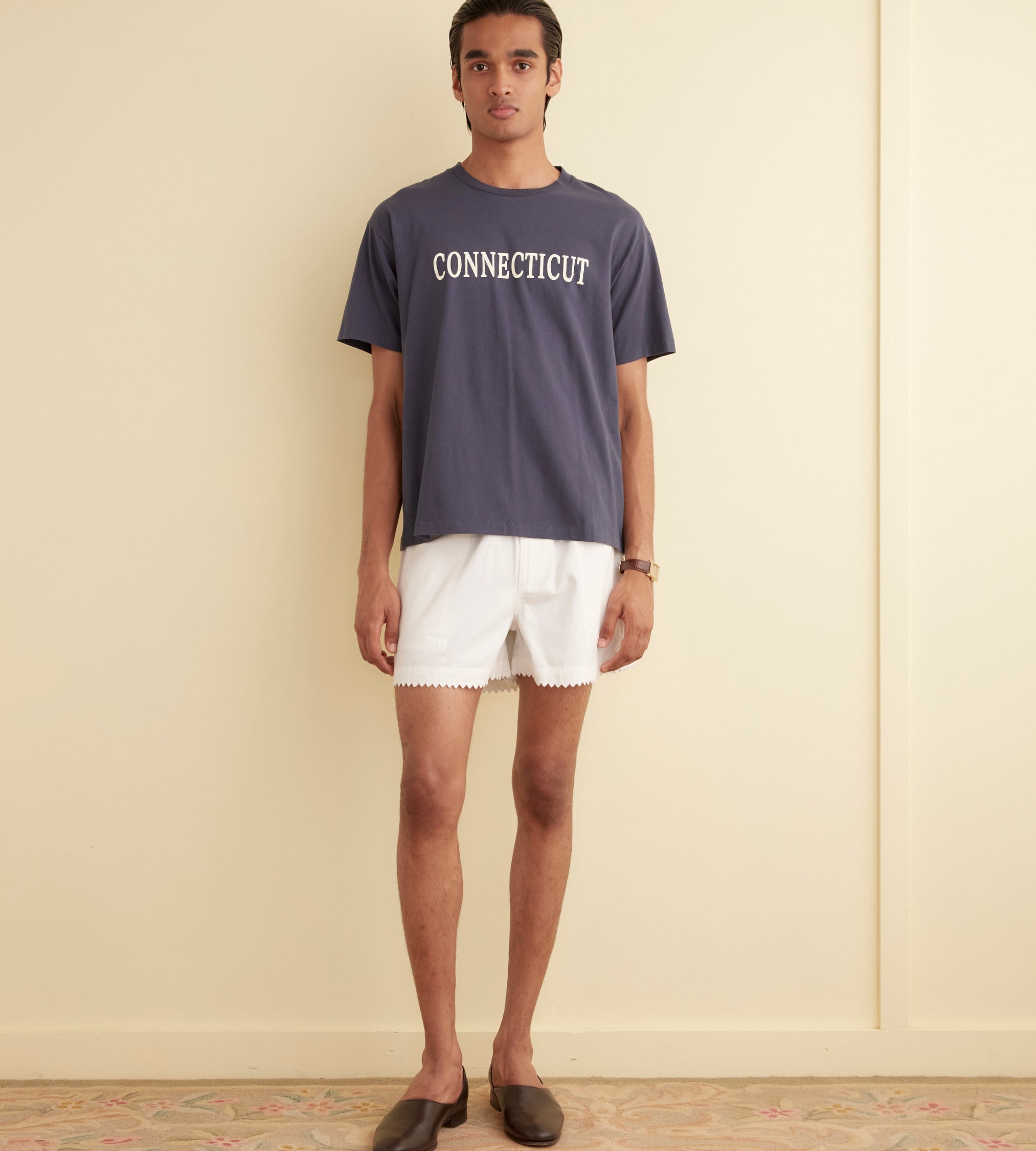 These shorts are inspired by a vintage shirt from the 1940s. The zig-zag seam of the original piece has been reproduced here along the hem. The shorts have a short inseam and a wide leg opening.
