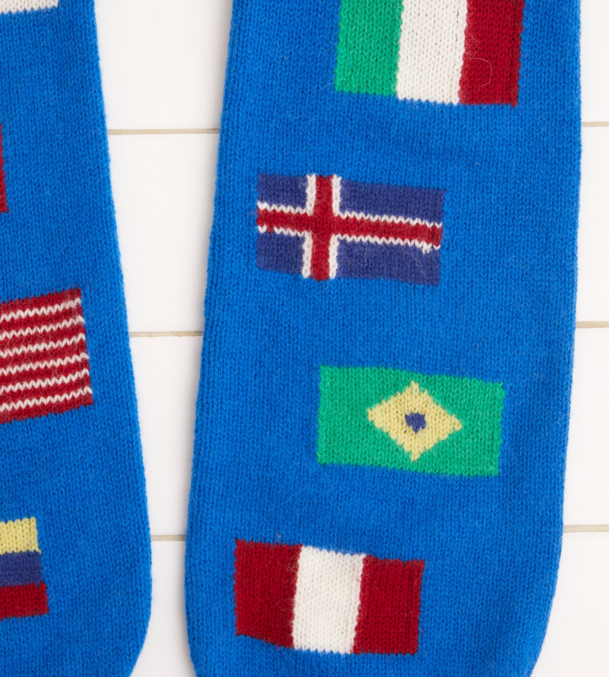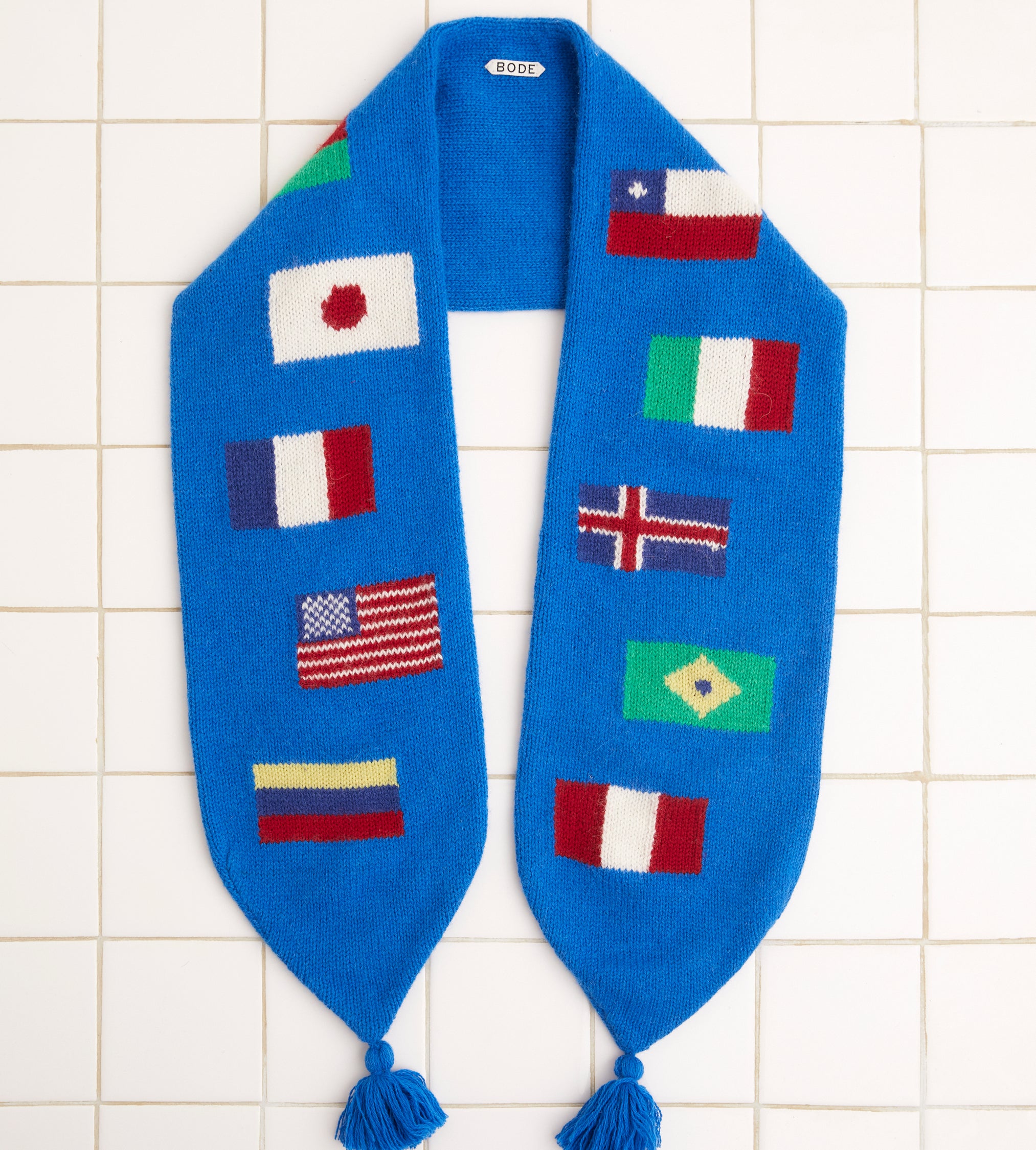 This scarf is inspired by a novelty sweater from the 1970s, likely something made from a DIY knitting kit. We reproduced the intarsia flag pattern for this style, which is trimmed with pompoms at each end.