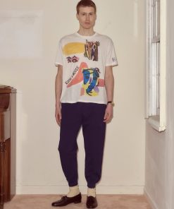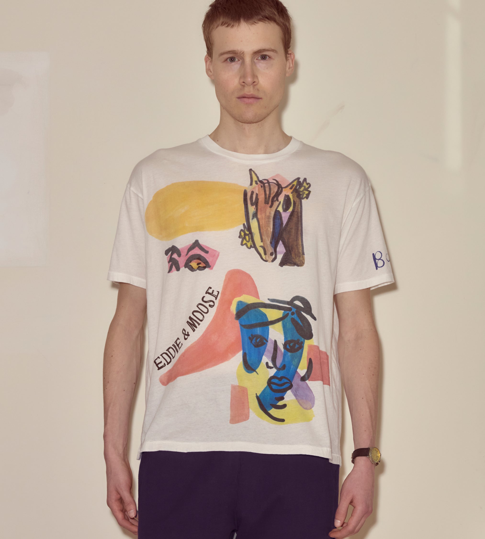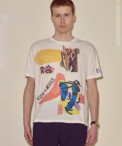 Moose Charlap and his writing partner, Eddie Lawrence, shared an eye for Modernist art, and both filled their homes with art purchased from young artists in Paris. This tee, with its abstract colorblocking and handwritten “Eddie and Moose,” “Marilyn and Sandy,” is an imagined souvenir from their travels—Moose with his wife Sandy and Eddie with his wife Marilyn.