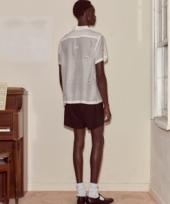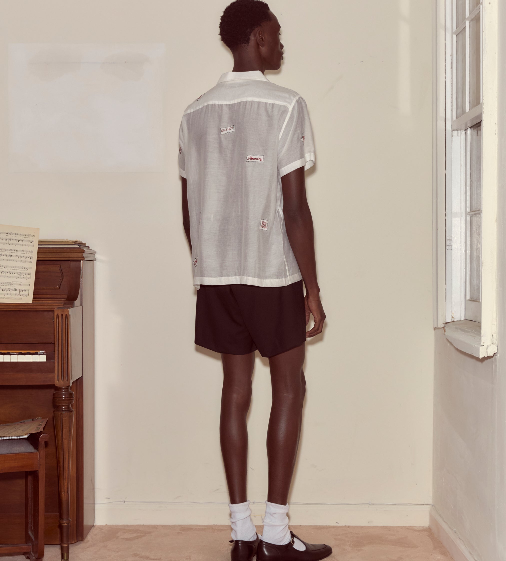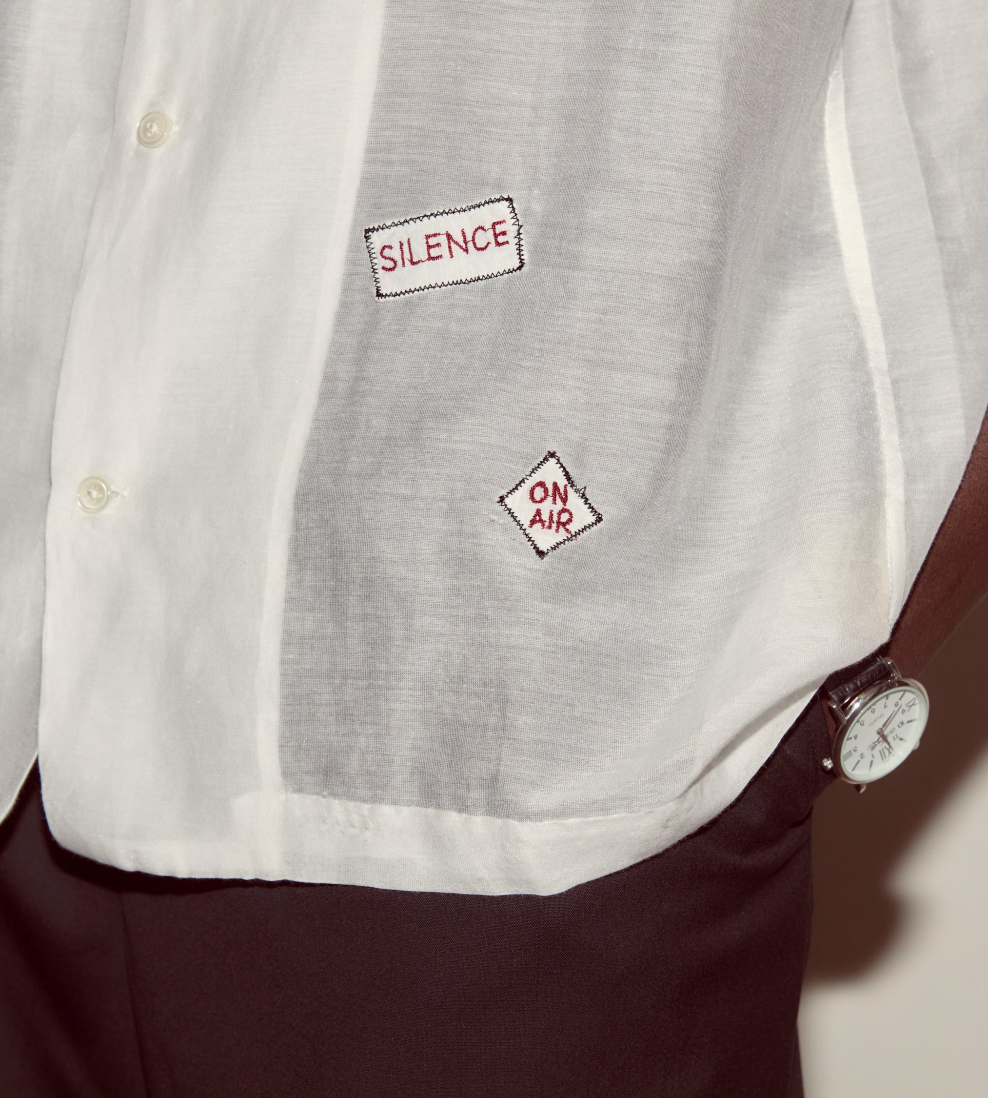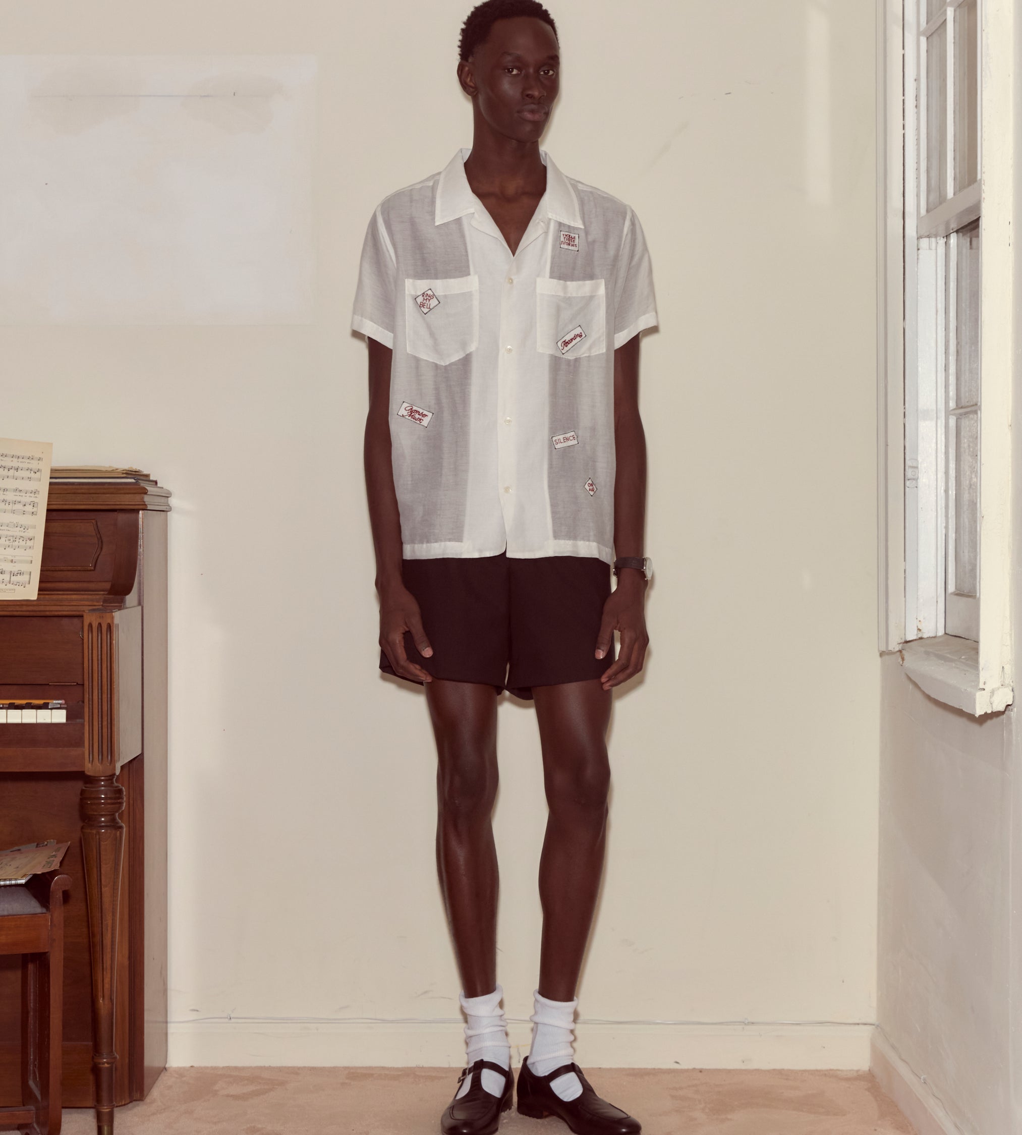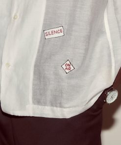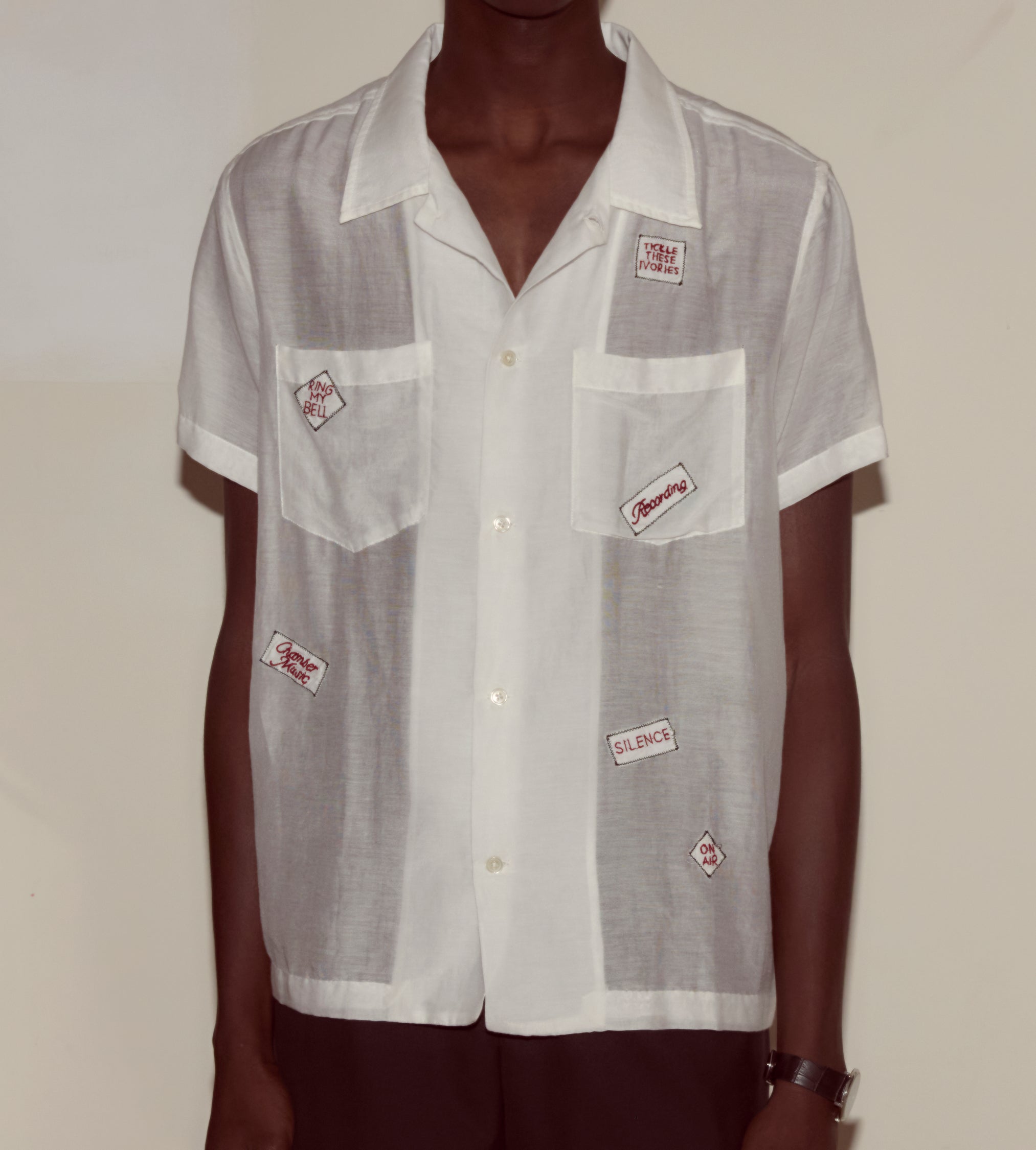 “Silence,” “Ring My Bell,” “Tickle These Ivories”—the embroidered patches scattered across this shirt are a tongue-in-cheek look into the recording studio, perhaps Moose Charlap’s Devon Records in Philadelphia.