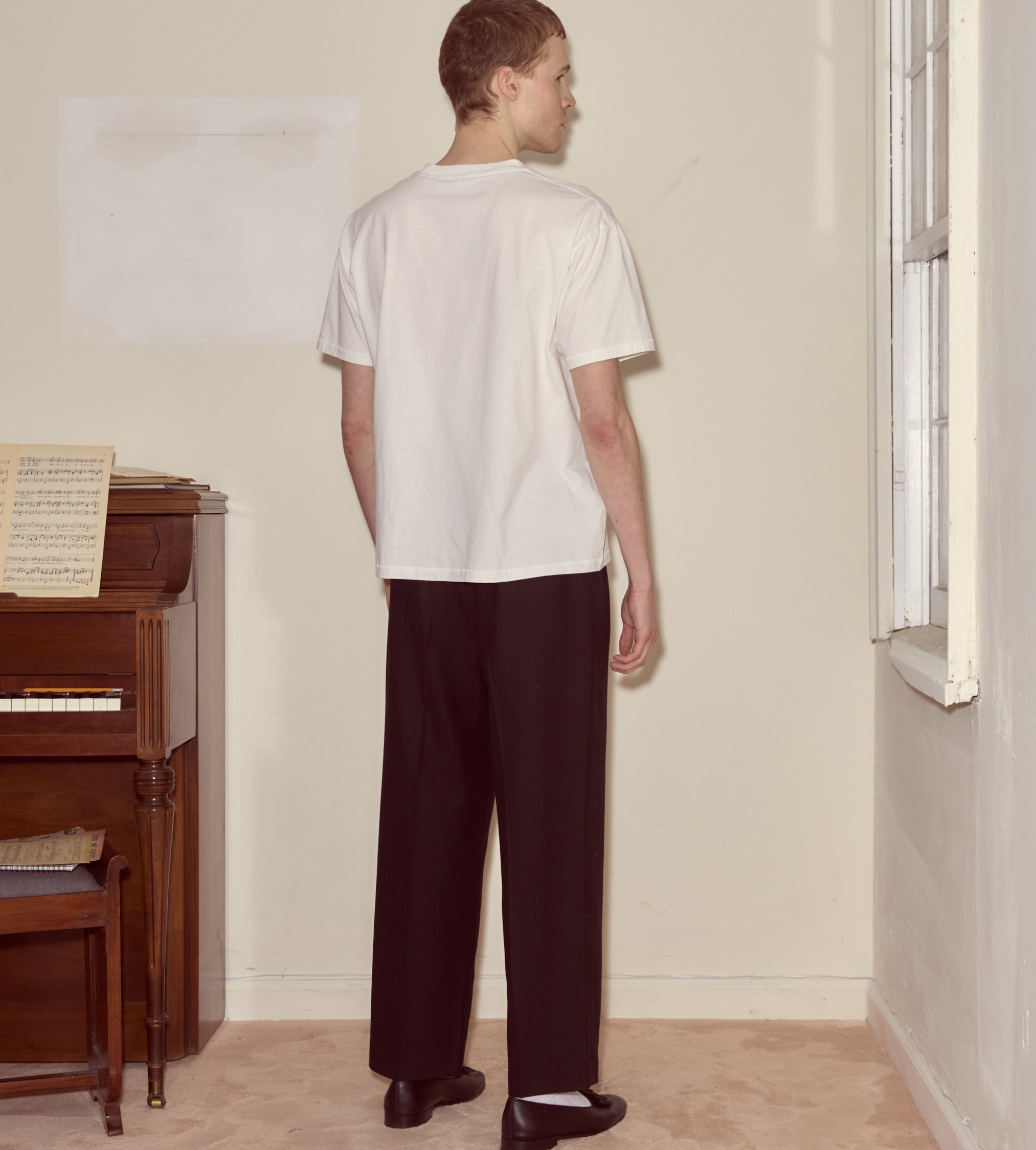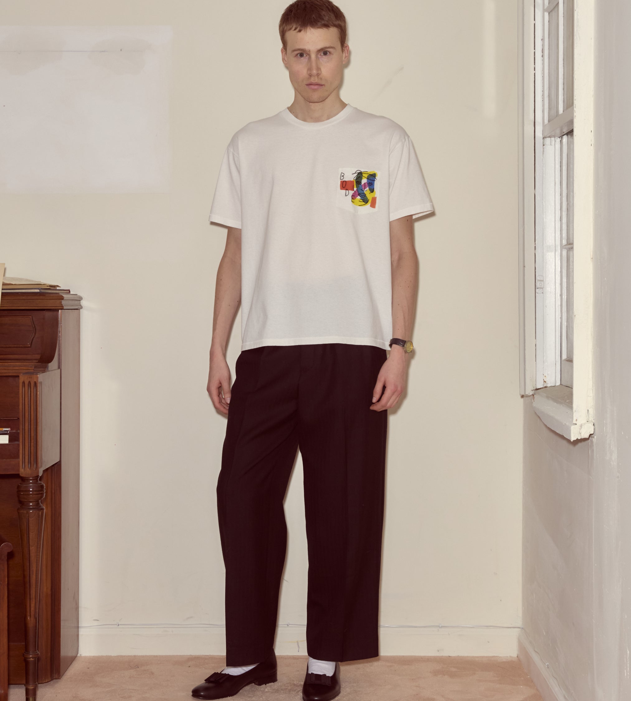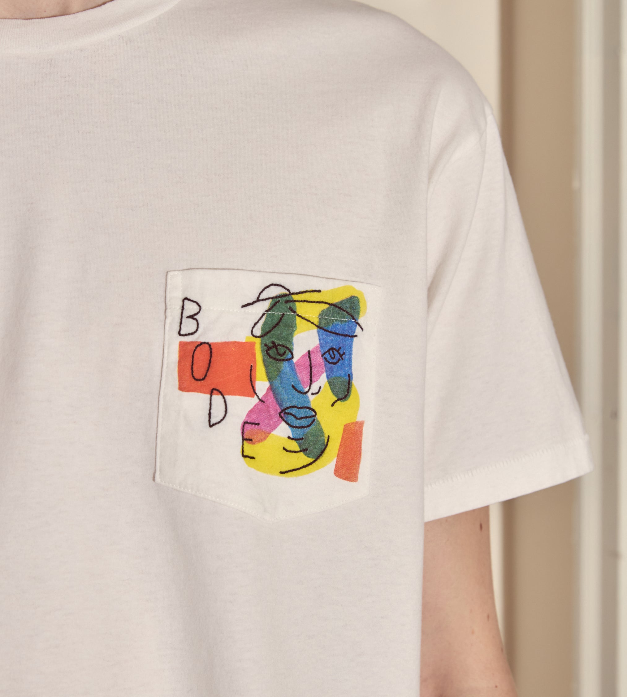 Moose Charlap and his writing partner, Eddie Lawrence, shared an eye for Modernist art—Lawrence had studied painting under Fernand Léger after the war, and both men filled their homes with art purchased from young artists in Paris. This pocket tee, with its abstract colorblocking and illustrated face, is an homage to their art collections.