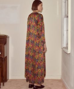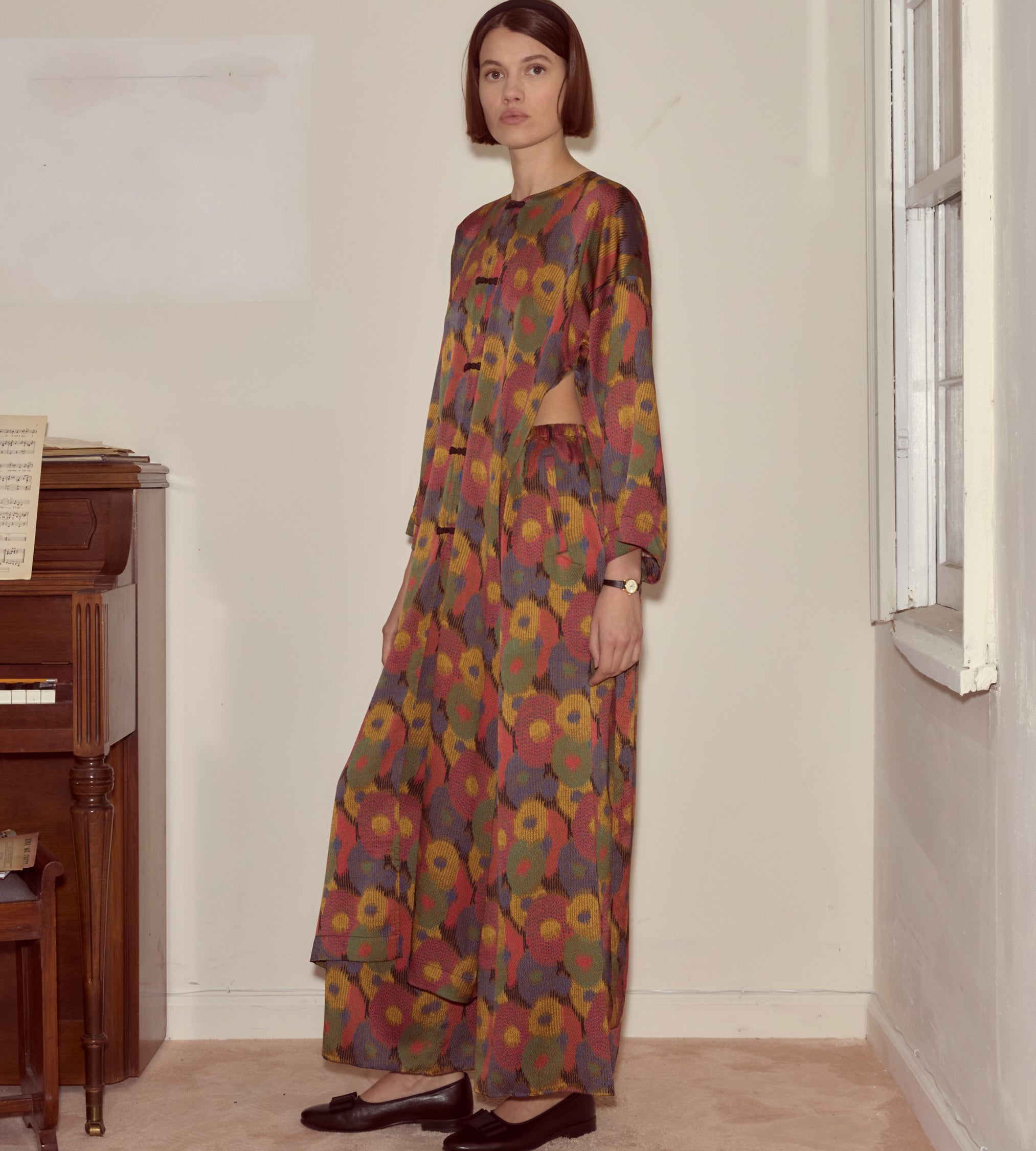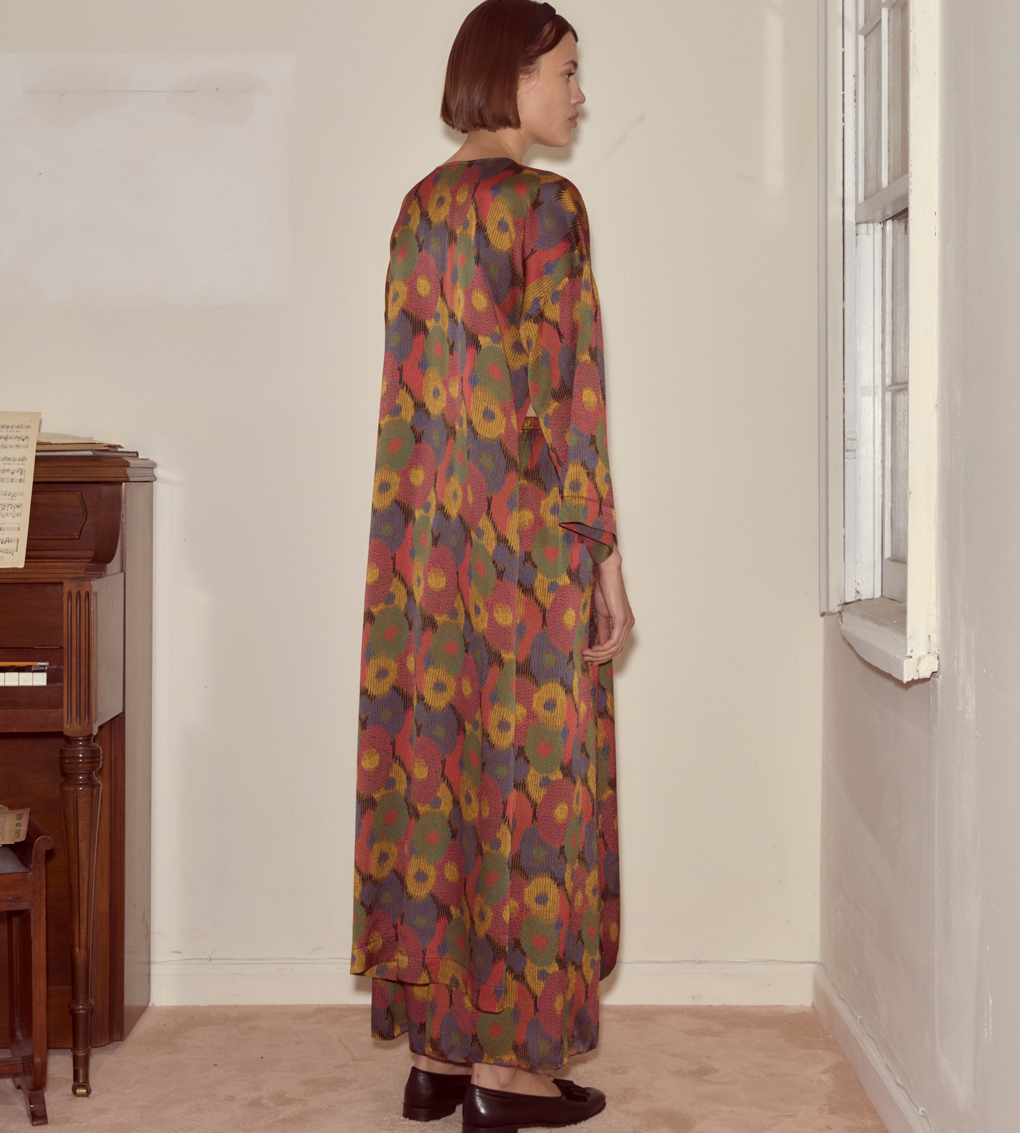 This kaftan is cut from silk seersucker, a distinctive fabric recreated from a French swatchbook, c.1930s. It closes with a series of black frog closures.