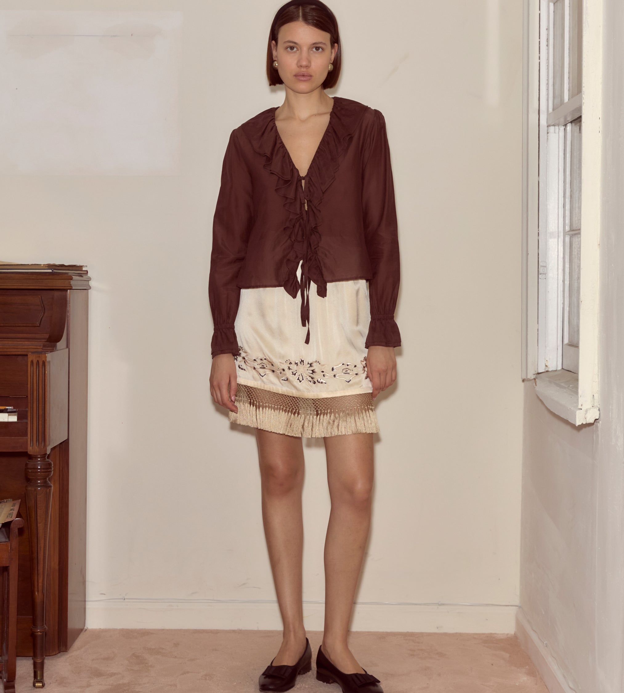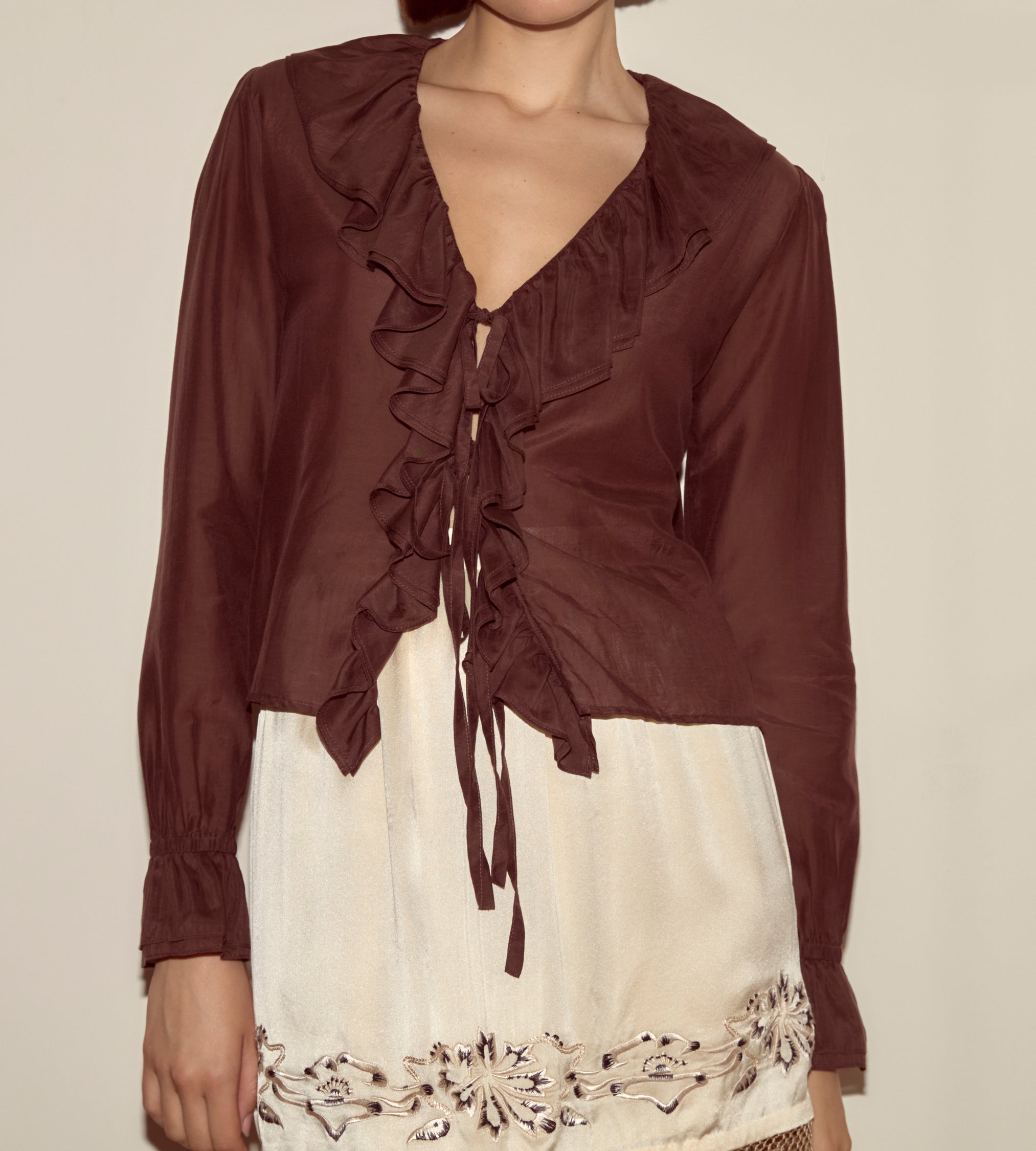 This blouse is inspired by a ruffled French blouse from the late 20th century. We reproduced the original silhouette in a lightweight cotton/silk blend with tie-front closures.