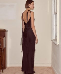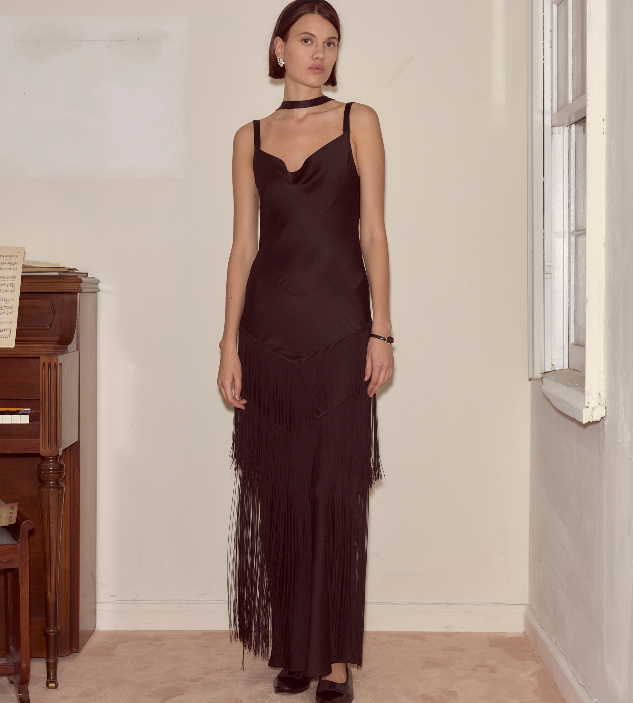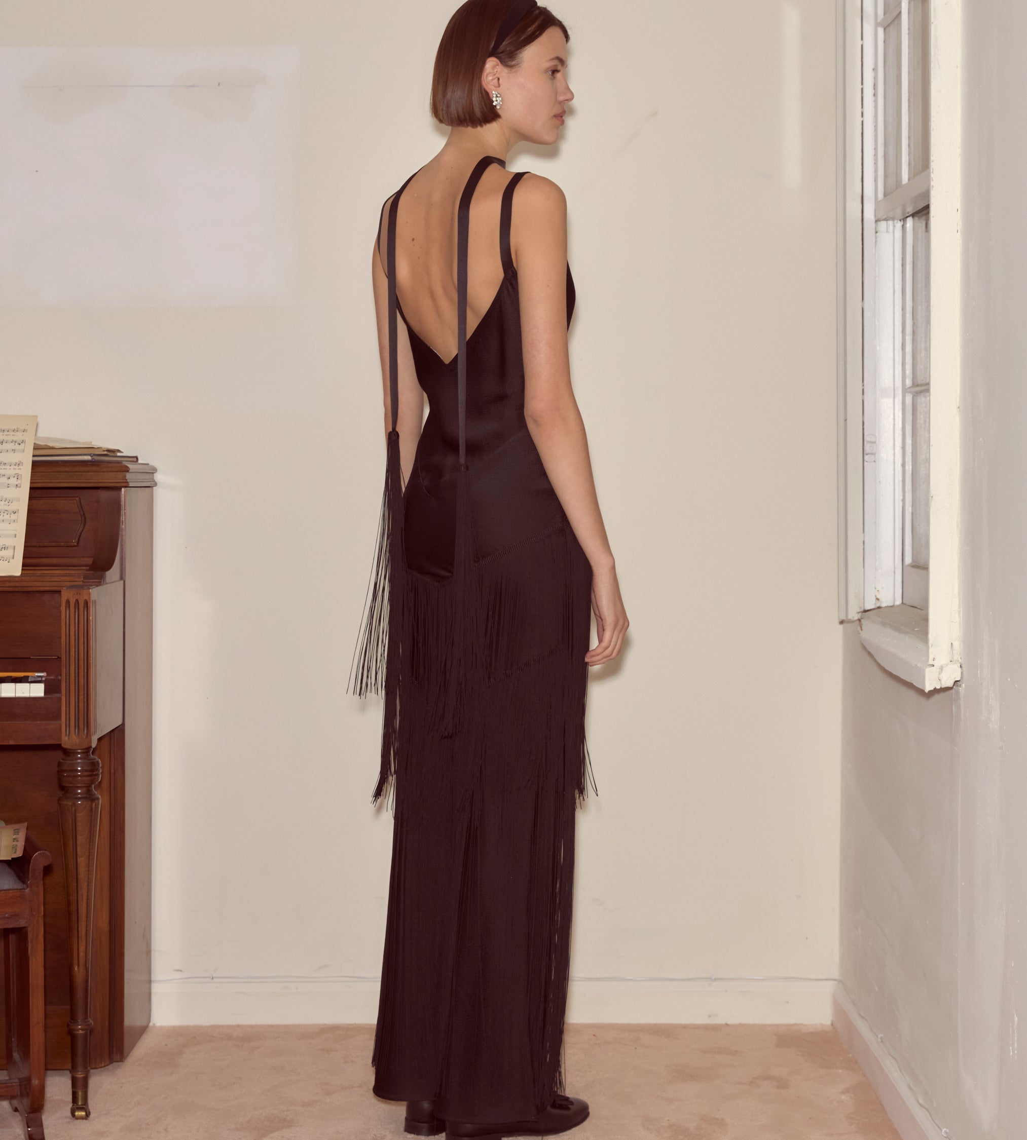 This evening gown is cut on the bias and trimmed with panels of long, swinging fringe. Made from textured silk, it has an accompanying thin silk scarf, finished with tassels.