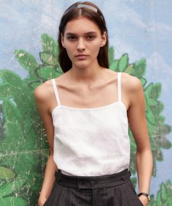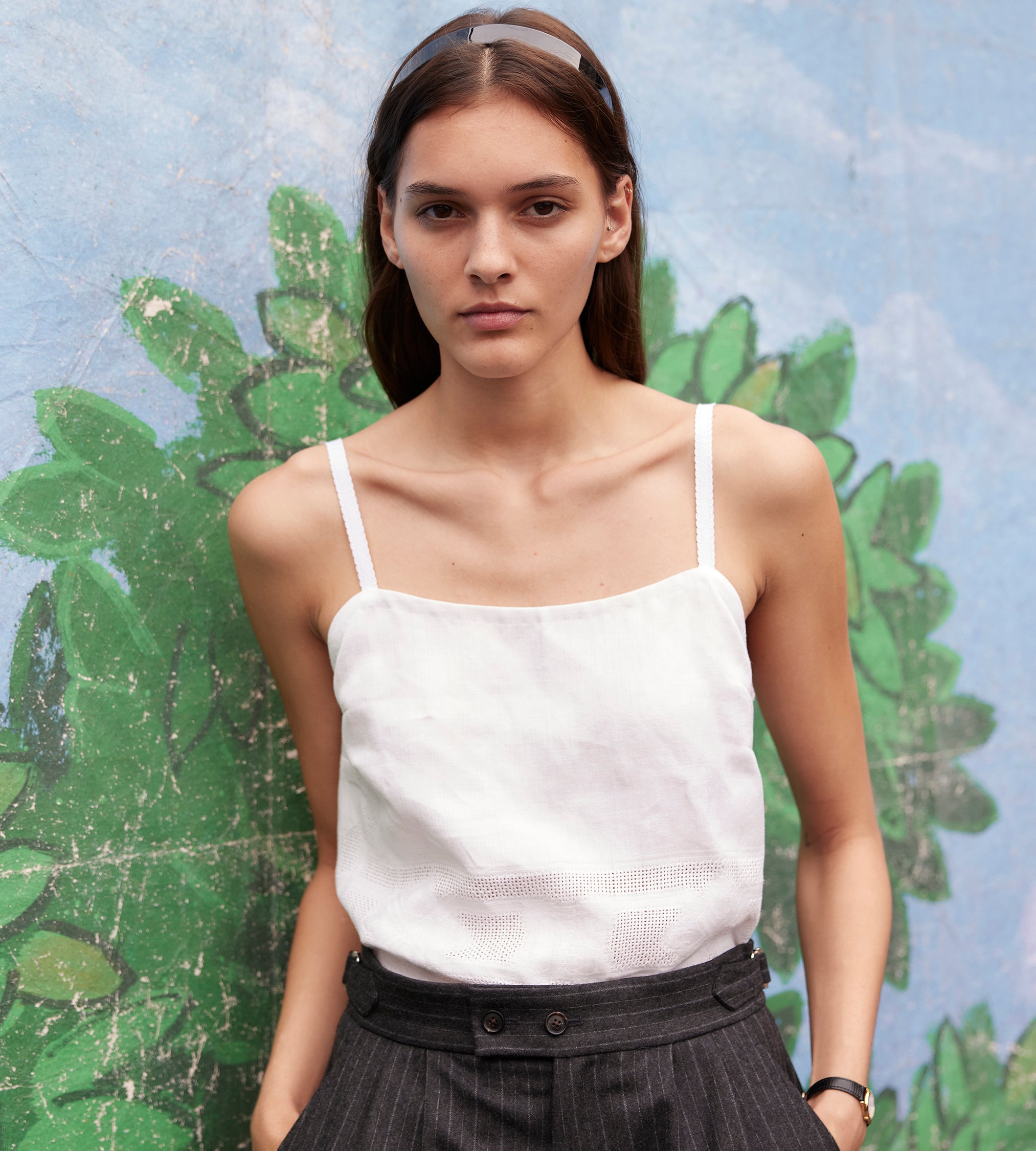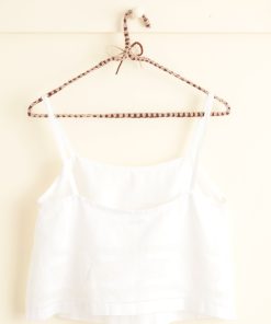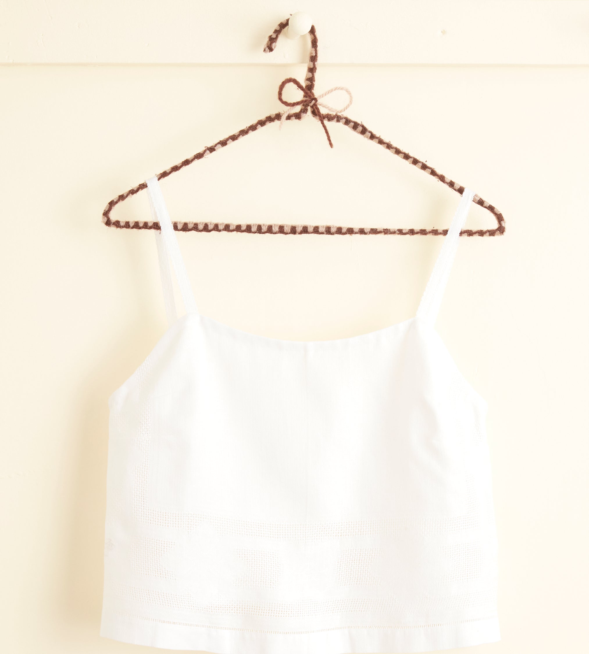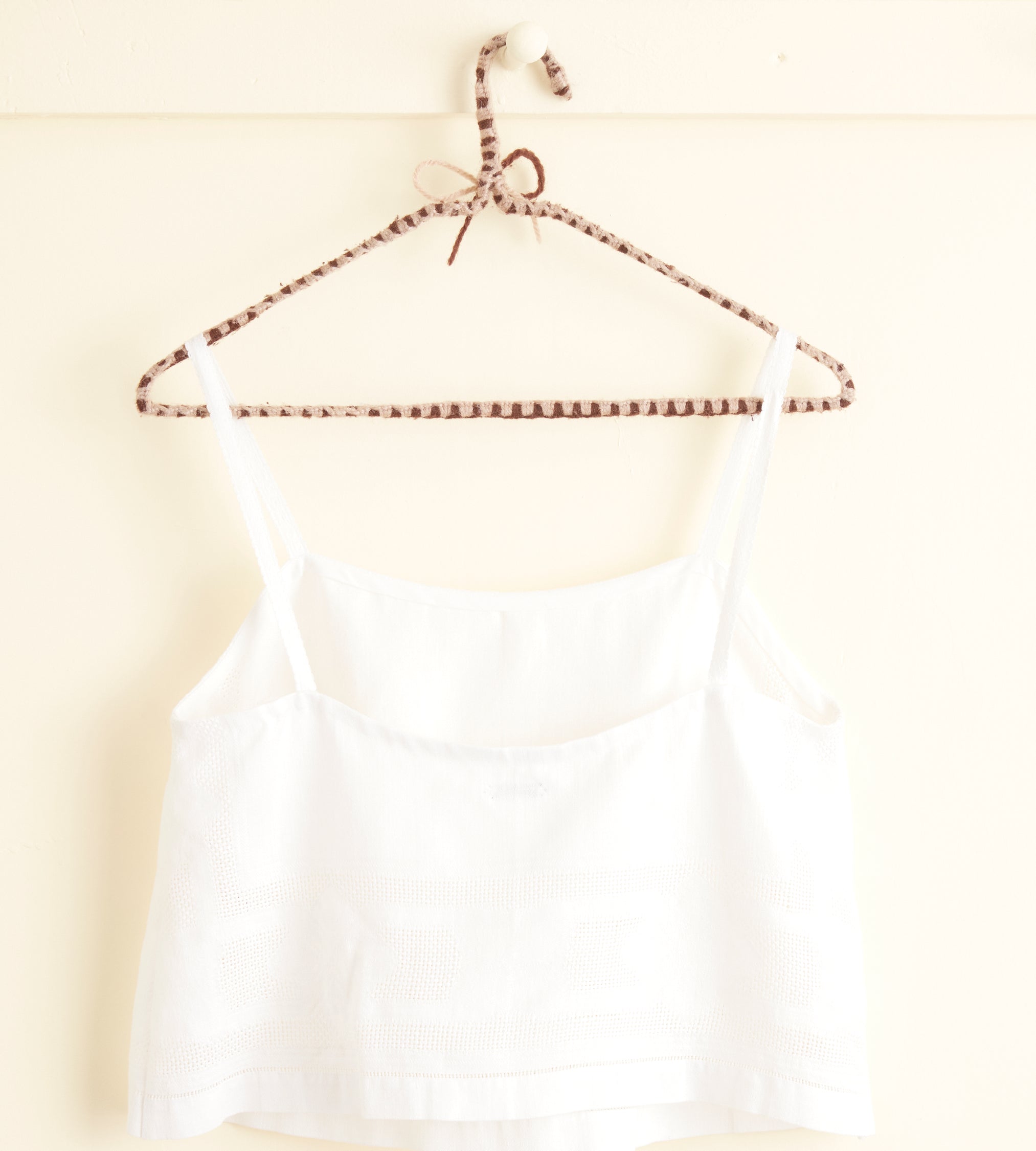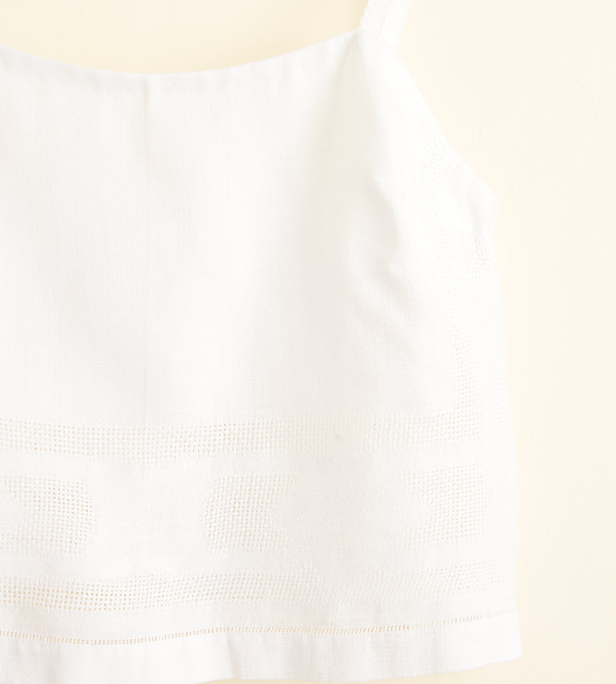 This tank is made from a drawnwork tablecloth from the 1950s. Drawnwork is a needlework technique in which threads are removed from fabric and the remaining threads are bound together in a geometric pattern. Hand-mending throughout.