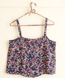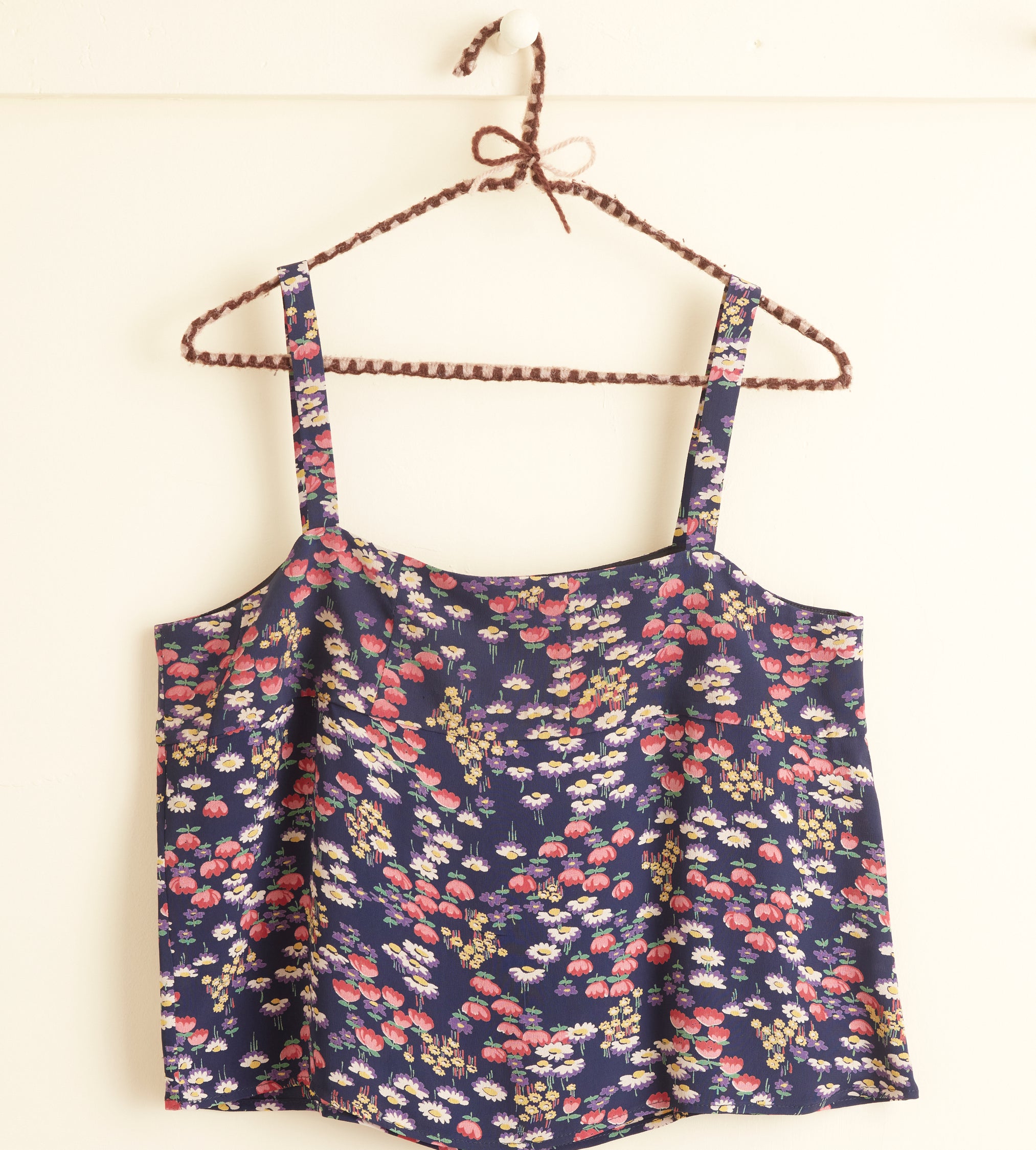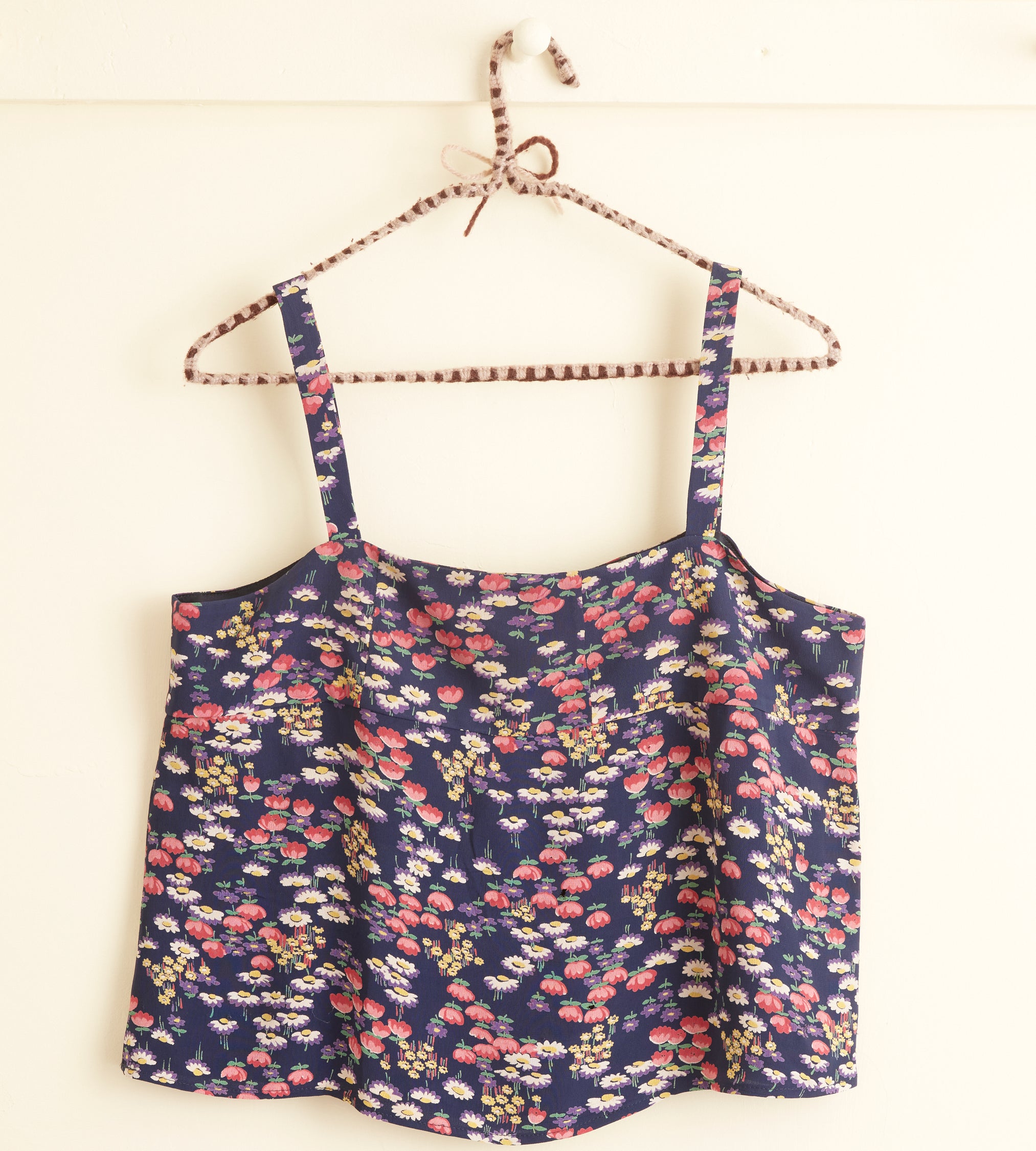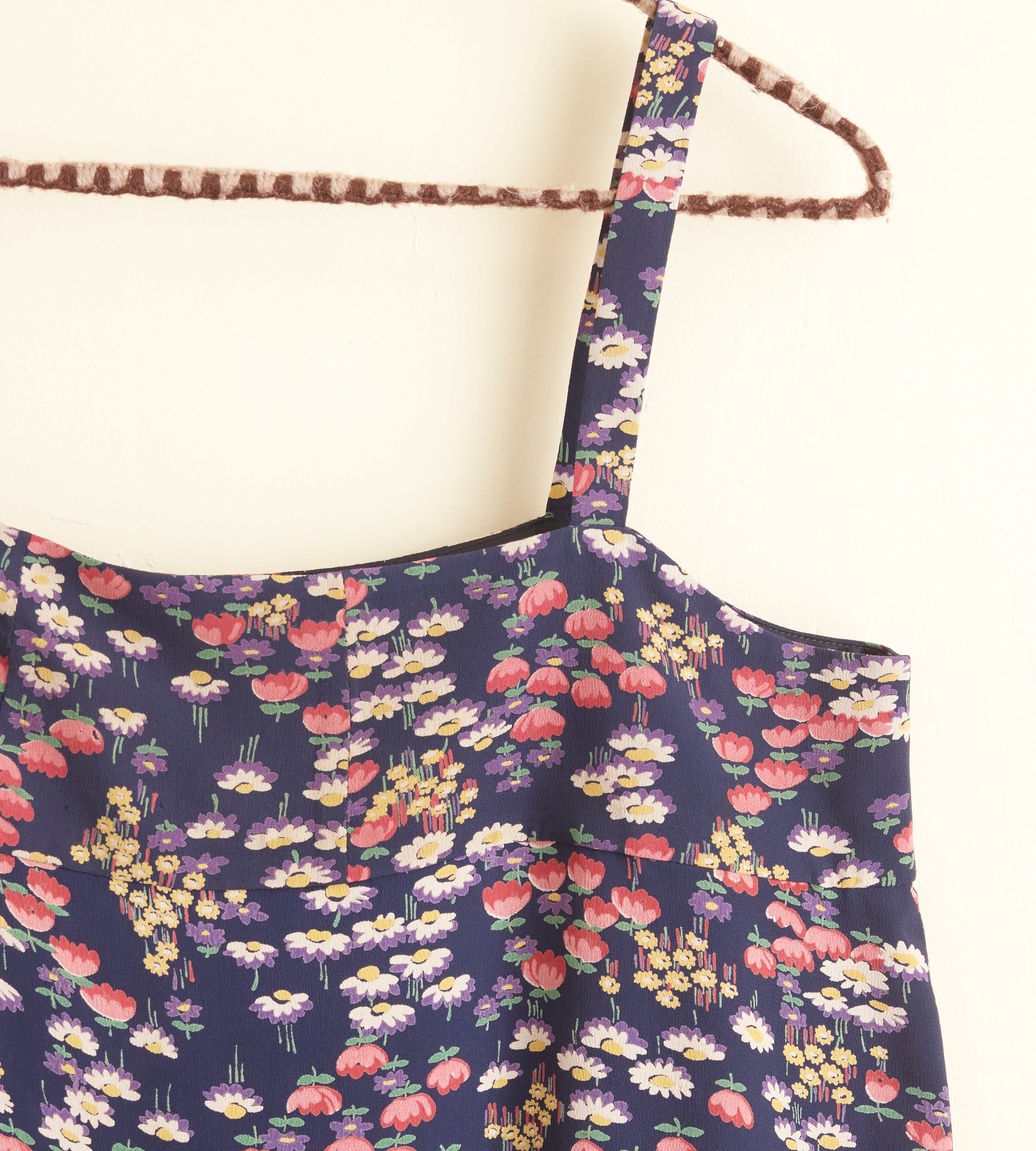 This slip dress is made from deadstock dress fabric from the 1940s, printed with a colorful floral pattern. Hand-mending throughout.