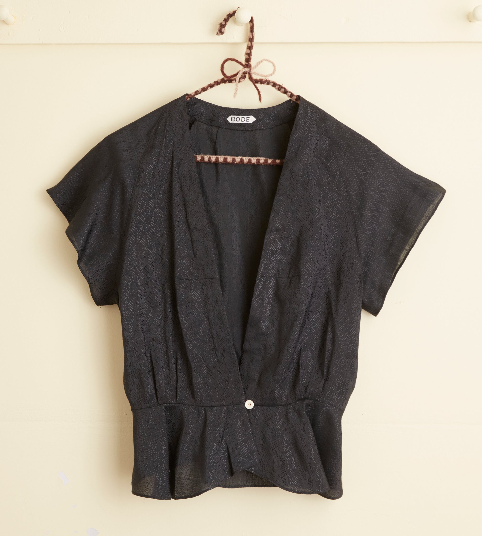 This top is made from a damask tablecloth from the early 20th century, overdyed black. Hand-mending throughout.